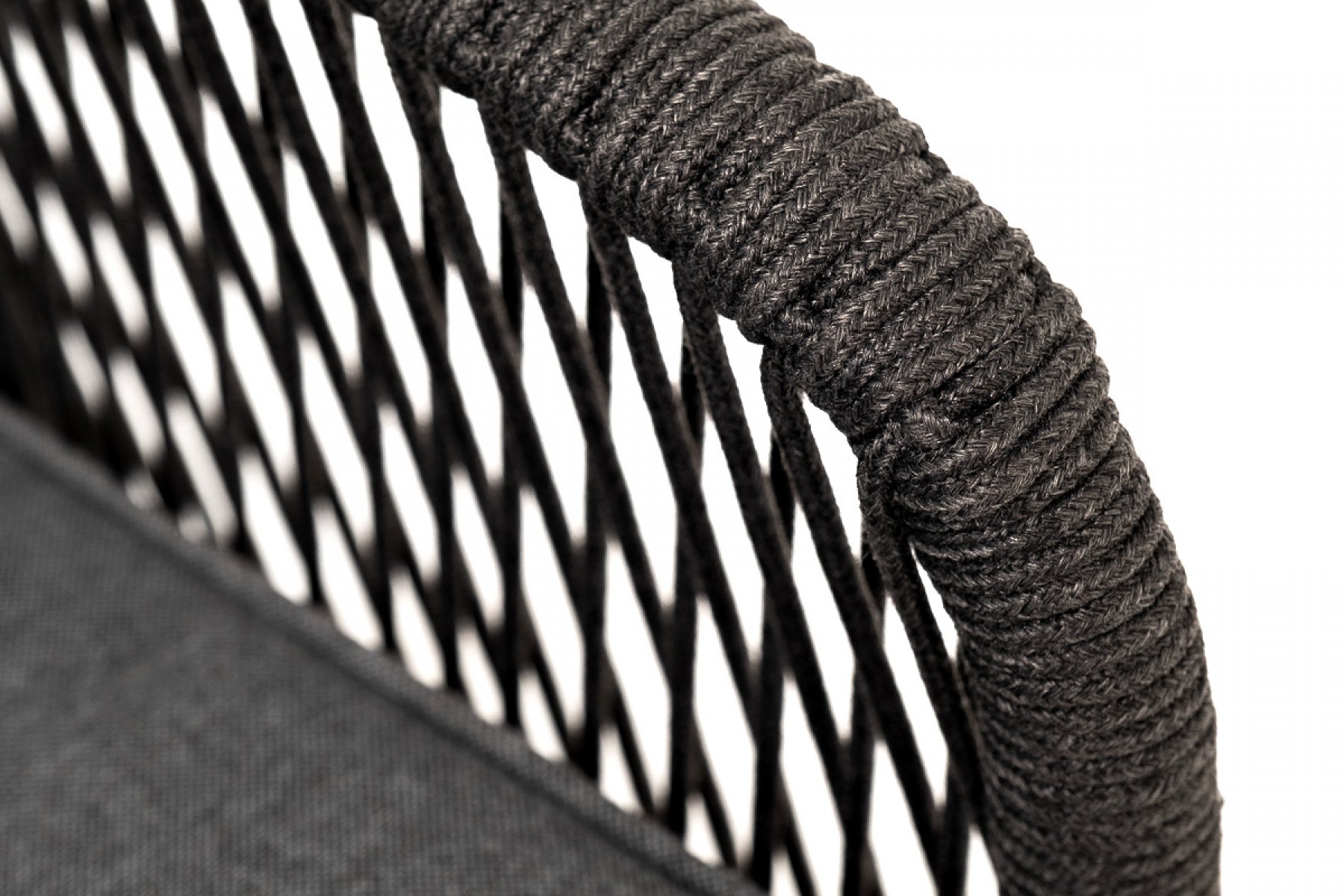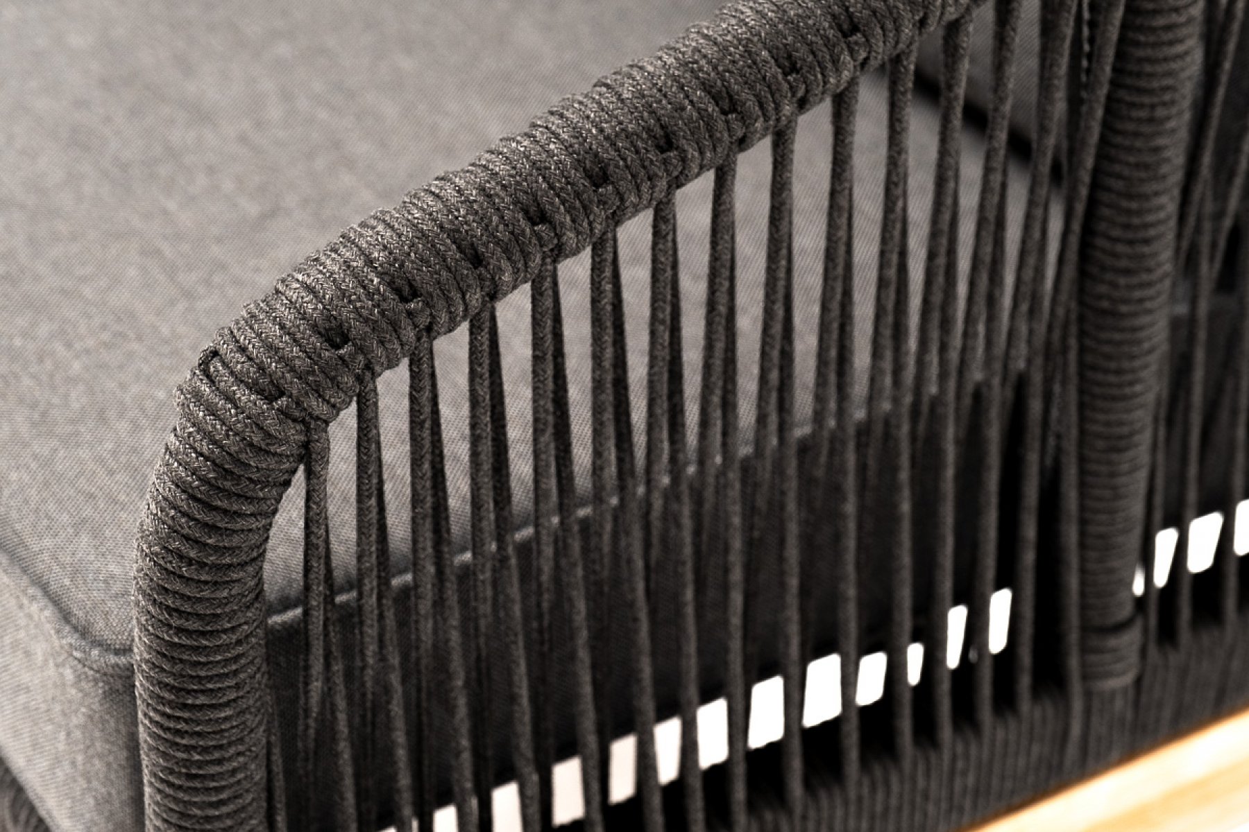 Каркас кресла оплетен синтетическими лентами, выполненных из полиэфирных волокон высокой прочности (роуп). Цвет плетения - темно-серый. Основание - натуральный дуб.