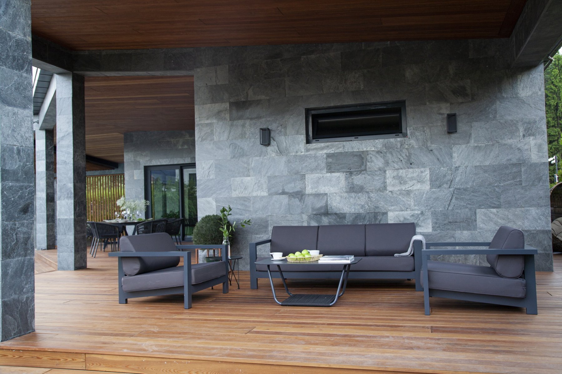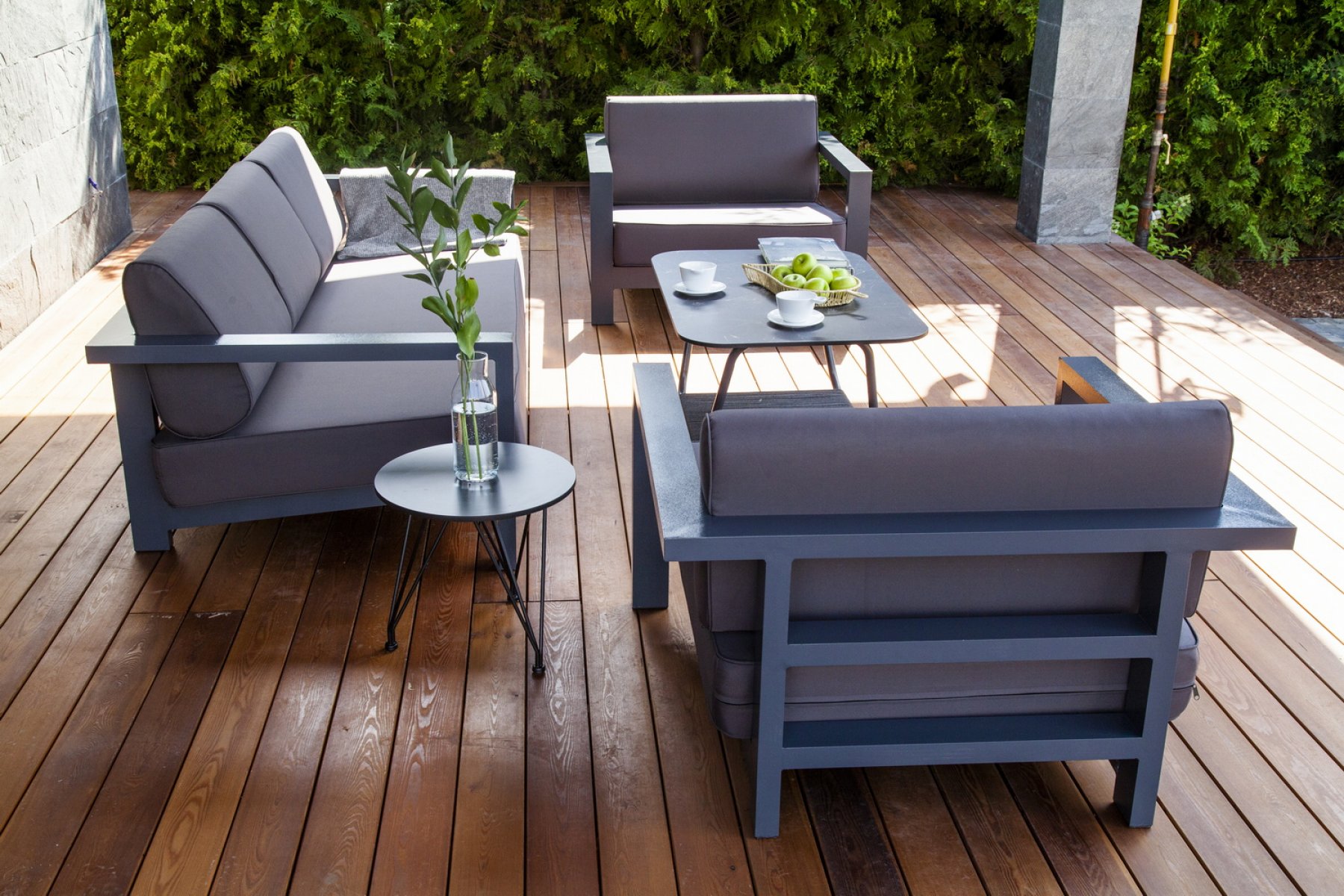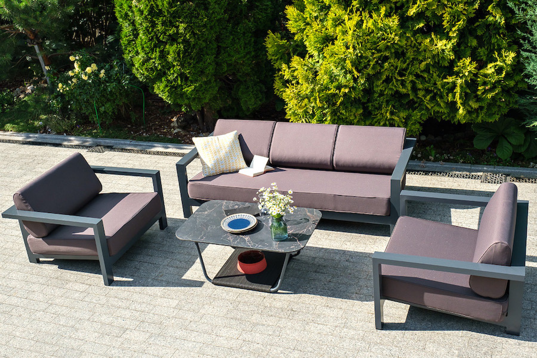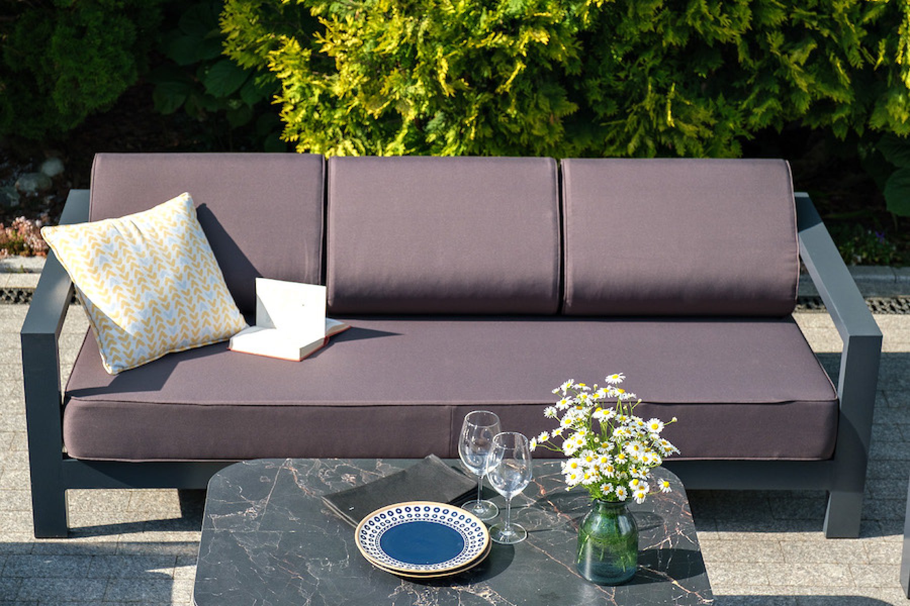 В комплекте предусмотрены мягкие подушки со съёмными чехлами. Диван также подходит для всесезонного использования на открытом воздухе.
