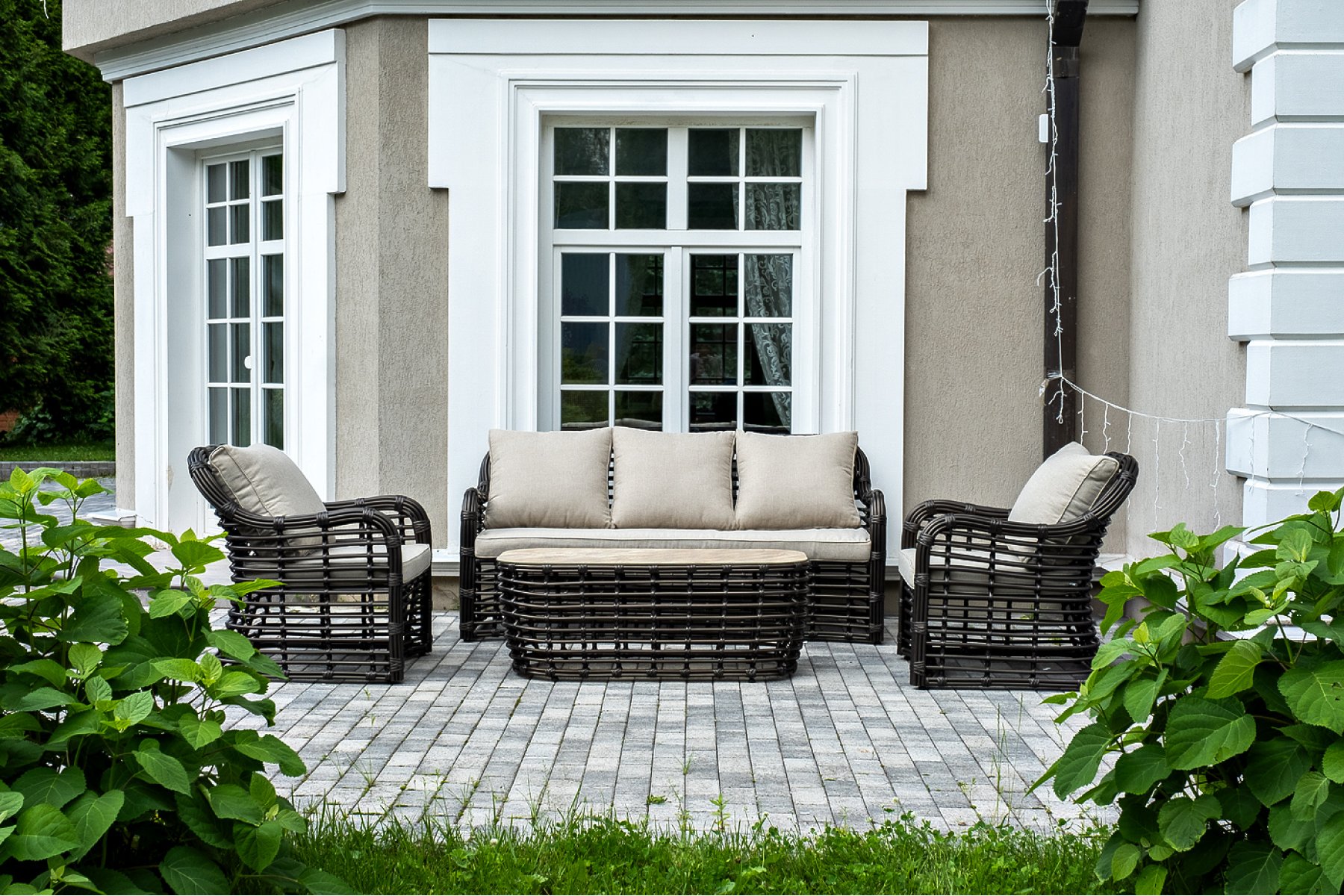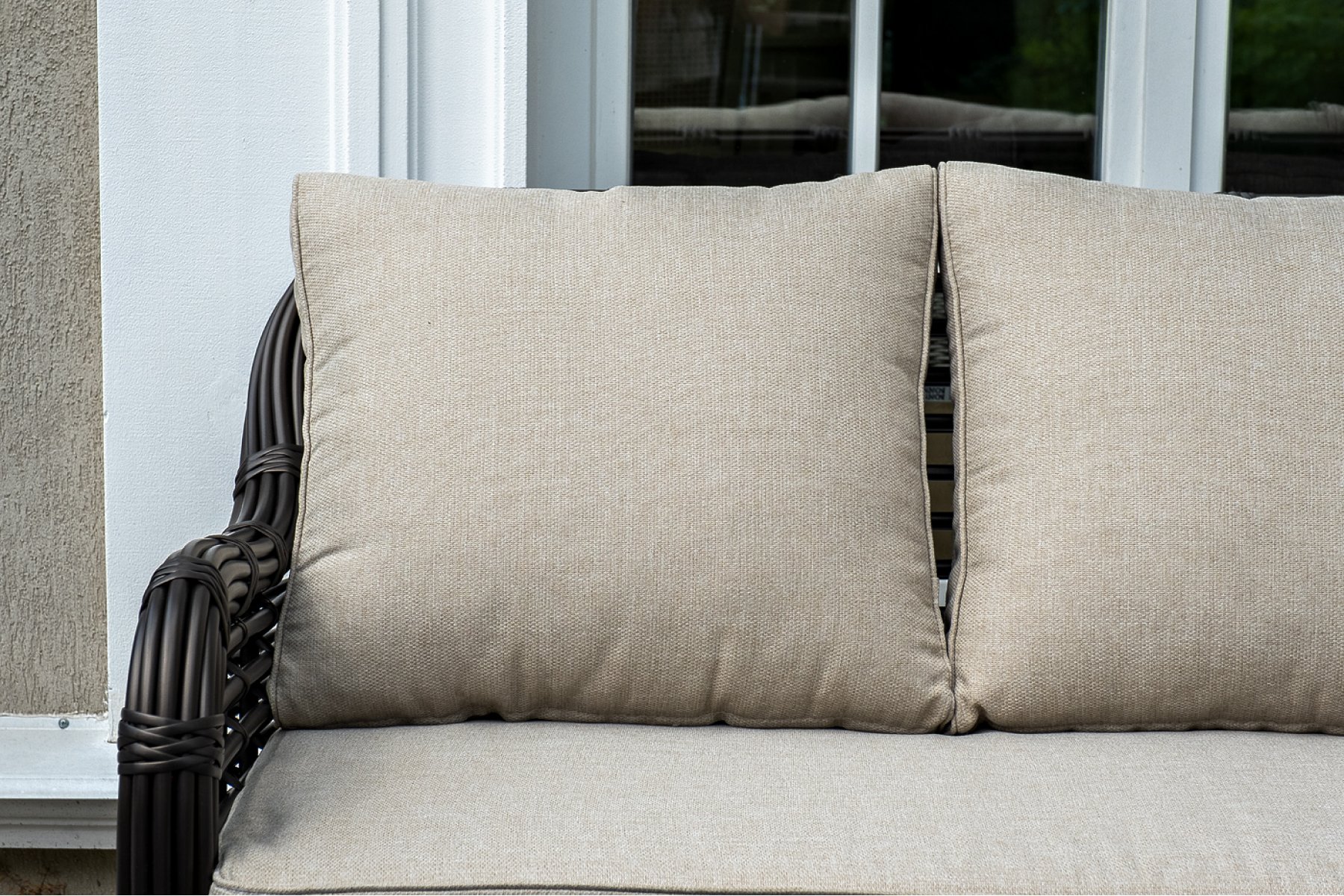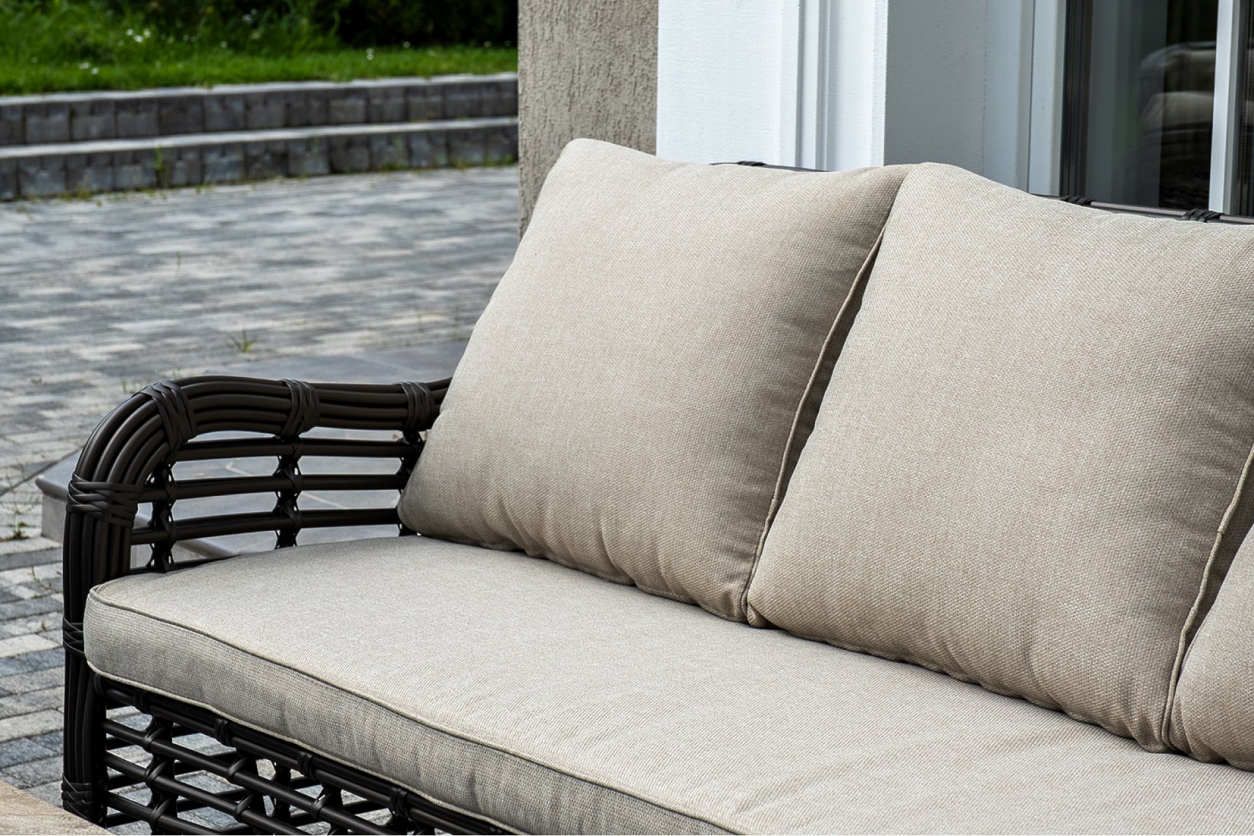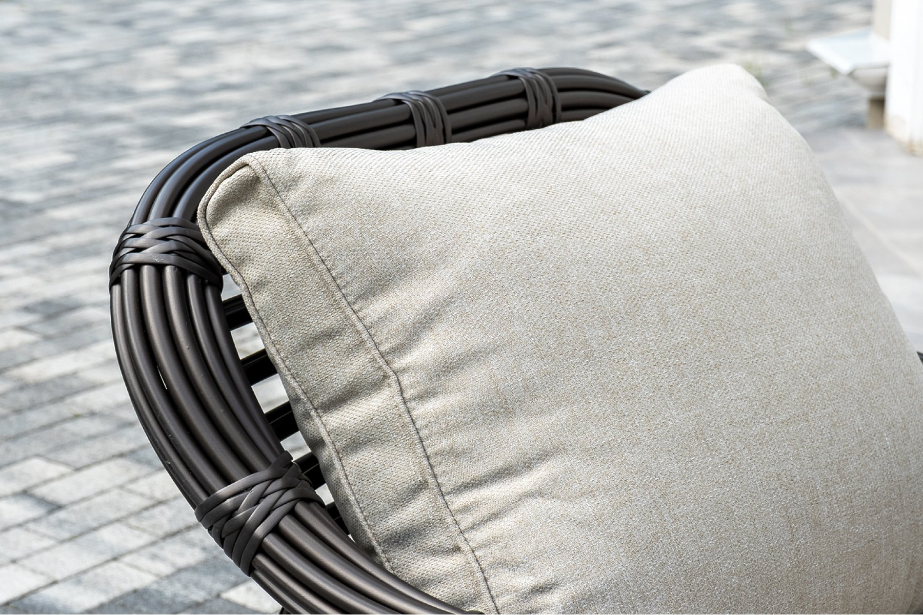 Плетеная мебель дополнена удобными подушками в бежевых чехлах. При их изготовлении используют полиэстер, плотность – 300гр/м2. Он обрабатывается влагоотталкивающей пропиткой для повышения защитных свойств материала.