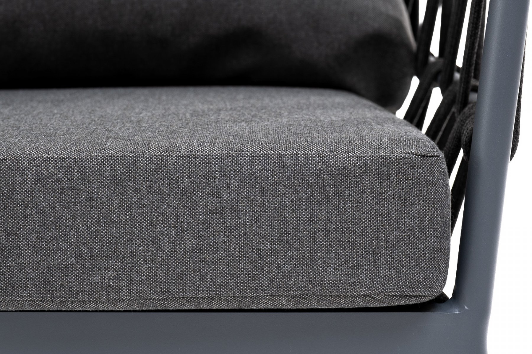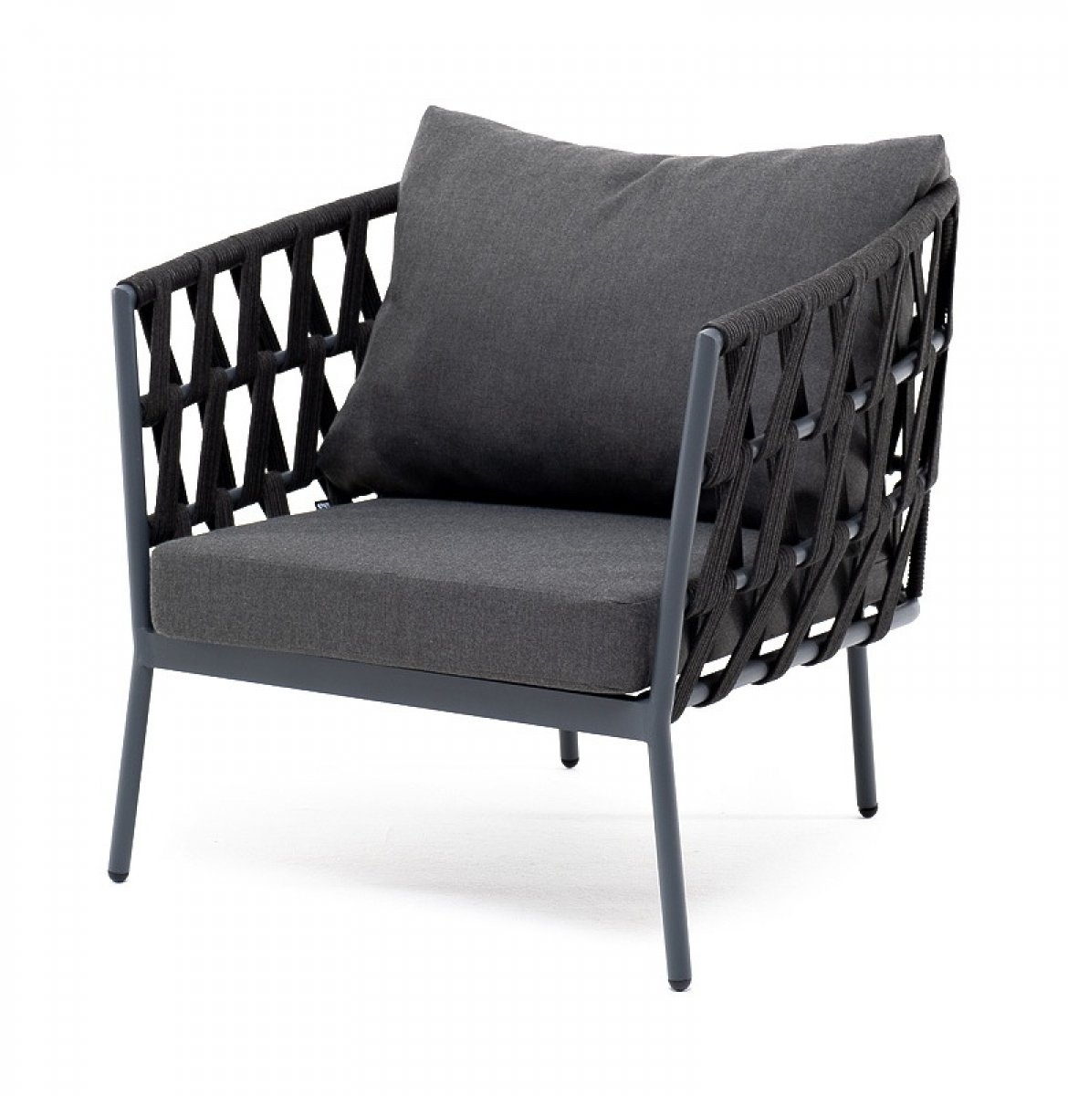Кресло имеет алюминиевый каркас, окрашенный порошковой краской в темно-серый (RAL7024) цвет. Боковины каркаса вручную оплетены роупом - эластичными синтетическими лентами, изготовленными из высокопрочных полиэфирных волокон. Цвет оплетки - темно-серый.