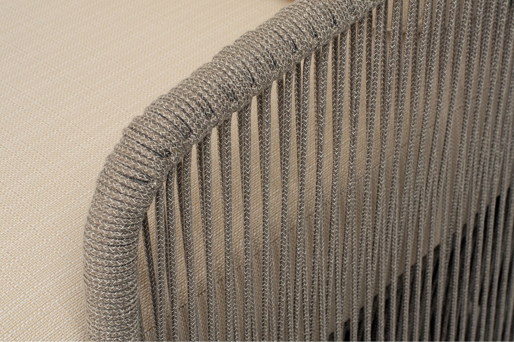Каркас кресла изготовлен из прочного алюминиевого сплава и окрашен в светло-серый (RAL7035) цвет, который предотвращает возникновение коррозии и обеспечивает долгий срок службы. На боковинах кресла выполнена оплетка из роупа цвета серый меланж. Такое плетение обладает высок