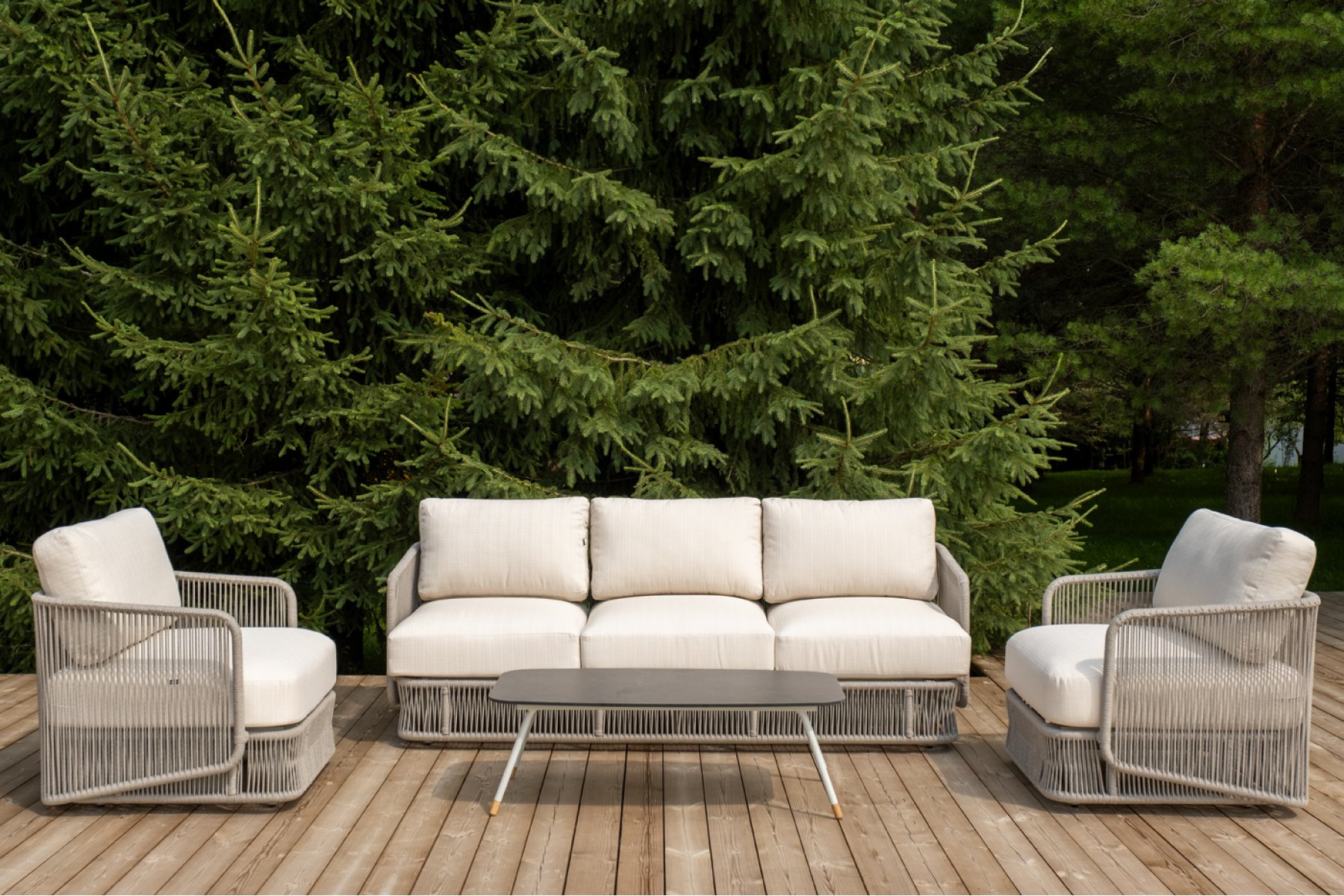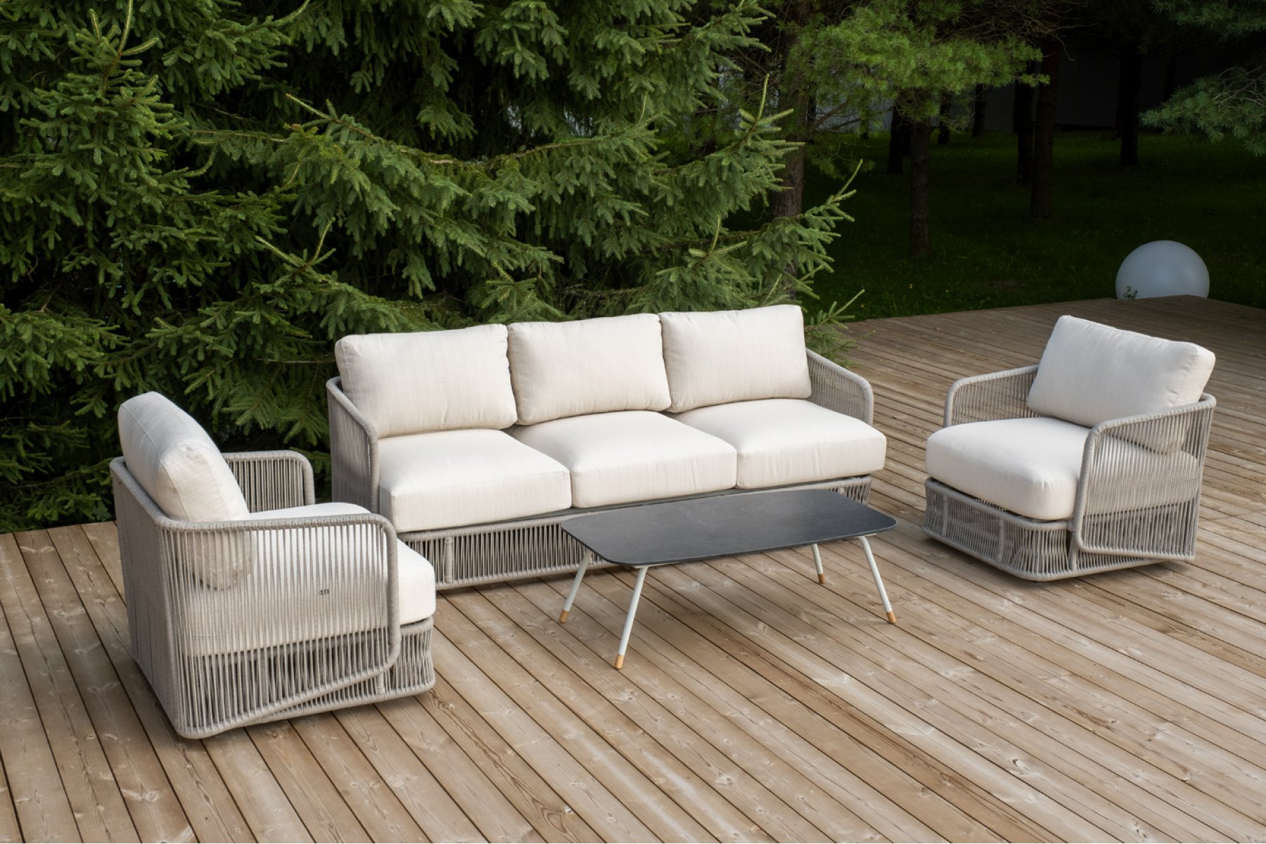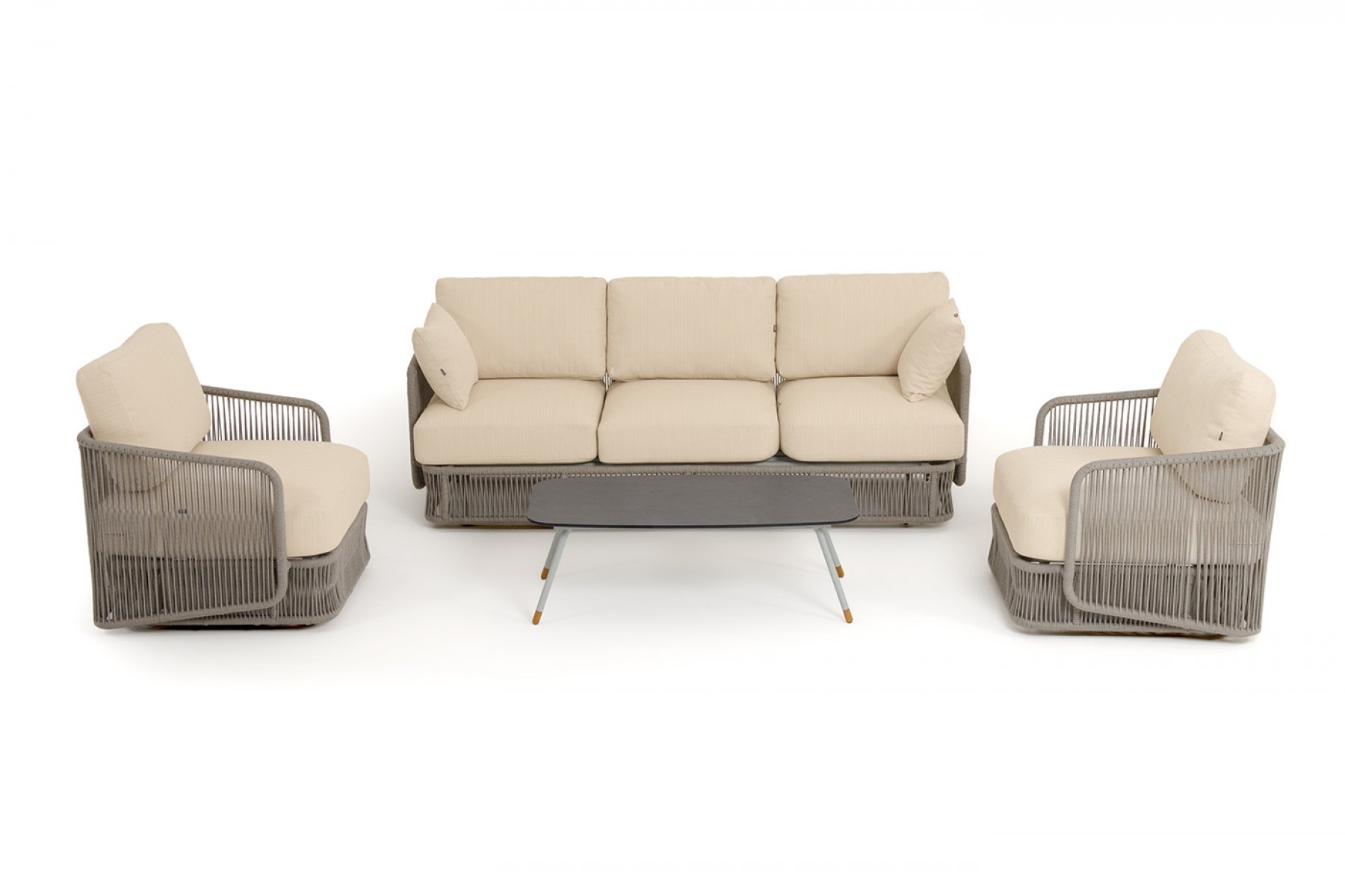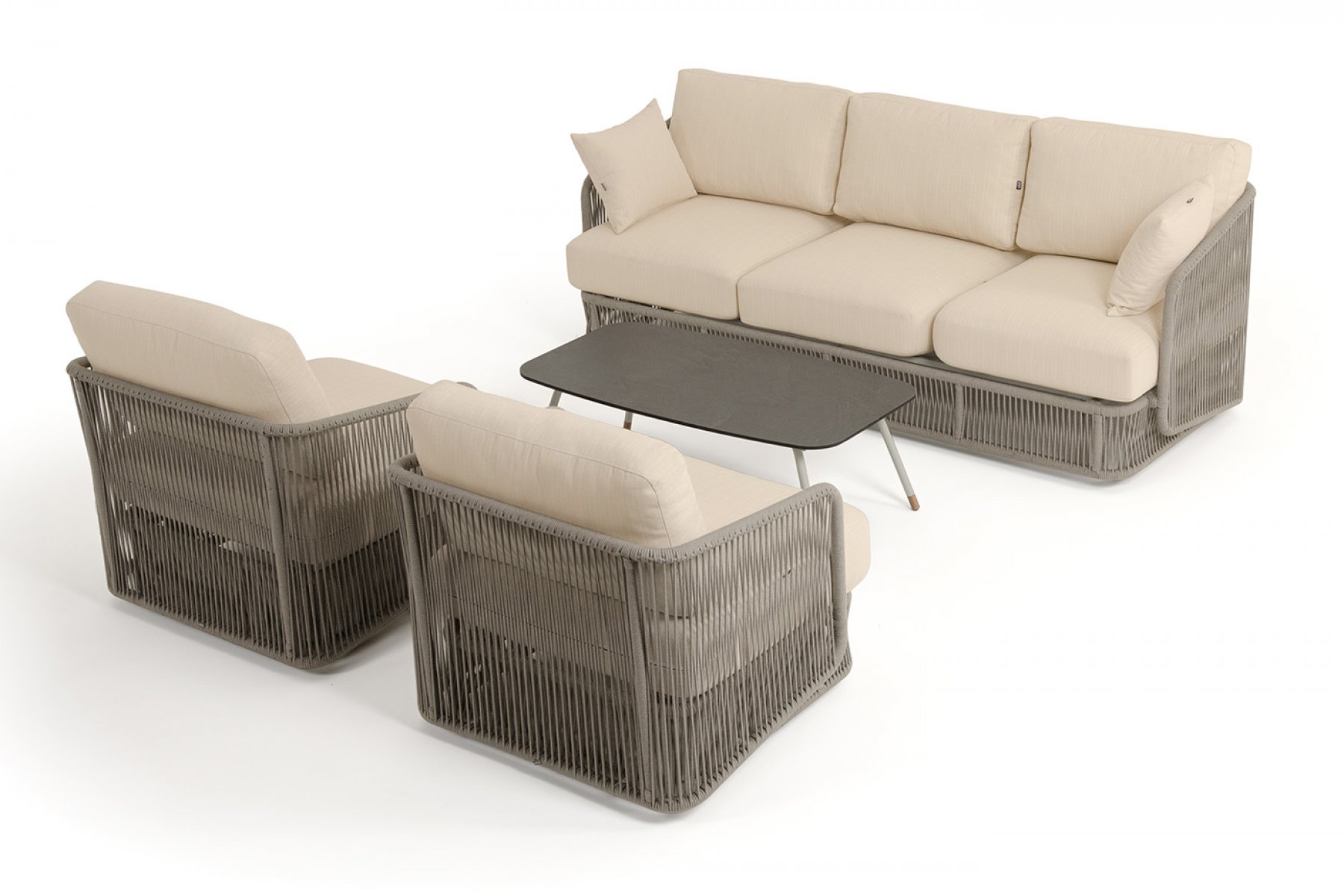 Кресла и диван идут в комплекте с мягкими подушками в чехлах бежево "Альбано" диван 3-местный плетеный из роупа, каркас алюминий светло-серый (RAL7035) муар, роуп серый меланж круглый, ткань Mossle светло-бежевая 1шт. 2 320Х865Х780, "Альбано" кресло плетеное из роупа, каркас алюминий светло-серый (RAL7035) муар, роуп серый меланж круглый, ткань Mossle светло-бежевая 2шт. 920Х865Х750, "Верона" журнальный стол из HPL 120х65, H40, каркас светло-серый (RA L7035) муар, цвет столешницы "серый гранит" 1шт. 1 200Х650Х400,