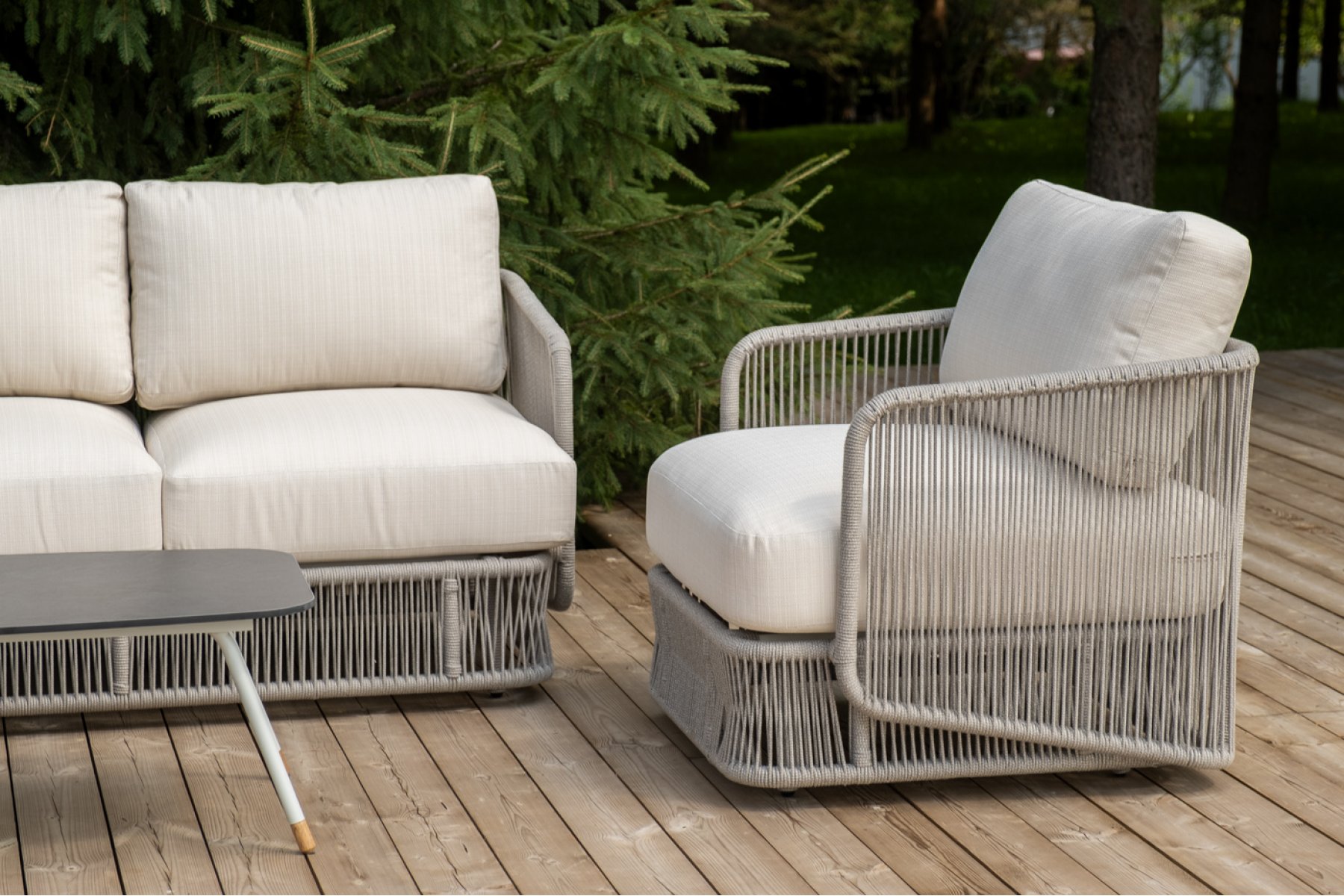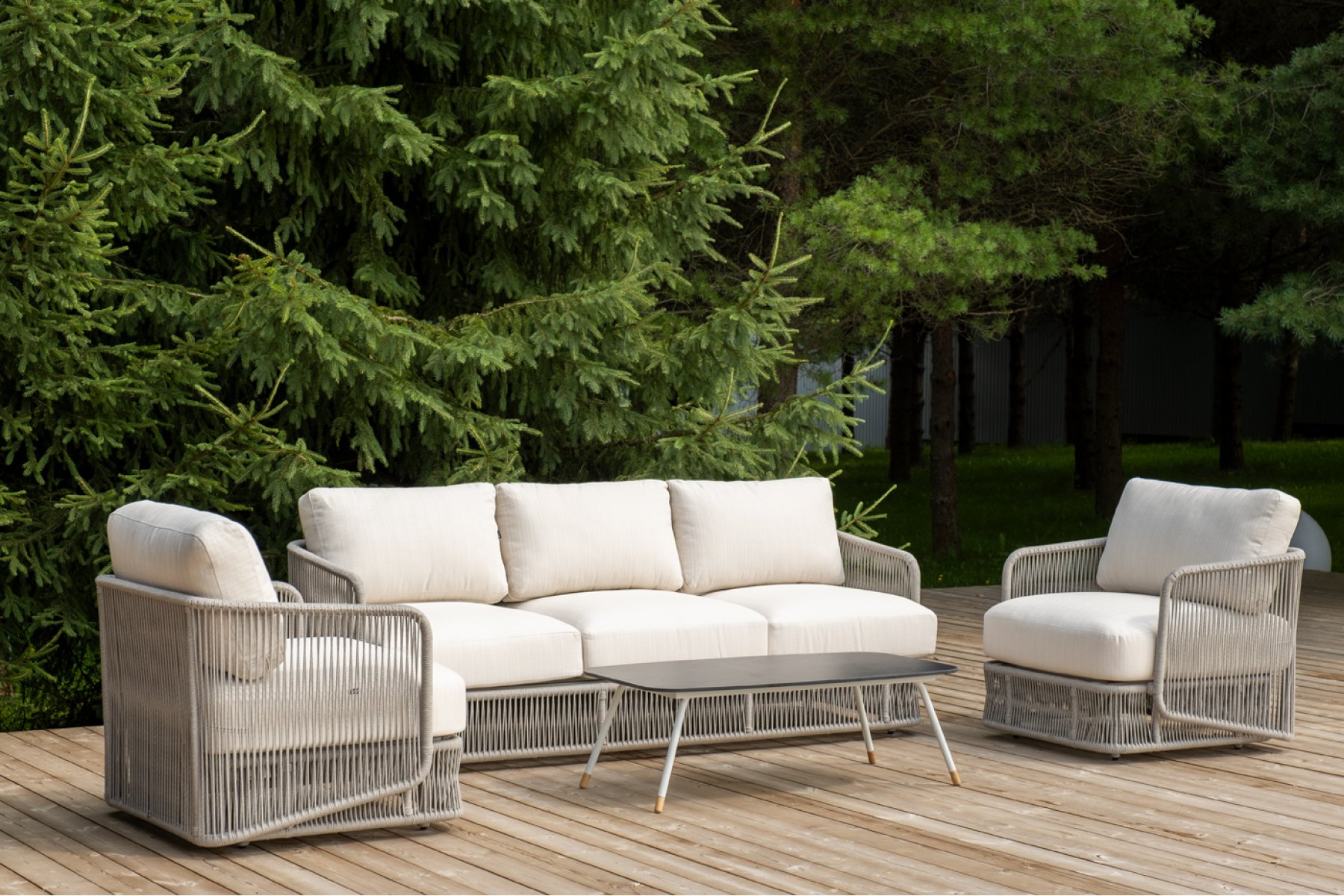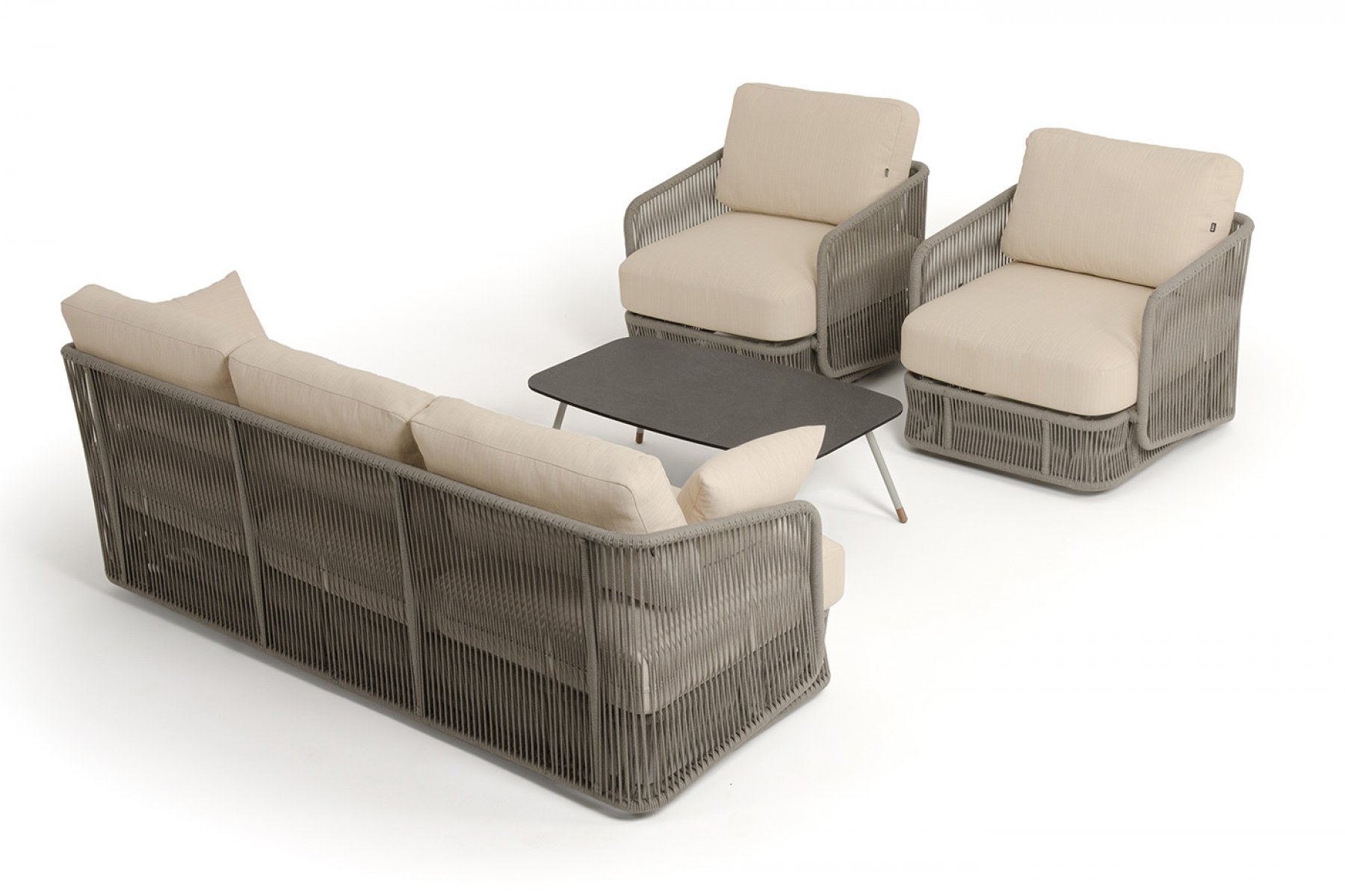 Кресла и диван идут в комплекте с мягкими подушками в чехлах бежево "Альбано" диван 3-местный плетеный из роупа, каркас алюминий светло-серый (RAL7035) муар, роуп серый меланж круглый, ткань Mossle светло-бежевая 1шт. 2 320Х865Х780, "Альбано" кресло плетеное из роупа, каркас алюминий светло-серый (RAL7035) муар, роуп серый меланж круглый, ткань Mossle светло-бежевая 2шт. 920Х865Х750, "Верона" журнальный стол из HPL 120х65, H40, каркас светло-серый (RA L7035) муар, цвет столешницы "серый гранит" 1шт. 1 200Х650Х400,