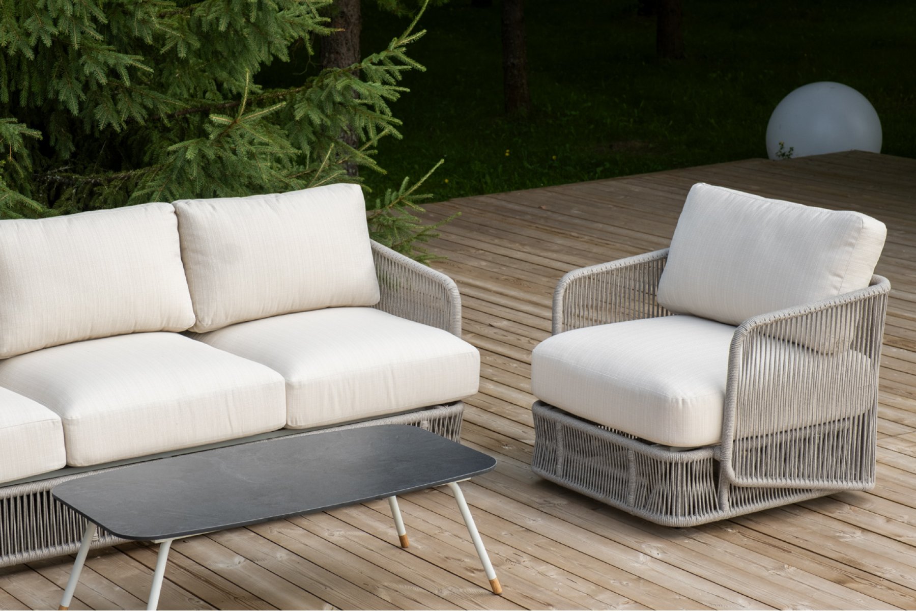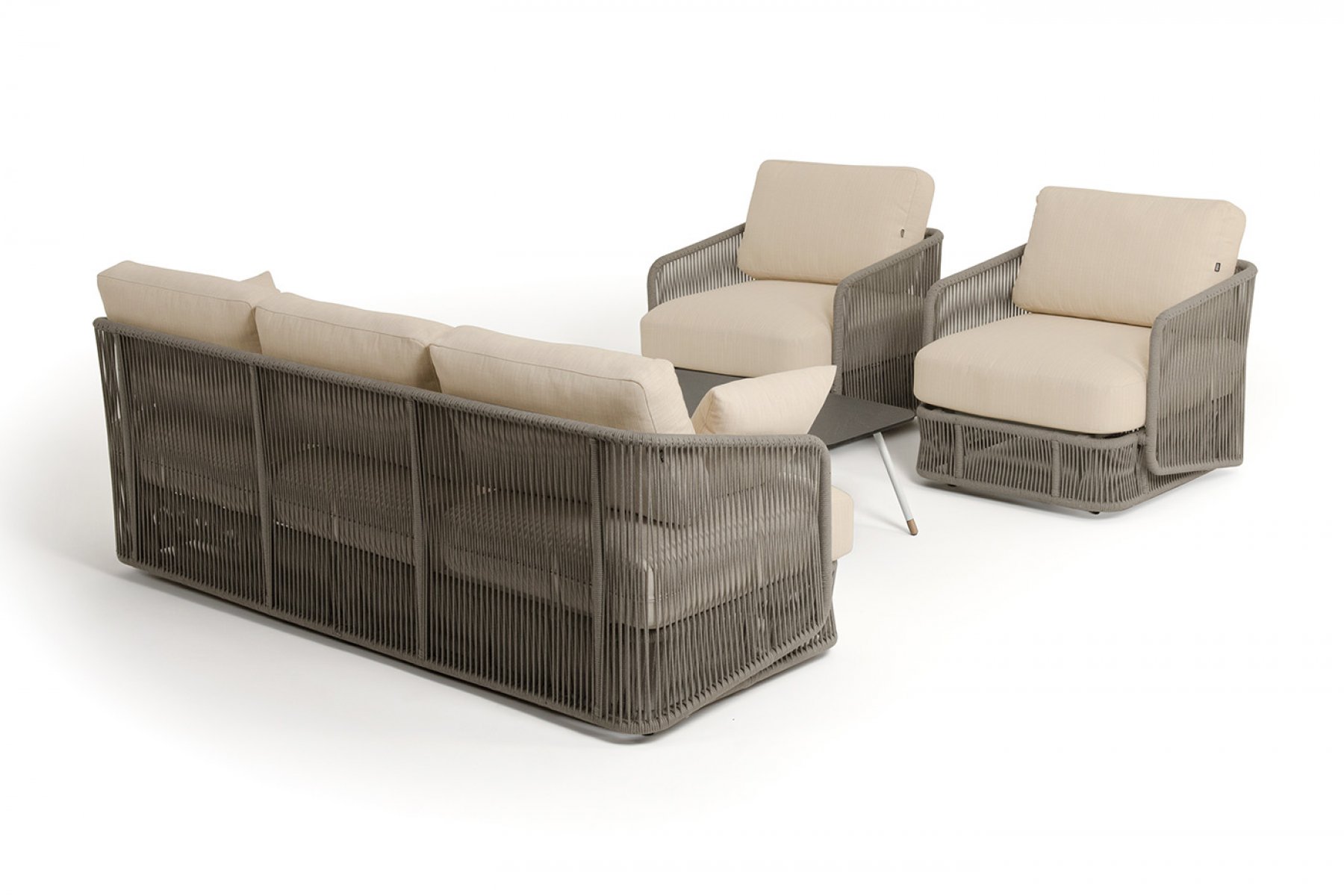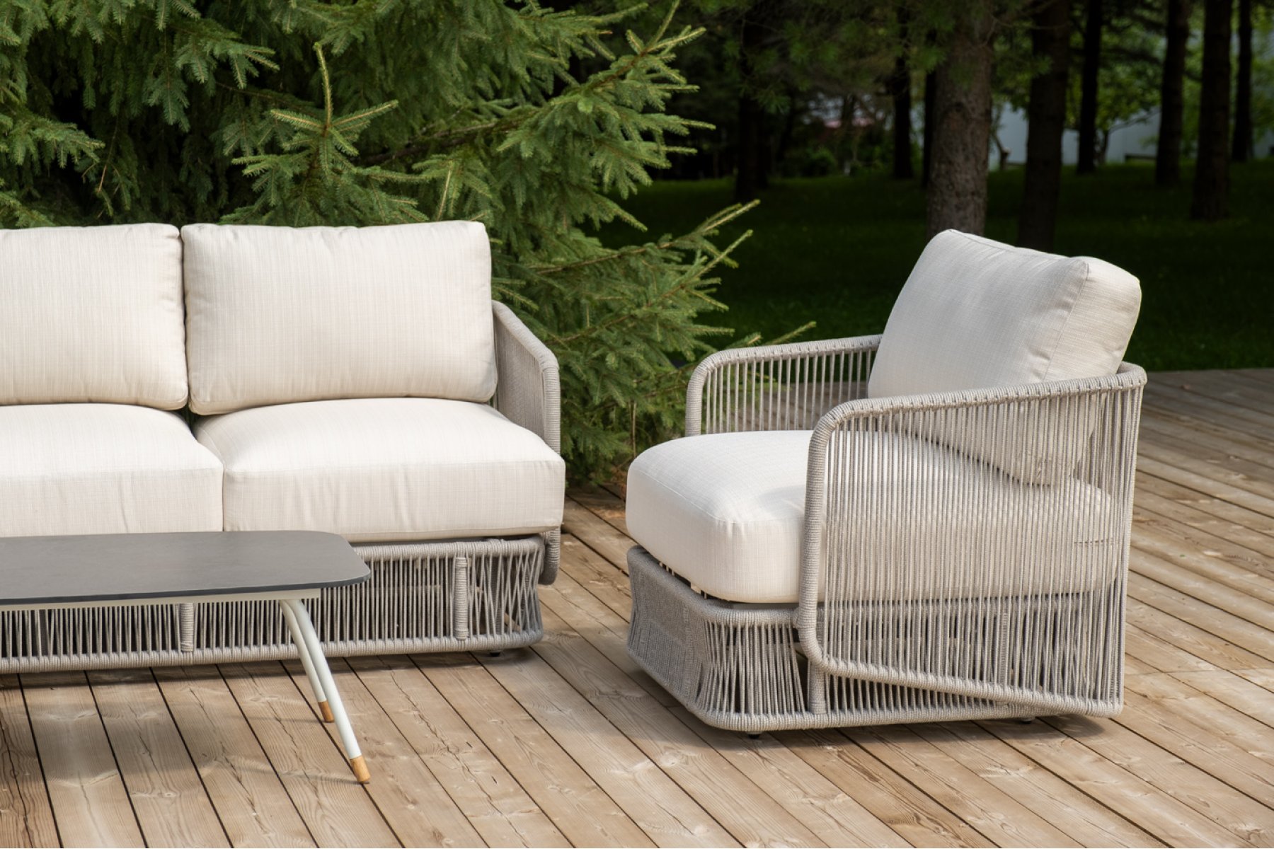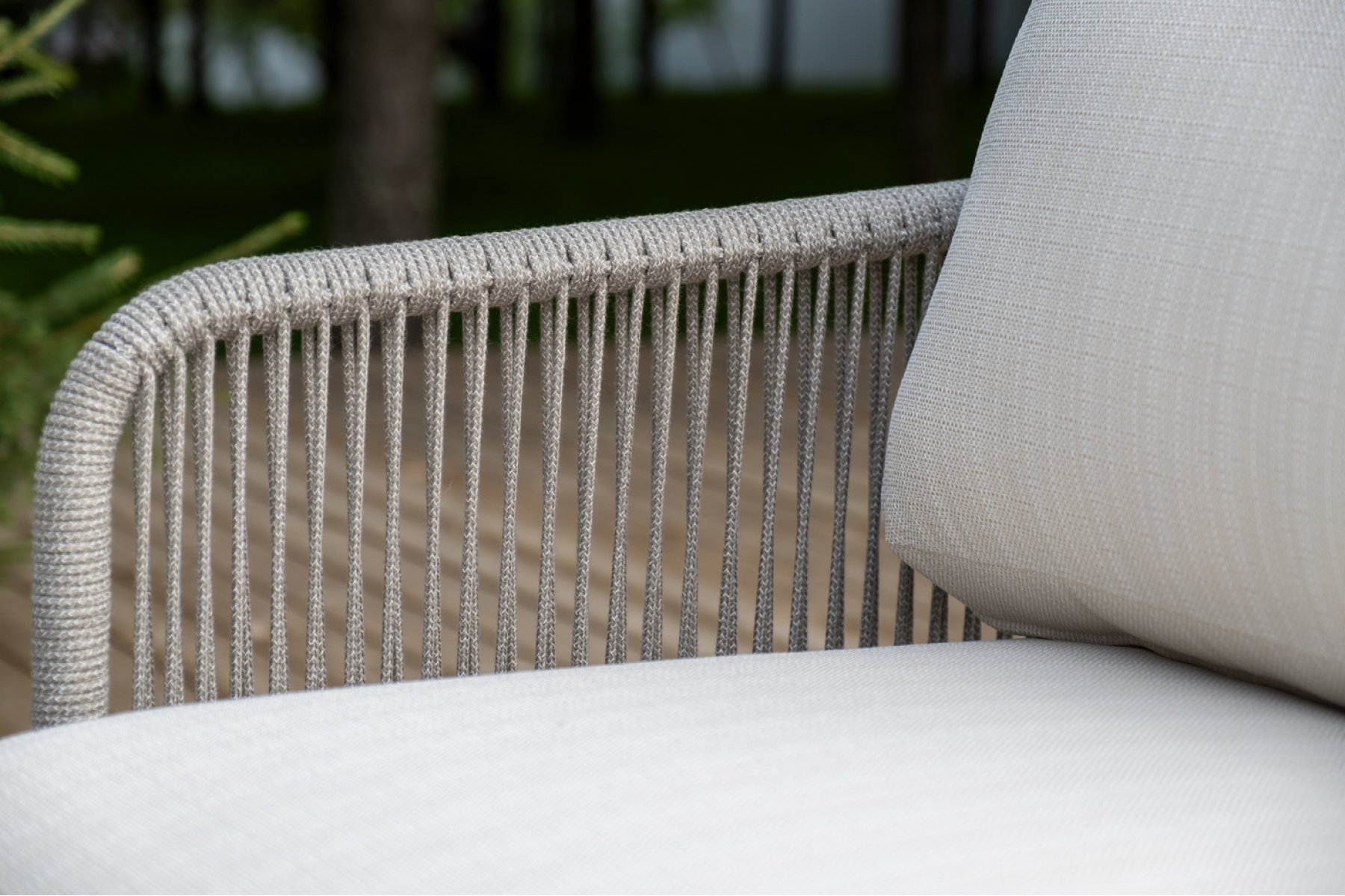 Кресла и диван идут в комплекте с мягкими подушками в чехлах бежево "Альбано" диван 3-местный плетеный из роупа, каркас алюминий светло-серый (RAL7035) муар, роуп серый меланж круглый, ткань Mossle светло-бежевая 1шт. 2 320Х865Х780, "Альбано" кресло плетеное из роупа, каркас алюминий светло-серый (RAL7035) муар, роуп серый меланж круглый, ткань Mossle светло-бежевая 2шт. 920Х865Х750, "Верона" журнальный стол из HPL 120х65, H40, каркас светло-серый (RA L7035) муар, цвет столешницы "серый гранит" 1шт. 1 200Х650Х400,