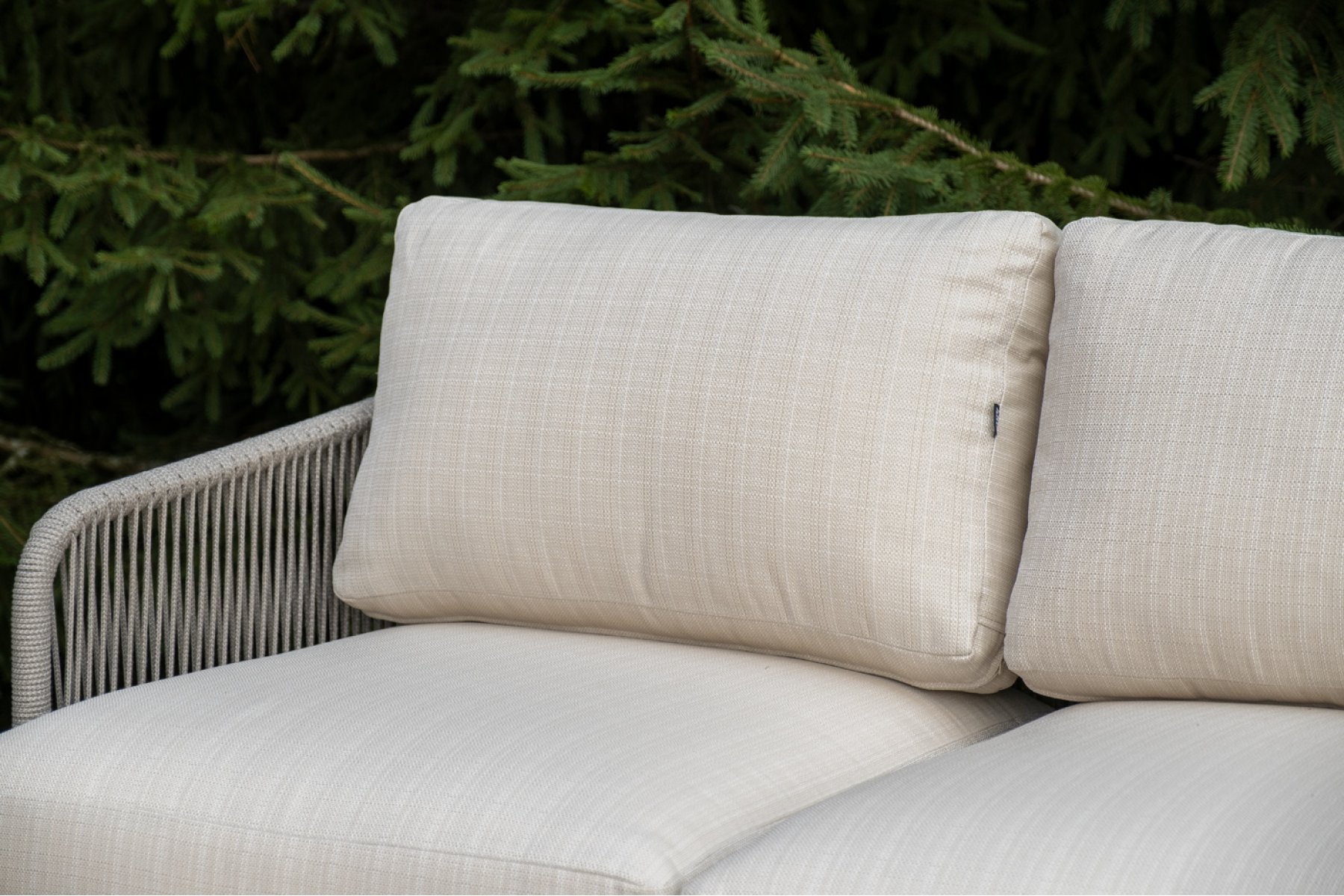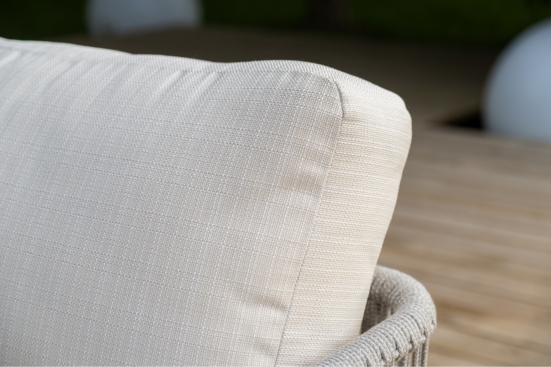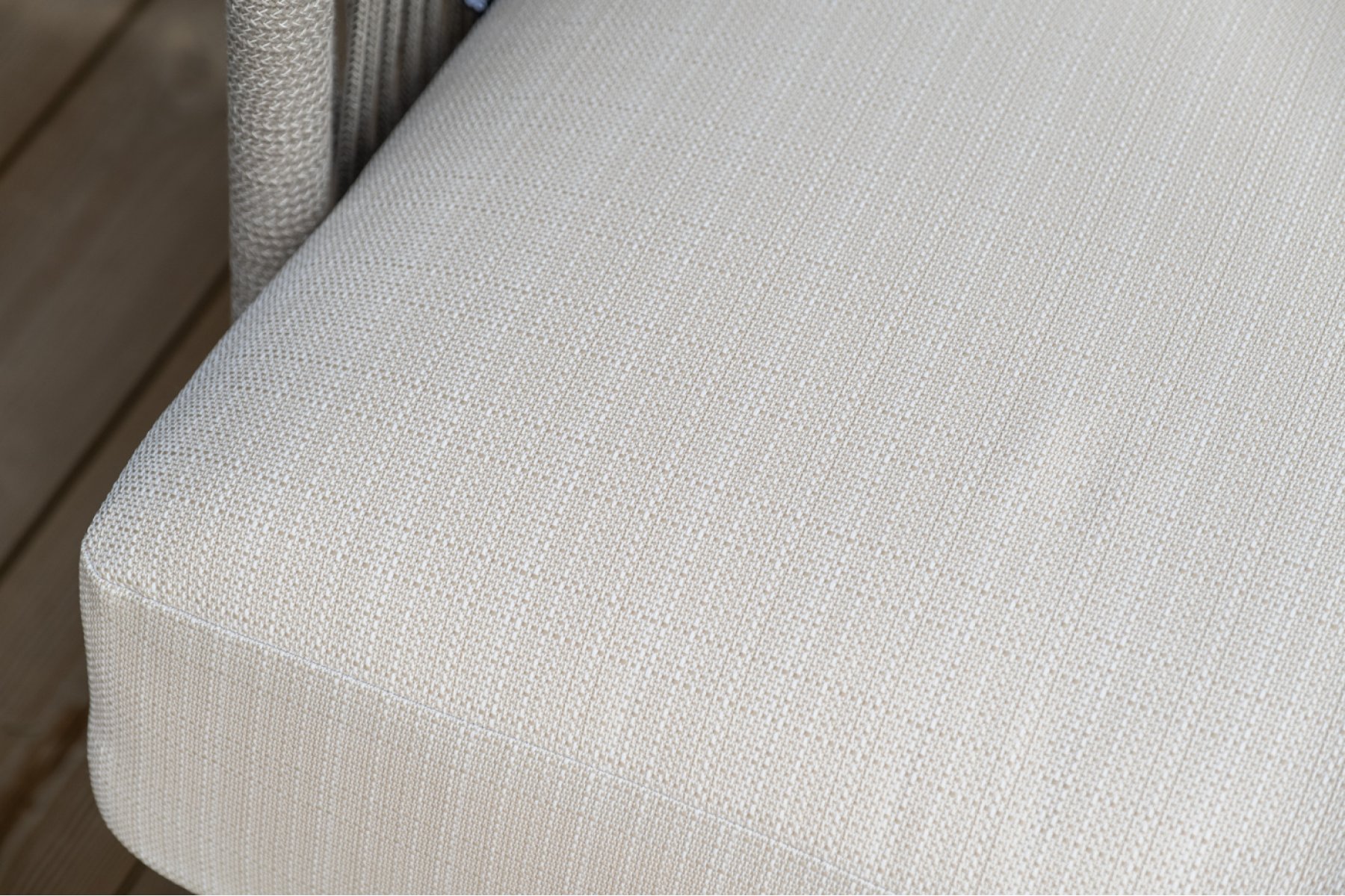 Каркас уличной мебели выполнен из износостойкого алюминия. Его дополняет бежевая ручная оплетка, изготовленная на основе эластичных синтетических лент из полиэфирных волокон высокой прочности (роупа).