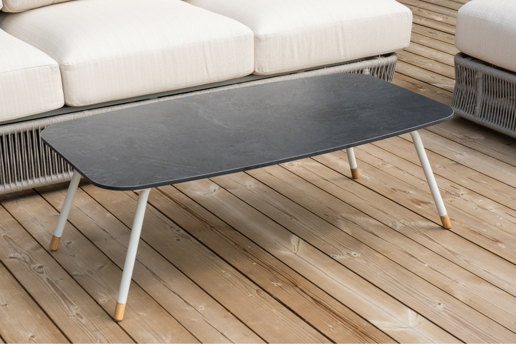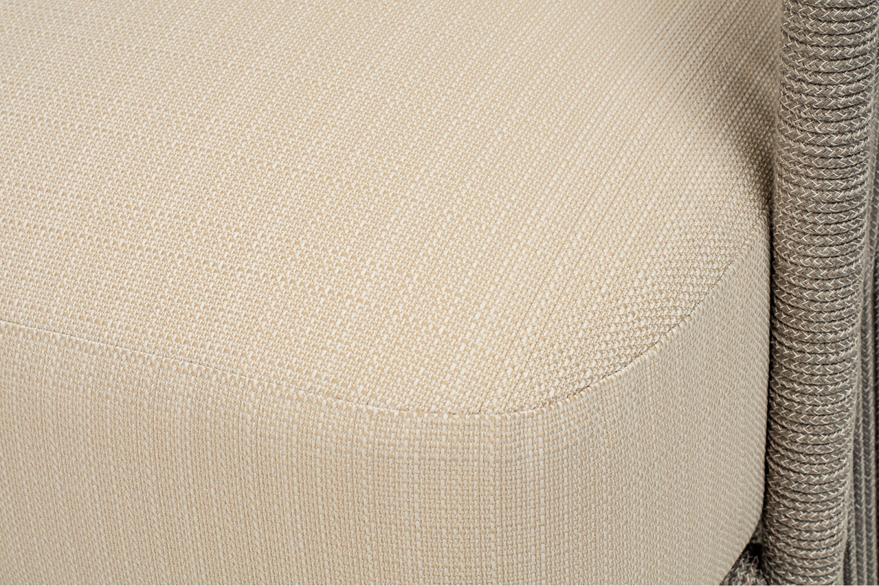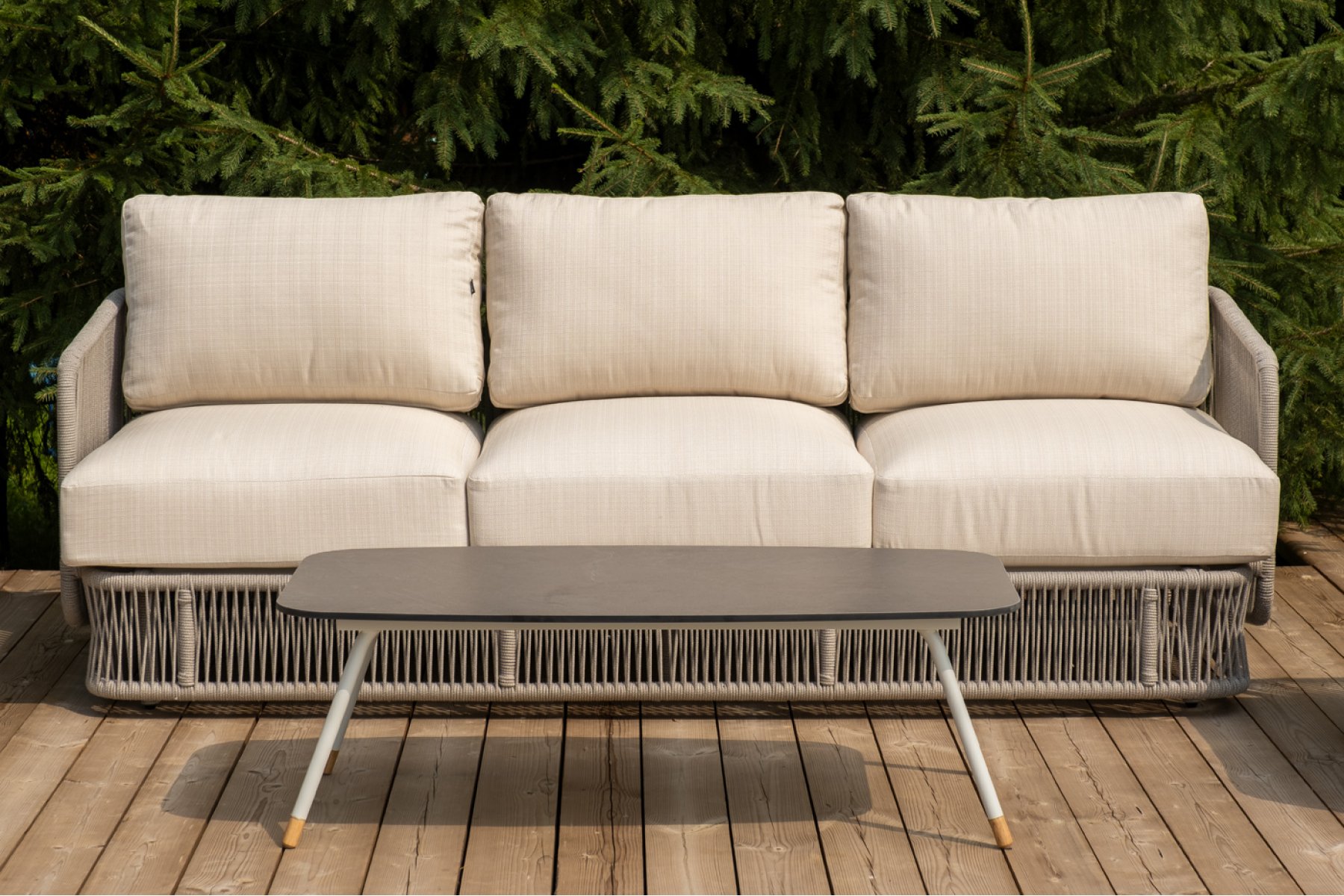 Каркас уличной мебели выполнен из износостойкого алюминия. Его дополняет бежевая ручная оплетка, изготовленная на основе эластичных синтетических лент из полиэфирных волокон высокой прочности (роупа).