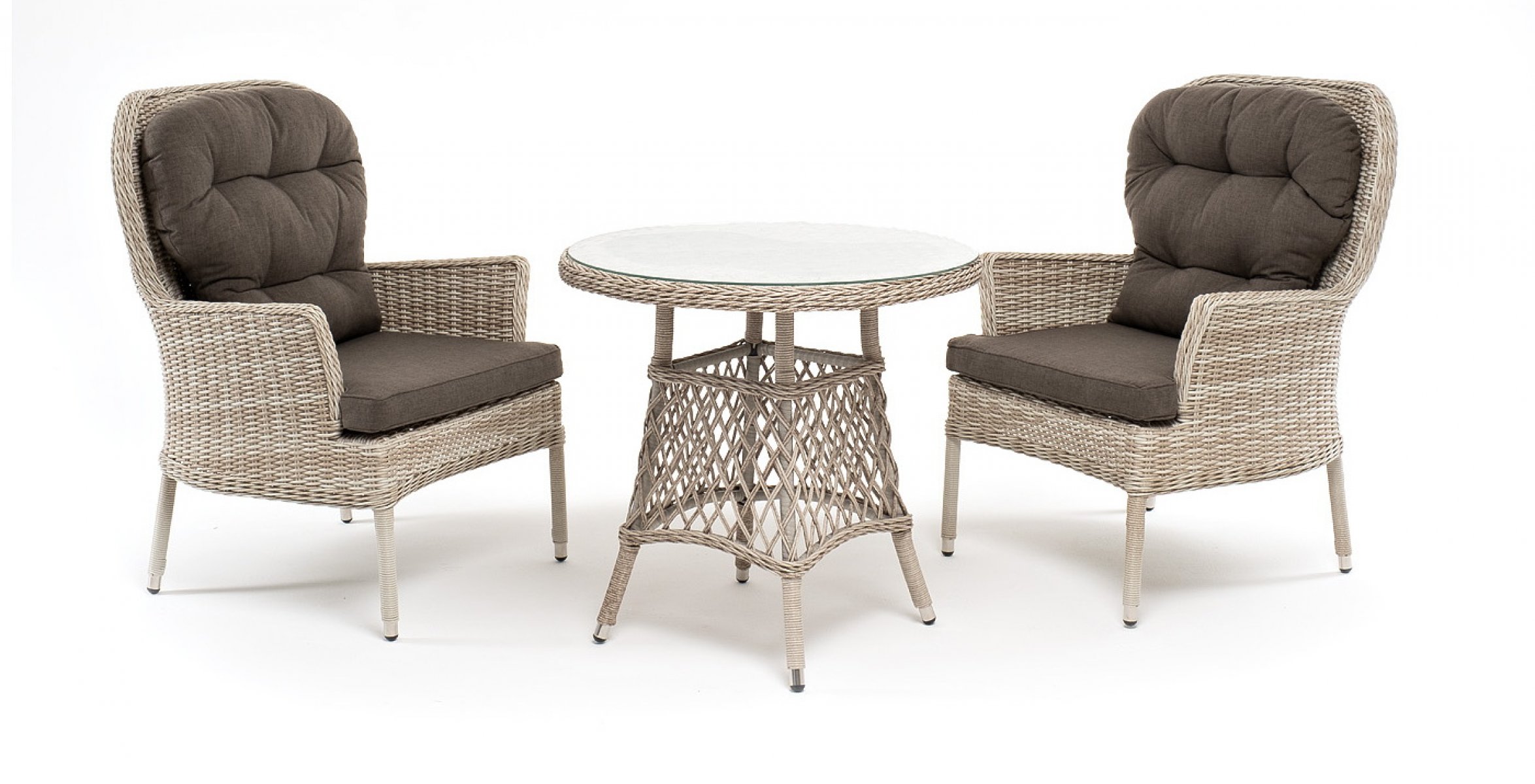 Плетение выполнено вручную круглым искусственным ротангом бежевого цвета, кресло укомплектовано подушками из 100% полиэстера, которые пропитаны специальным составом, обладающим влаго "Эспрессо" плетеный круглый стол, диаметр 80 см, цвет бежевый 1шт. 800Х800Х750, "Алиса" кресло плетеное, цвет бежевый с подушками 2шт. 710Х820Х1 105,