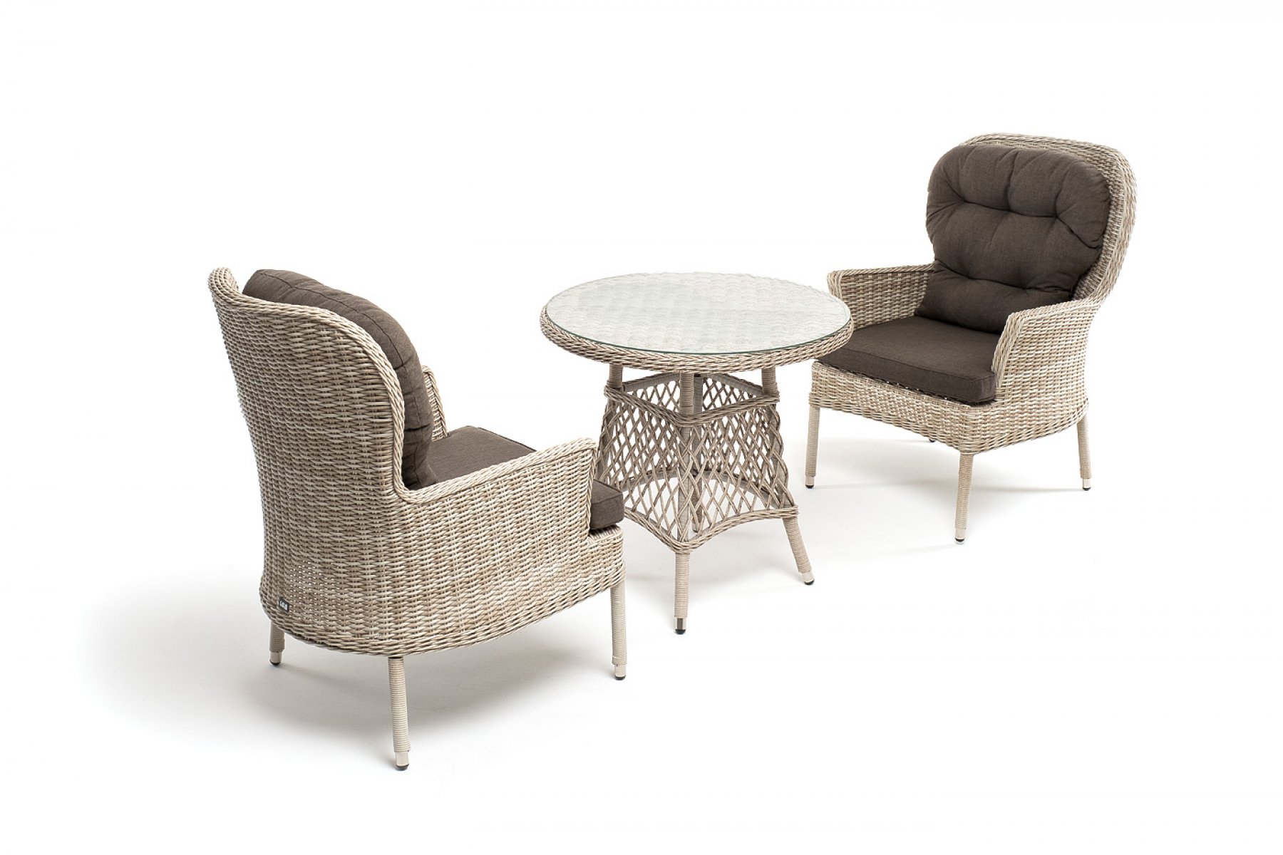 Кофейный комплект «Алиса» рассчитан на 2 персоны и подходит для расположения на балконе, в небольших гостиных, на террасе и других местах с ограниченным пространством. В основе каркас из алюминия.