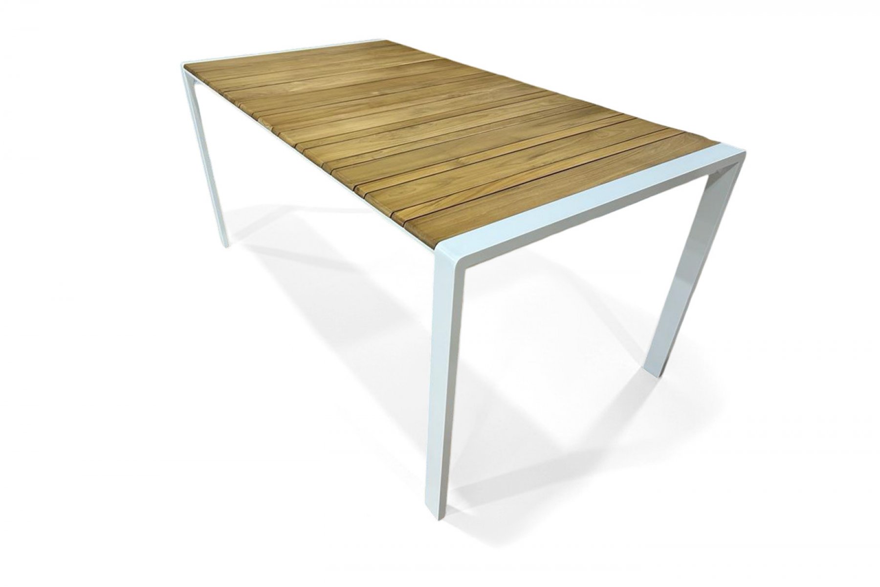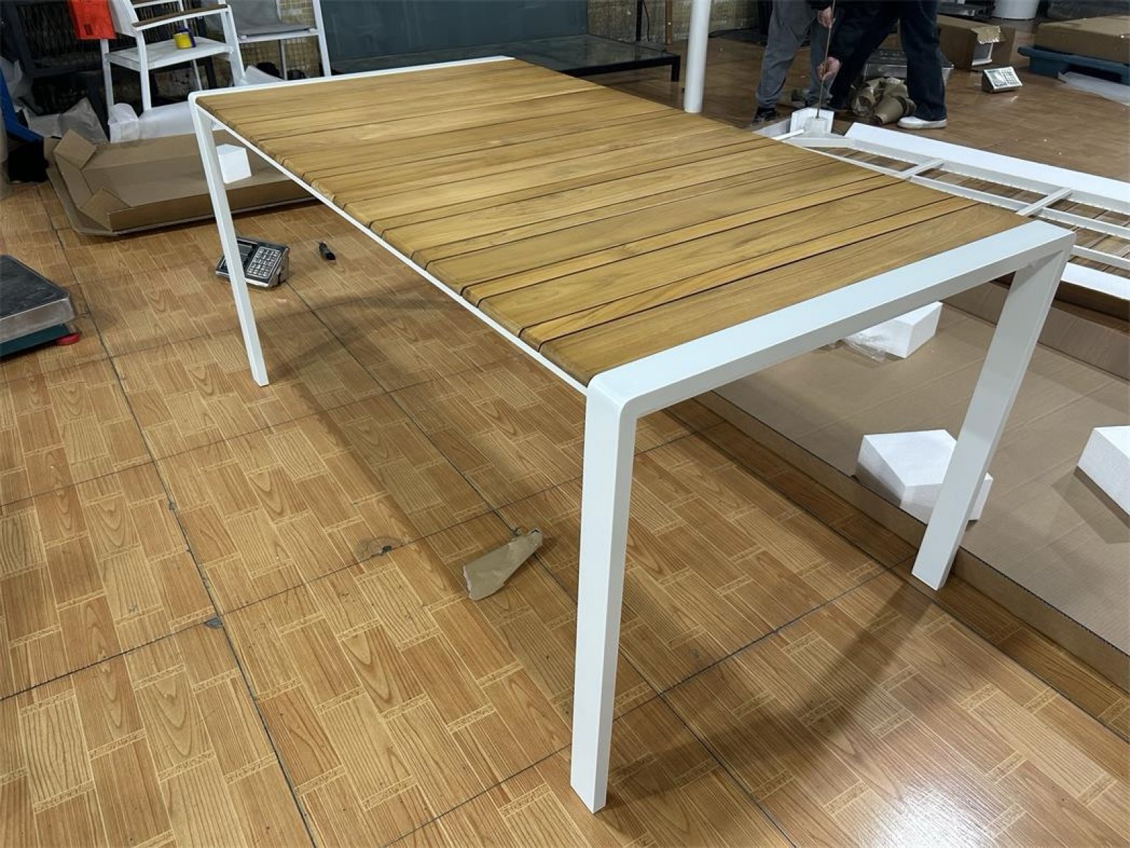 Обеденный стол «Альпы» с тиковой столешницей и алюминиевым каркасом — сочетание природной эстетики и современных инженерных решений.