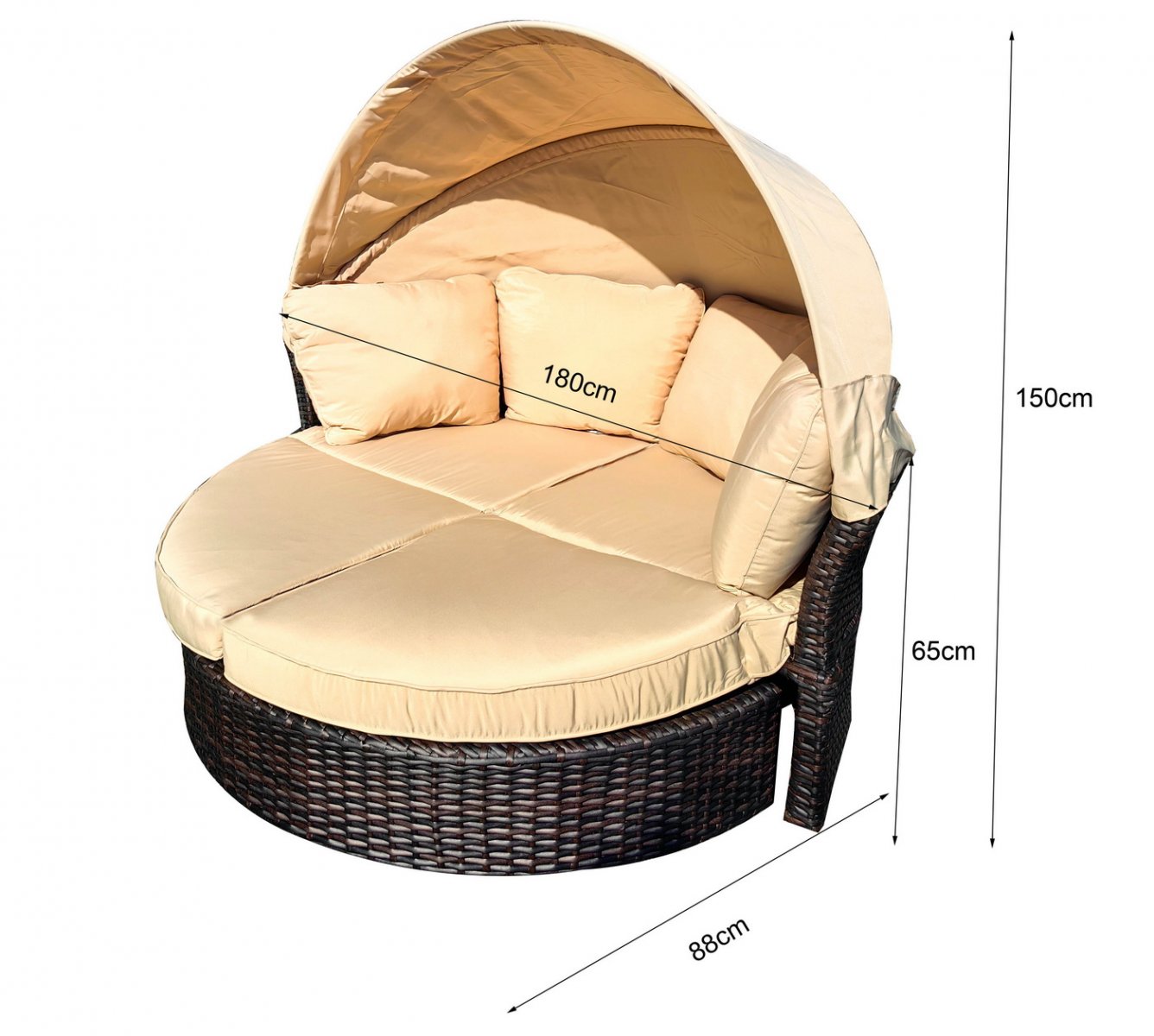 Конструкция отличается надёжностью: в основе — прочный стальной каркас, вручную оплетённый плоским искусственным ротангом. Для комфорта предусмотрена защитная функция — козырёк из 100% полиэстера, который ограничивает попадание прямых солнечных лучей.