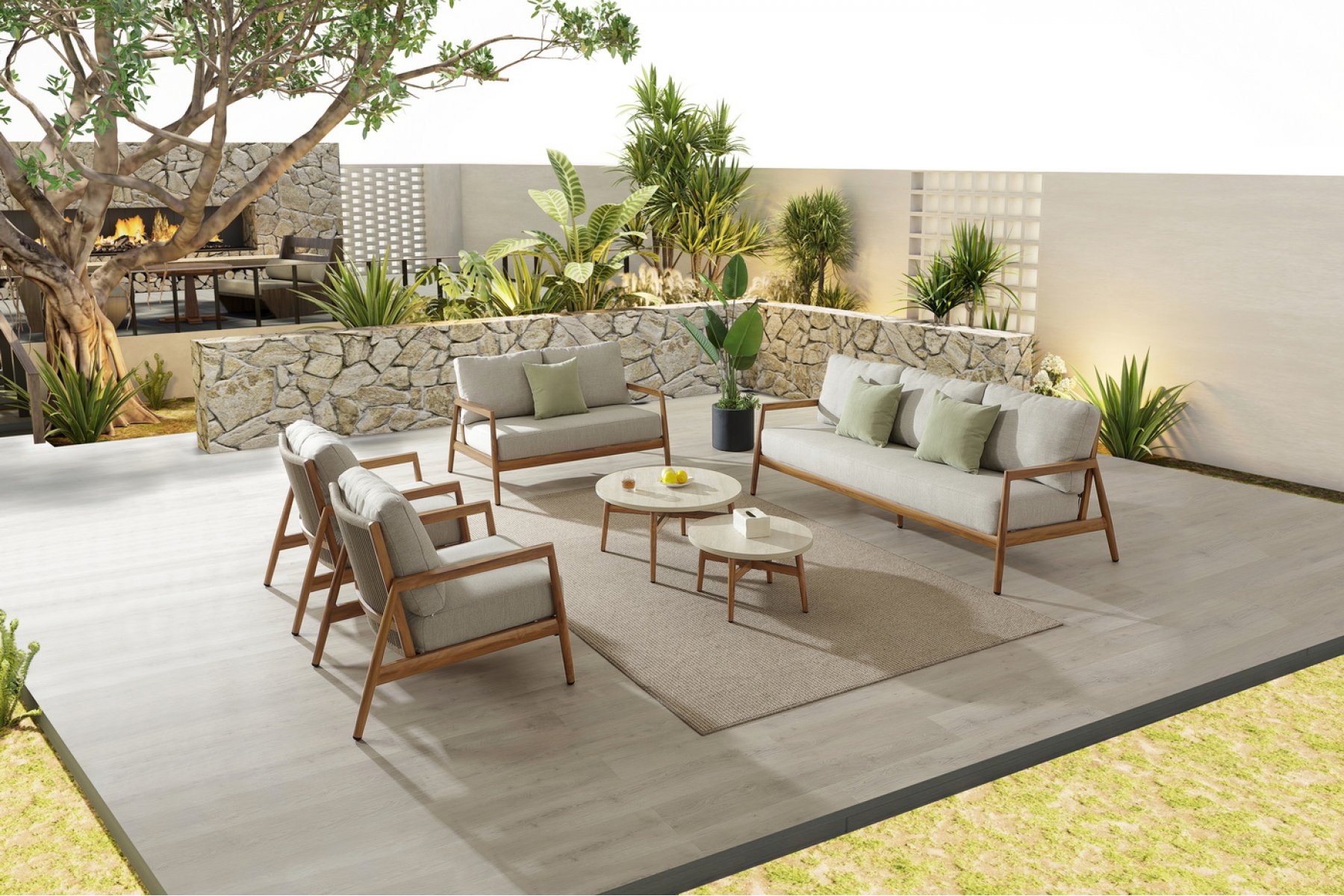 Прочный, но легкий алюминиевый каркас, стилизованный под тиковое дерево - гарантирует долгий срок службы и надежность. Тёплый древесный оттенок подчёркивает природную эстетику мебели.