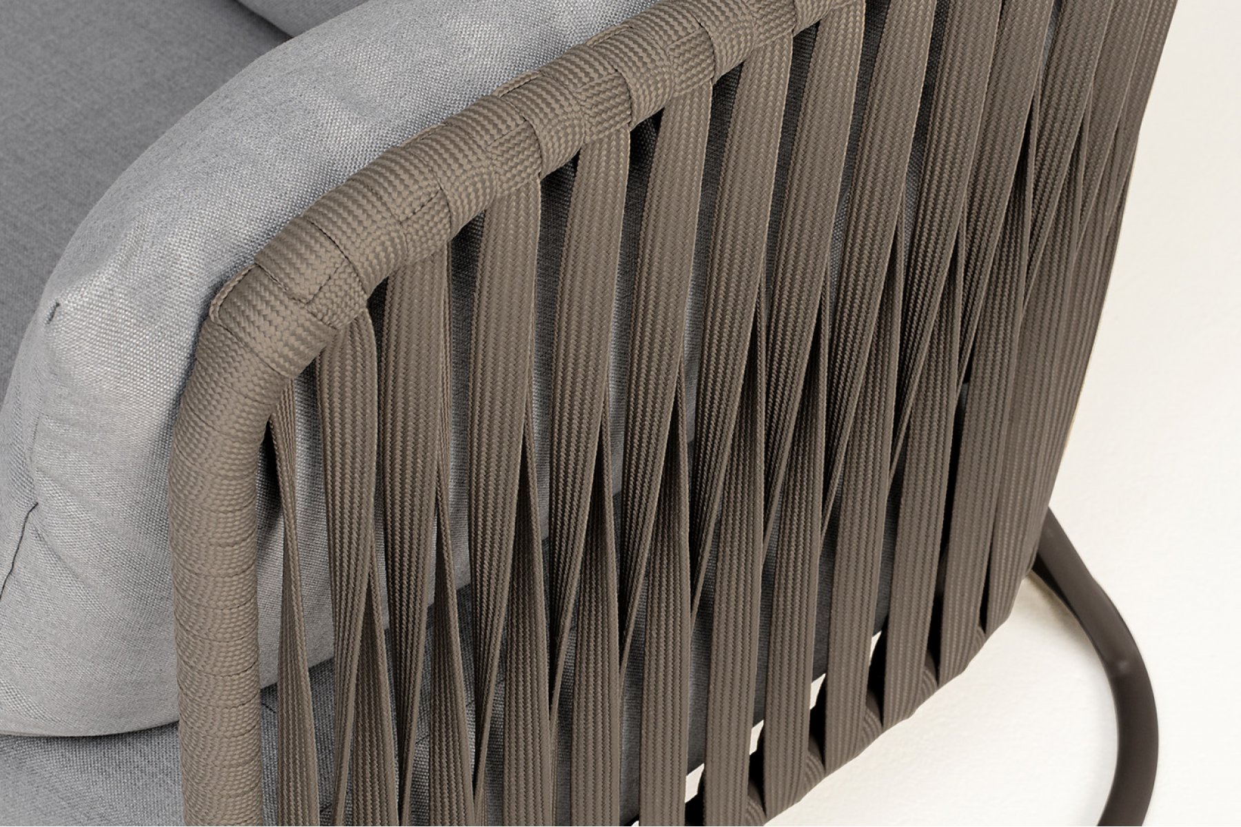 Диван имеет алюминиевый каркас, окрашенный порошковой краской в бежево-серый (RAL7006) цвет. Боковины каркаса вручную оплетены роупом - эластичными синтетическими лентами, изготовленными из высокопрочных полиэфирных волокон. Цвет оплетки - серо-коричневый.