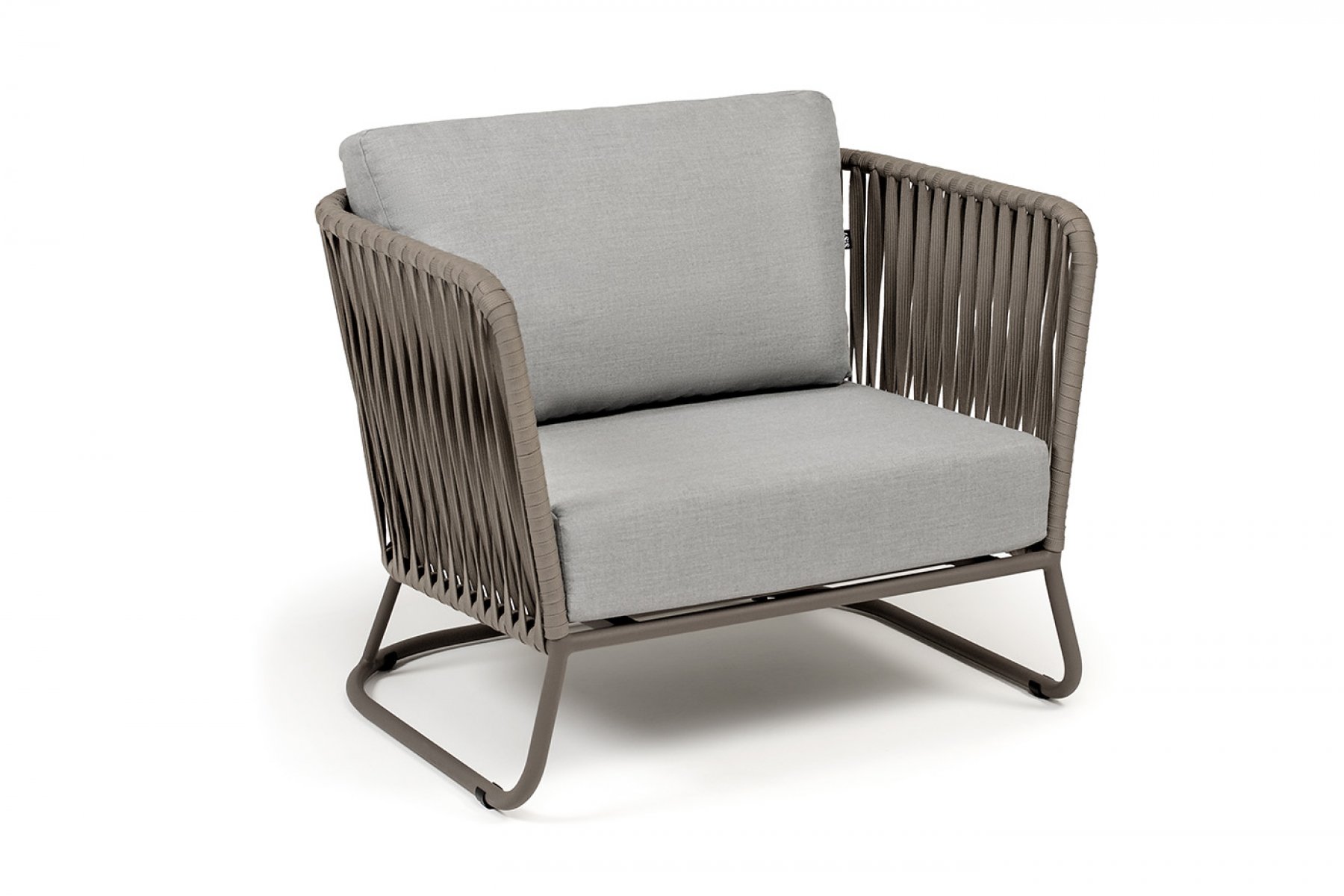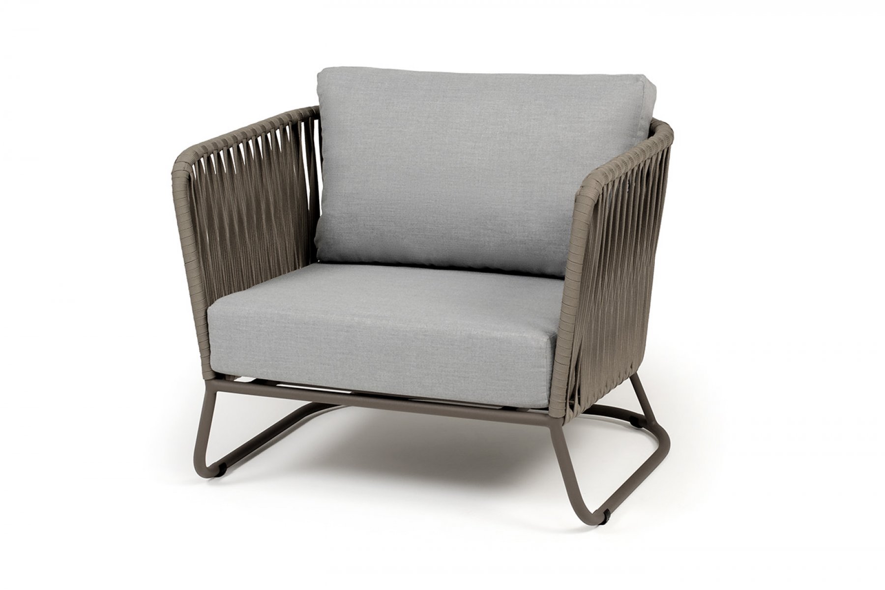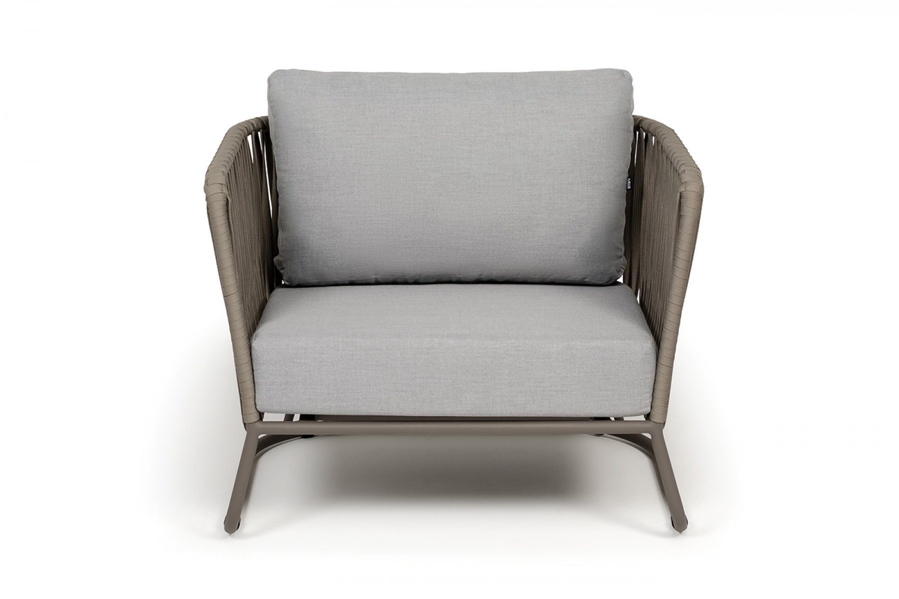 "Багамы" кресло плетеное из роупа, каркас алюминий бежево-серый (RAL7006) муар, роуп серо-коричневый 23мм, ткань светло-серая