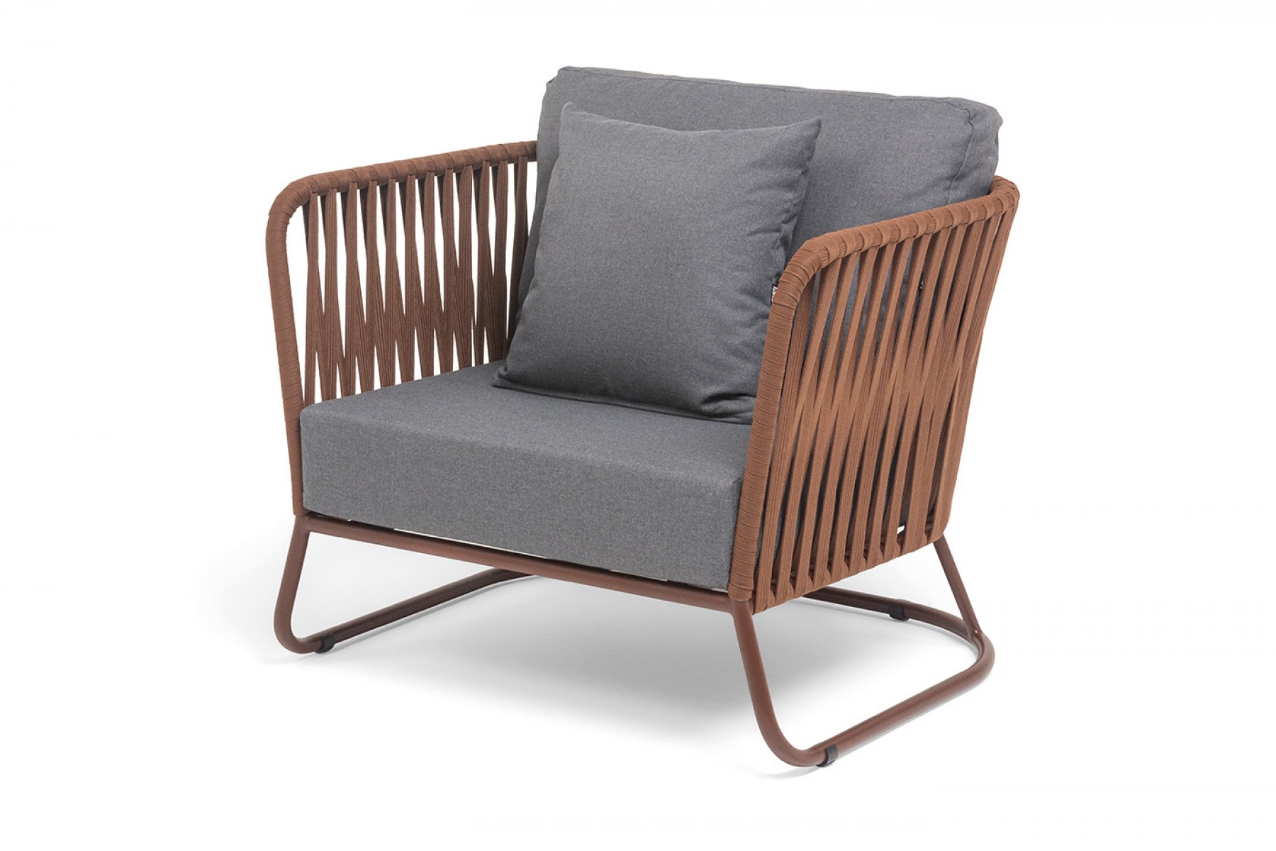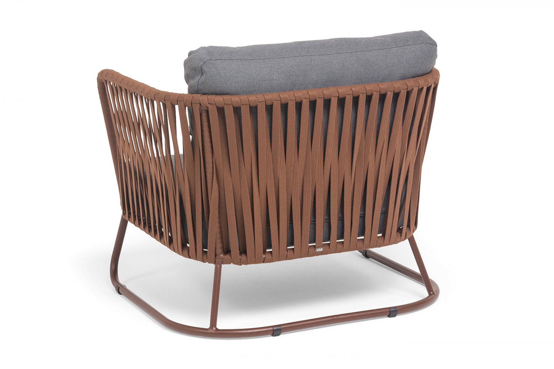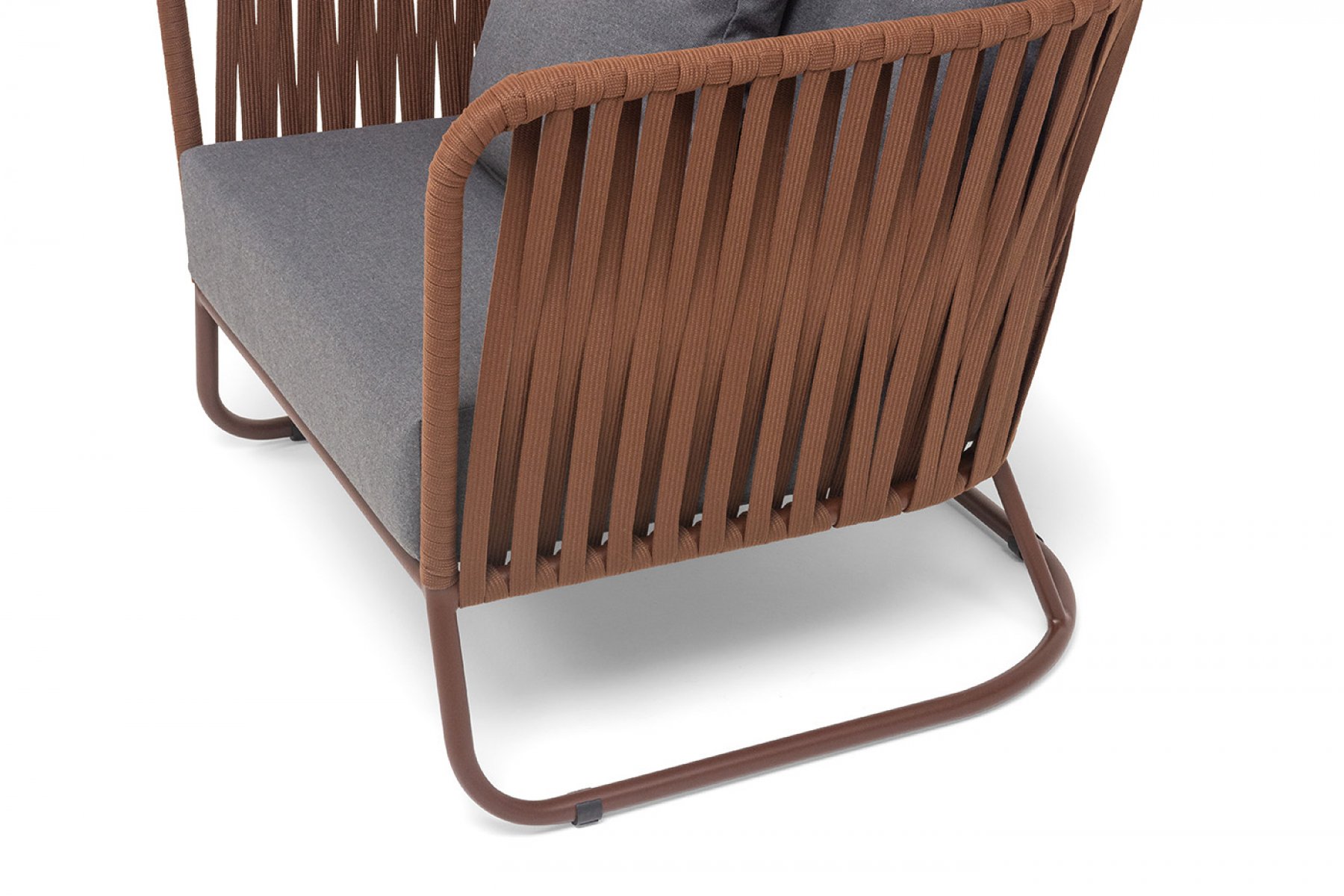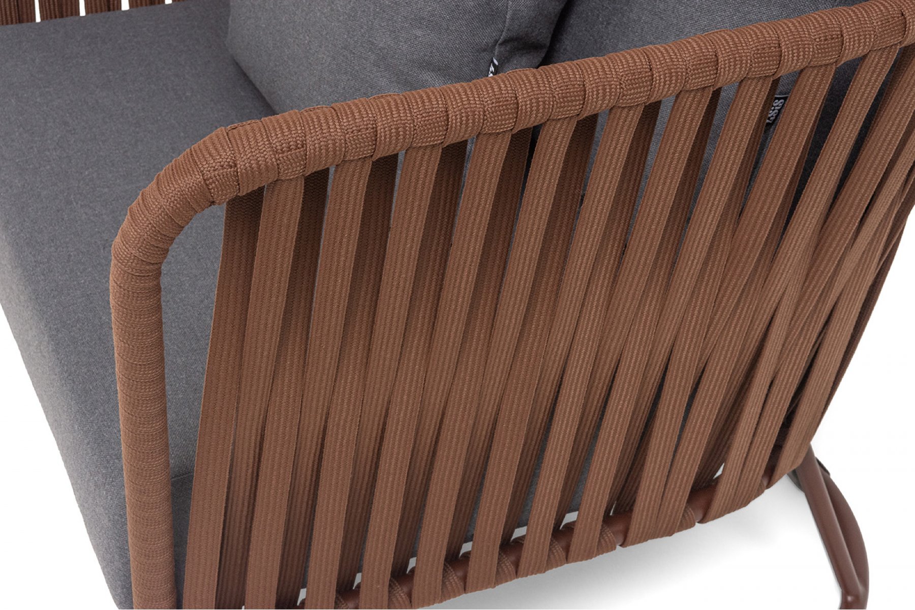 Кресло имеет алюминиевый каркас, окрашенный порошковой краской в коричневый (RAL8016) цвет. Боковины каркаса вручную оплетены роупом - эластичными синтетическими лентами, изготовленными из высокопрочных полиэфирных волокон. Оплетка - 23 мм, цвет коричневый.