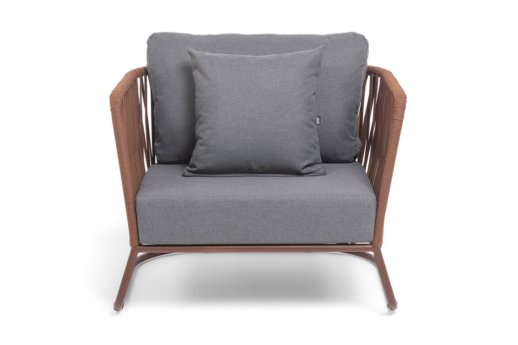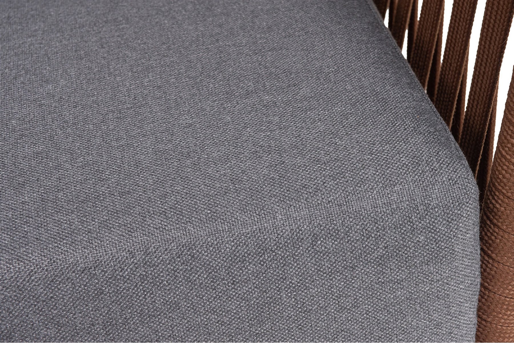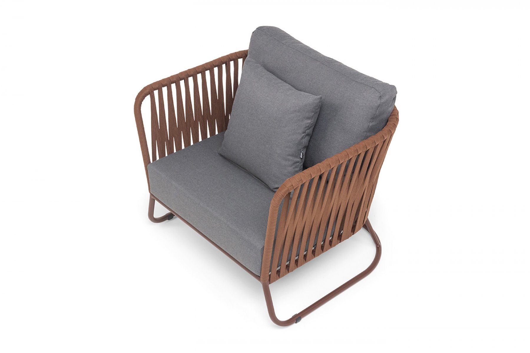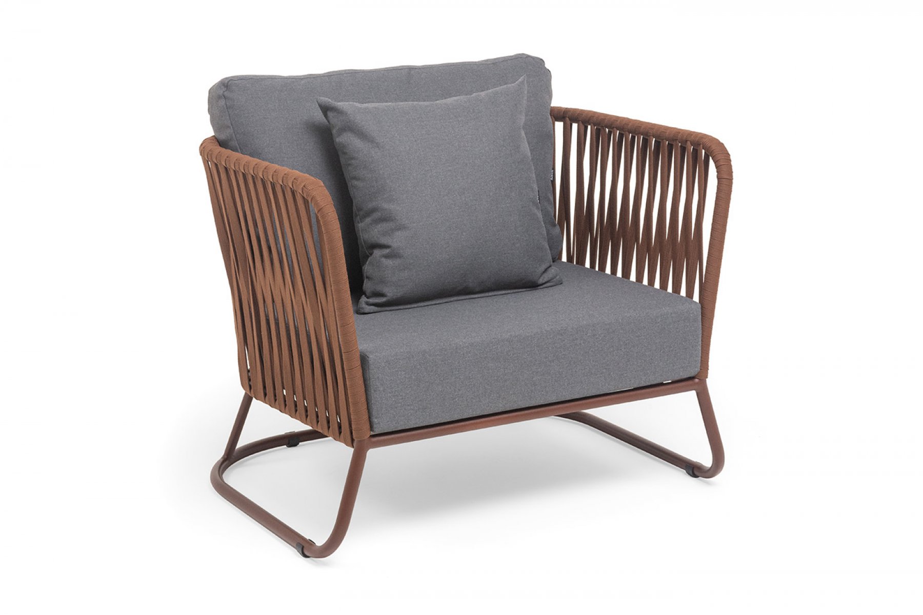 Кресло имеет алюминиевый каркас, окрашенный порошковой краской в коричневый (RAL8016) цвет. Боковины каркаса вручную оплетены роупом - эластичными синтетическими лентами, изготовленными из высокопрочных полиэфирных волокон. Оплетка - 23 мм, цвет коричневый.