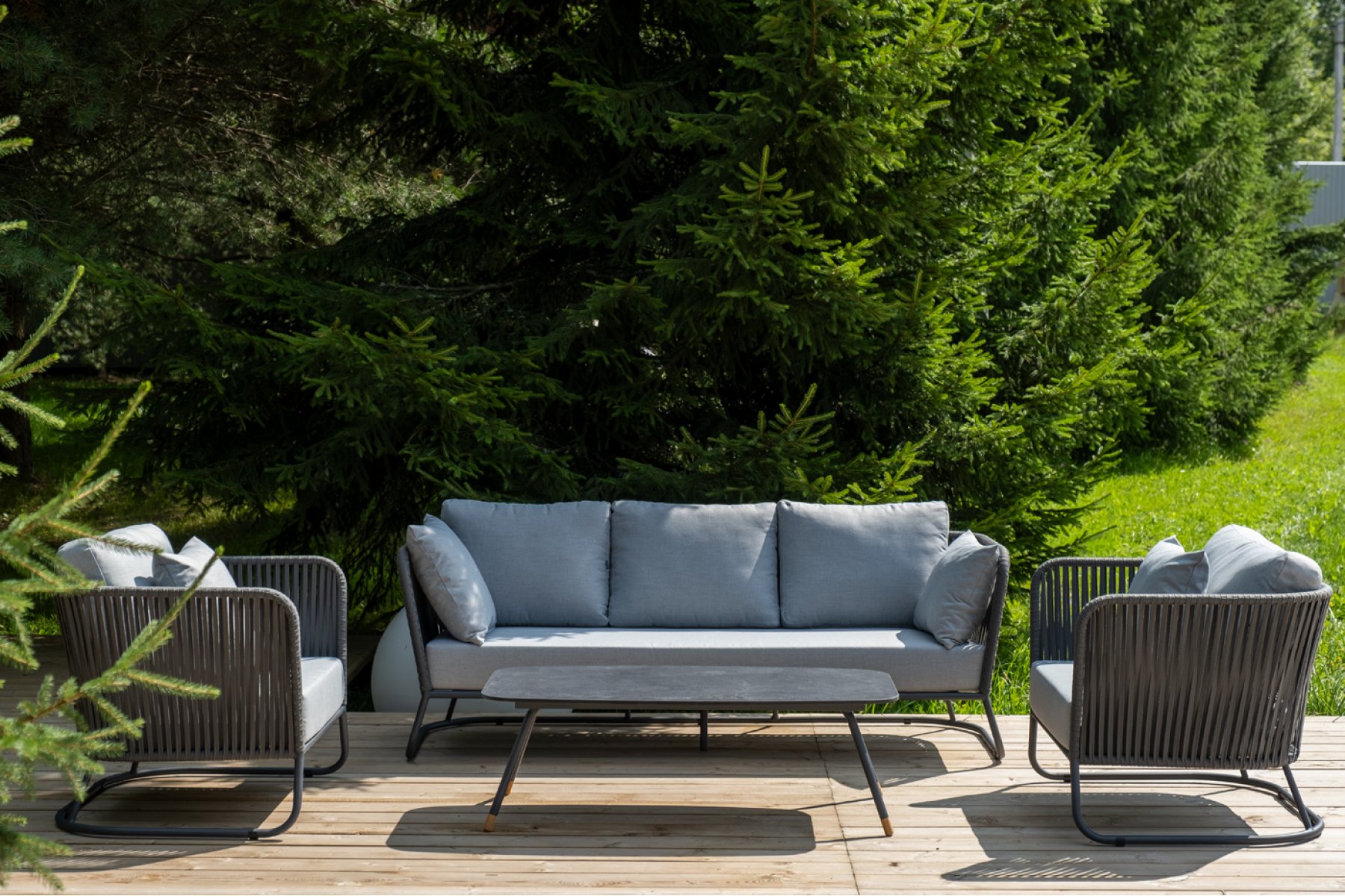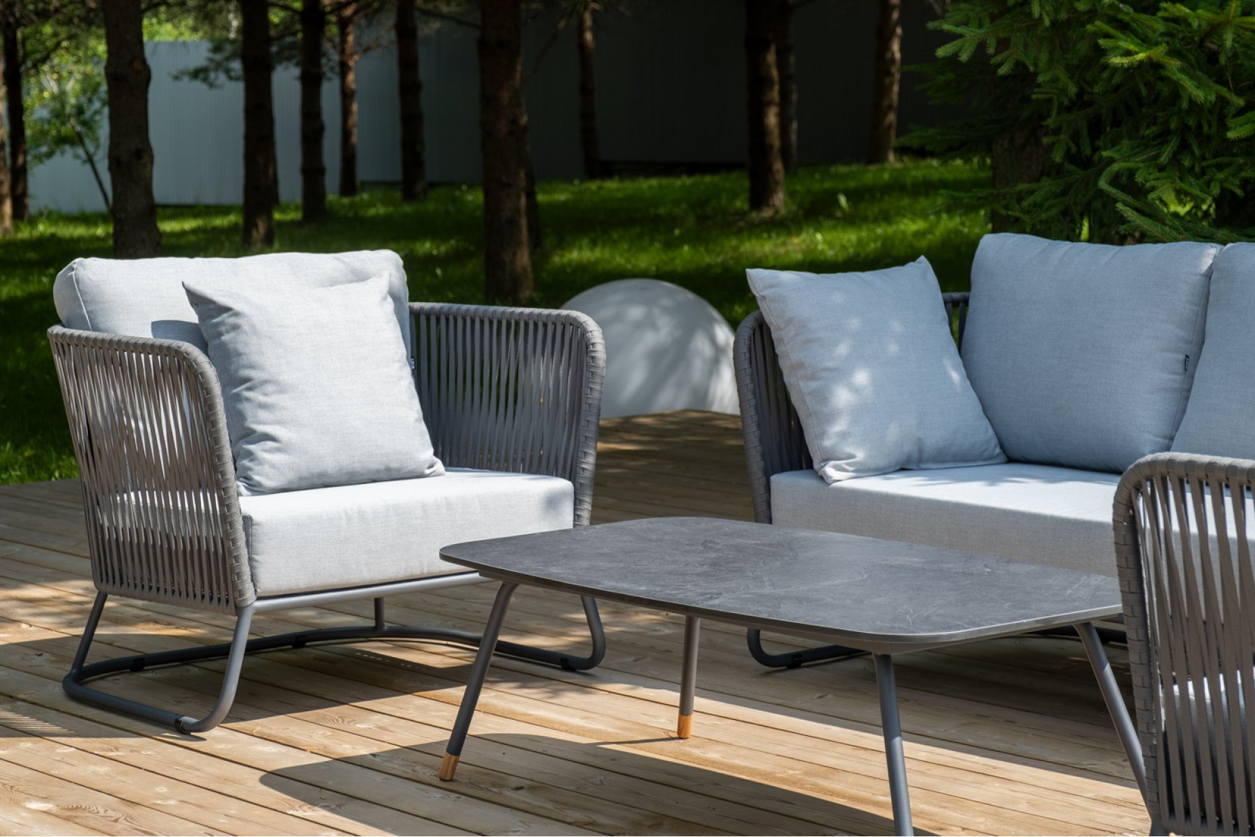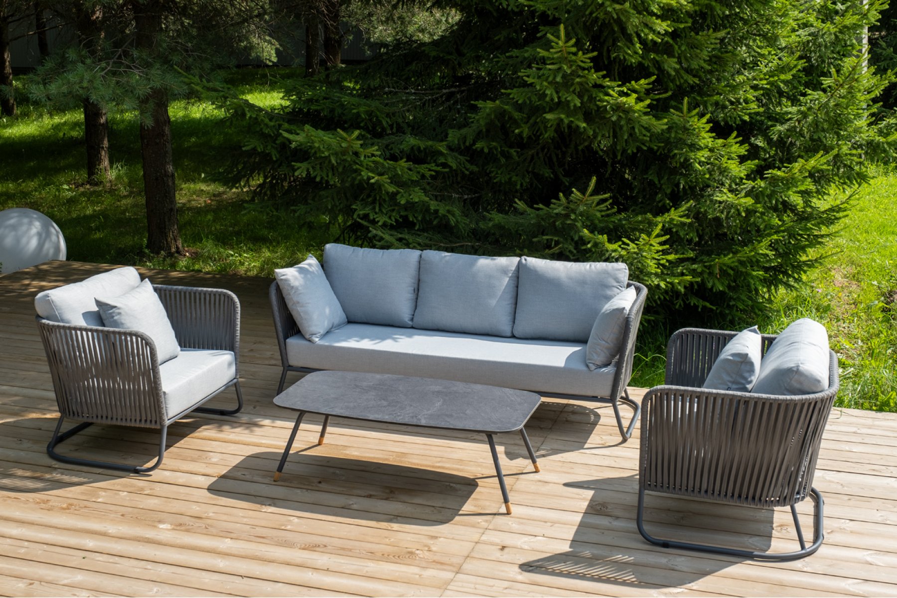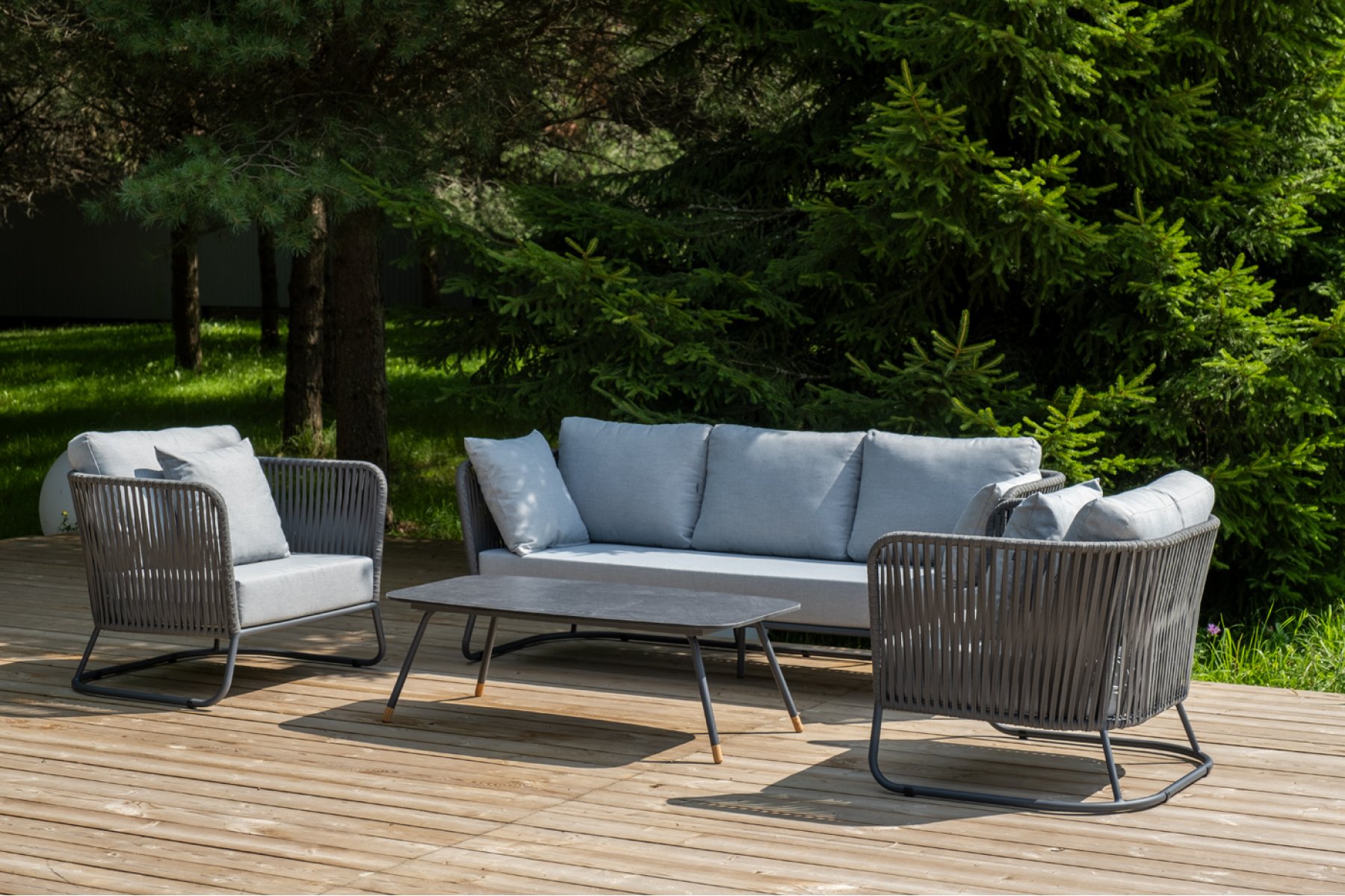 Кресла и диван идут в комплекте с мягкими подушками в чехлах светло-се "Багамы" диван 3-местный плетеный из роупа, каркас алюминий темно-серый (RAL7024) муар, роуп серый 15мм, ткань светло-серая 1шт. 2 000Х800Х735, "Багамы" кресло плетеное из роупа, каркас алюминий темно-серый (RAL7024) муар, роуп серый 15мм, ткань светло-серая 2шт. 920Х800Х735, "Верона" журнальный стол из HPL 120х65, H40, каркас черный муар, цвет столешницы "серый гранит" 1шт. 1 200Х650Х400,