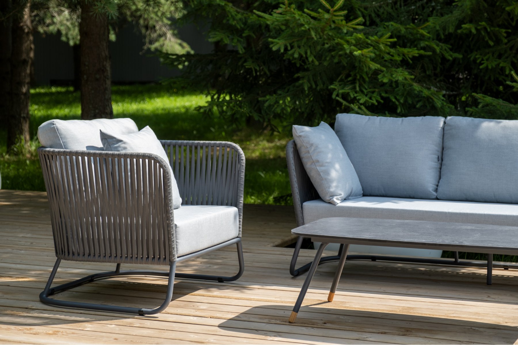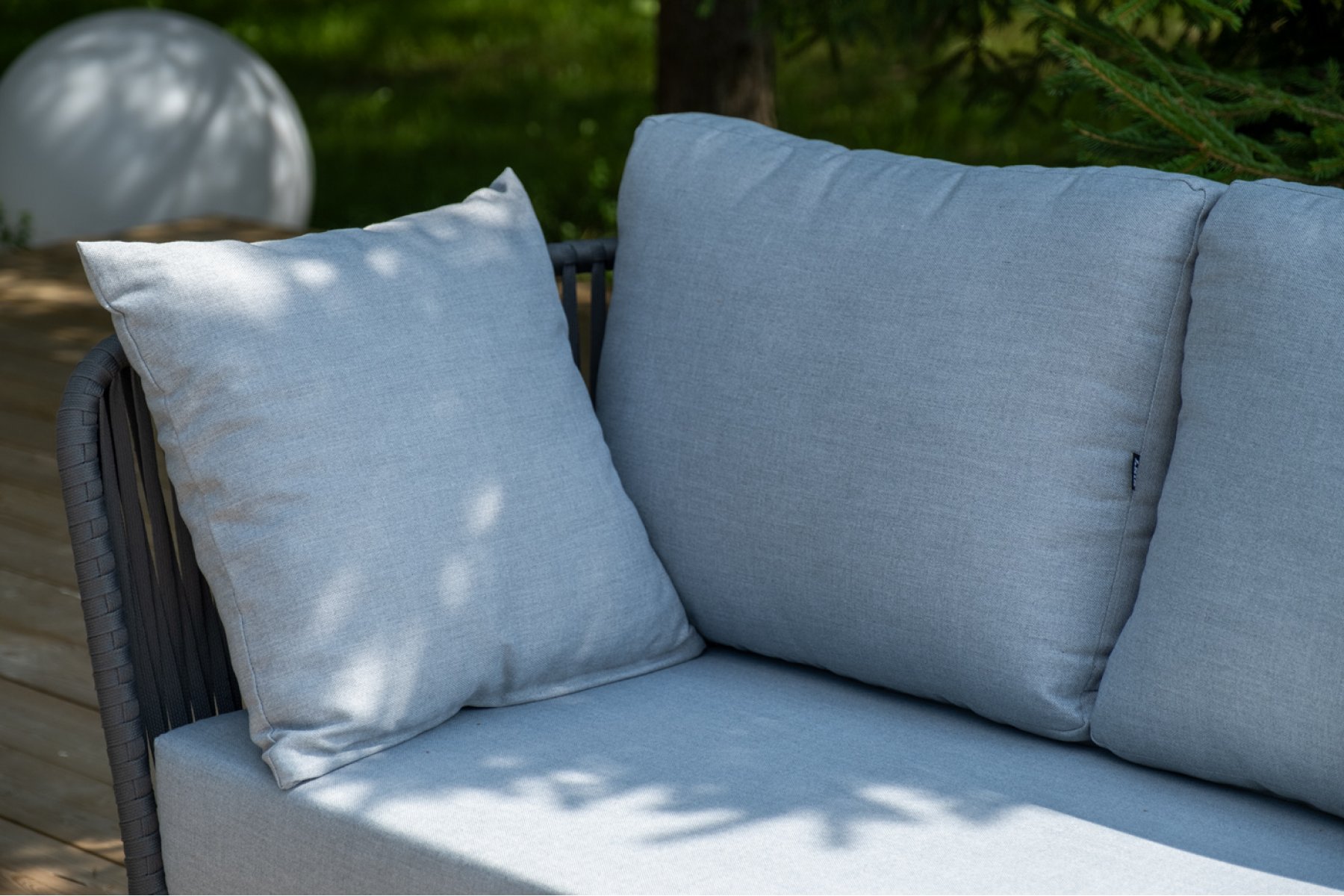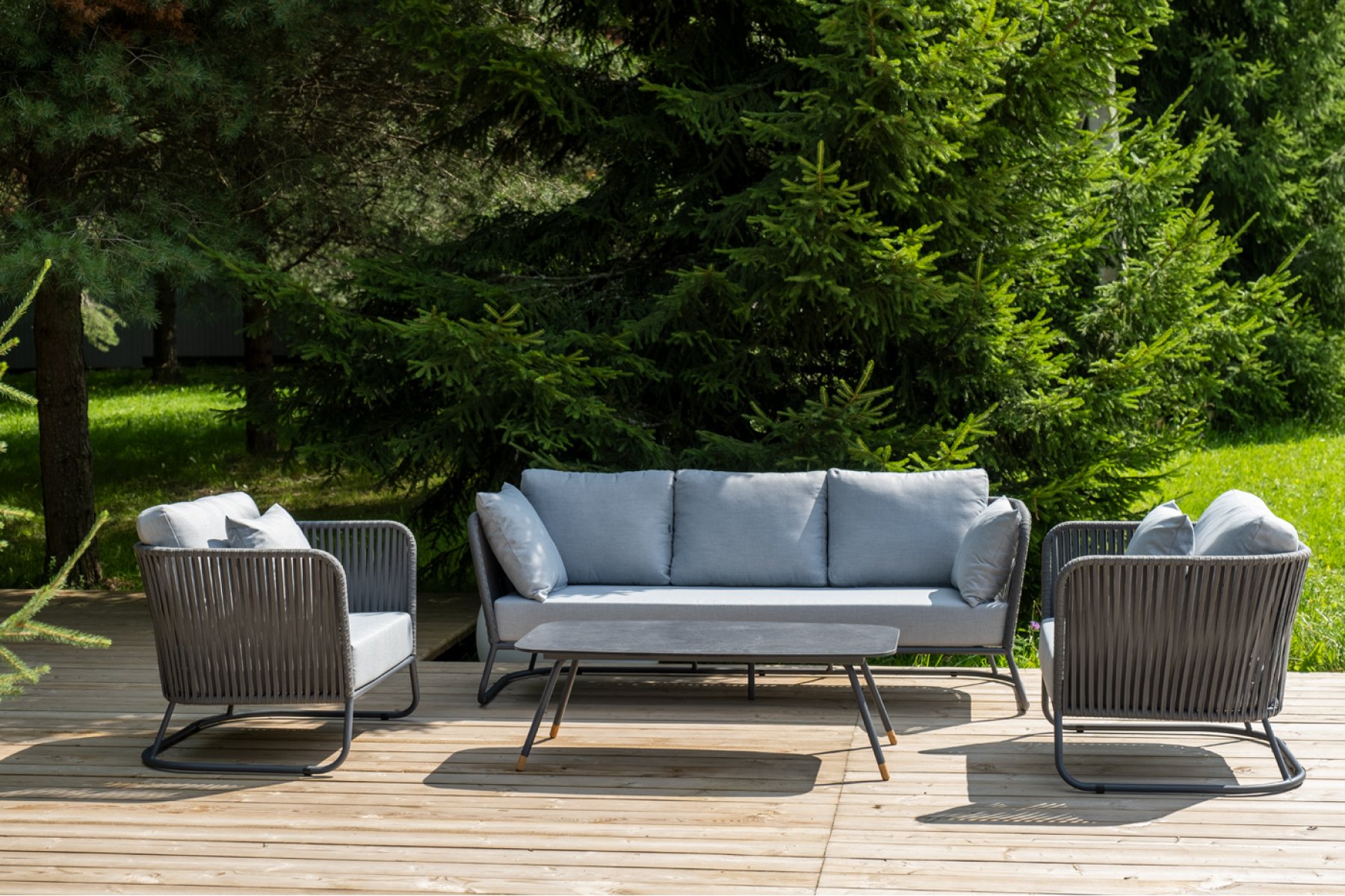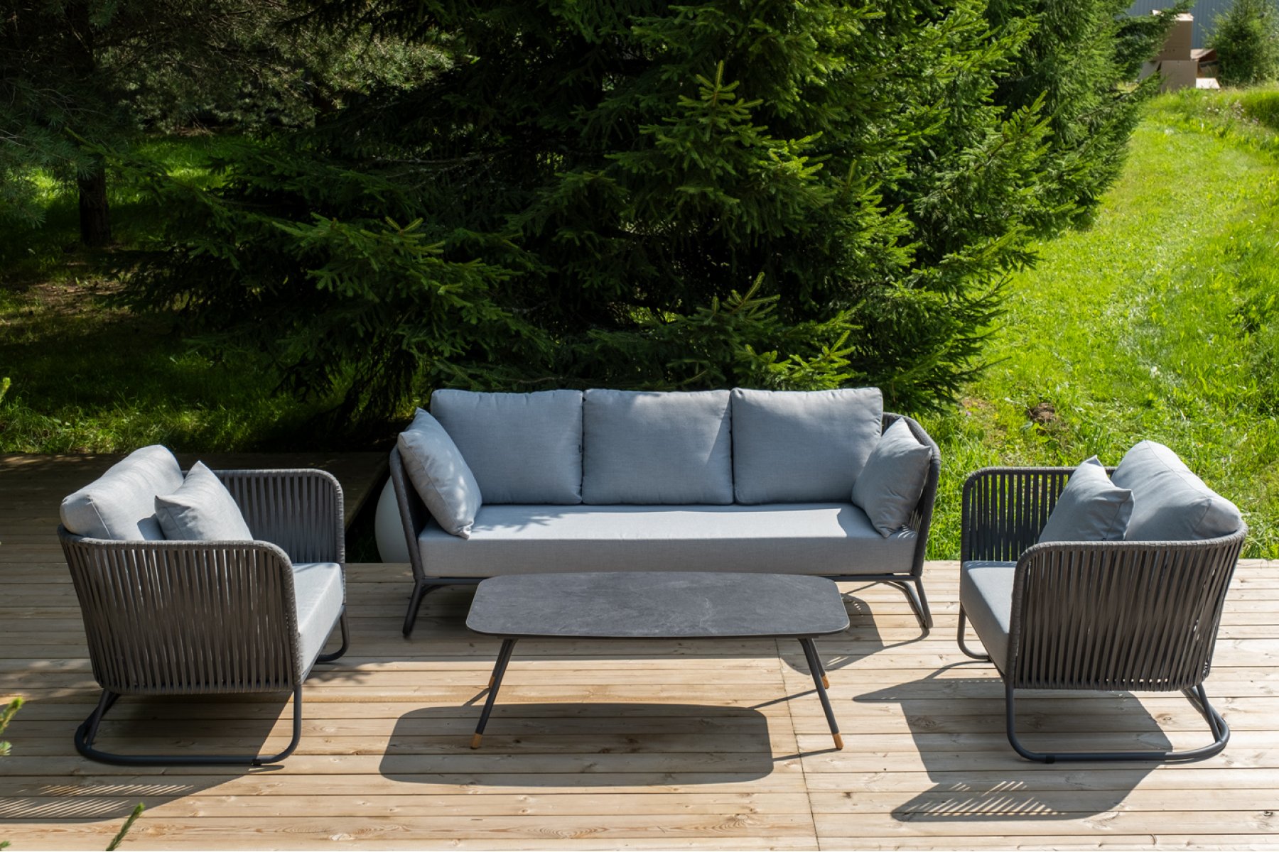 Кресла и диван идут в комплекте с мягкими подушками в чехлах светло-се "Багамы" диван 3-местный плетеный из роупа, каркас алюминий темно-серый (RAL7024) муар, роуп серый 15мм, ткань светло-серая 1шт. 2 000Х800Х735, "Багамы" кресло плетеное из роупа, каркас алюминий темно-серый (RAL7024) муар, роуп серый 15мм, ткань светло-серая 2шт. 920Х800Х735, "Верона" журнальный стол из HPL 120х65, H40, каркас черный муар, цвет столешницы "серый гранит" 1шт. 1 200Х650Х400,