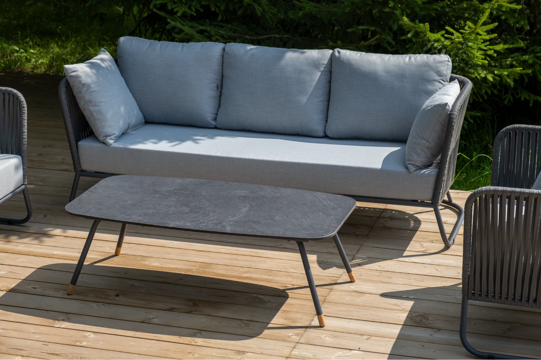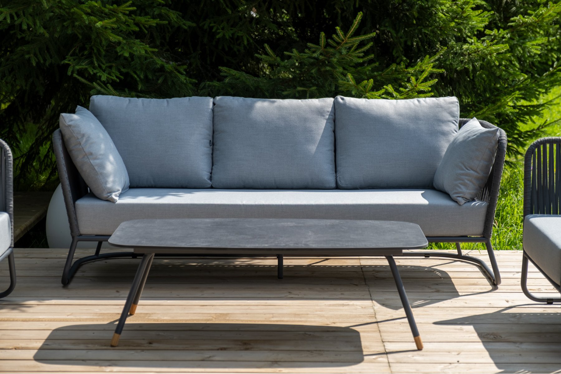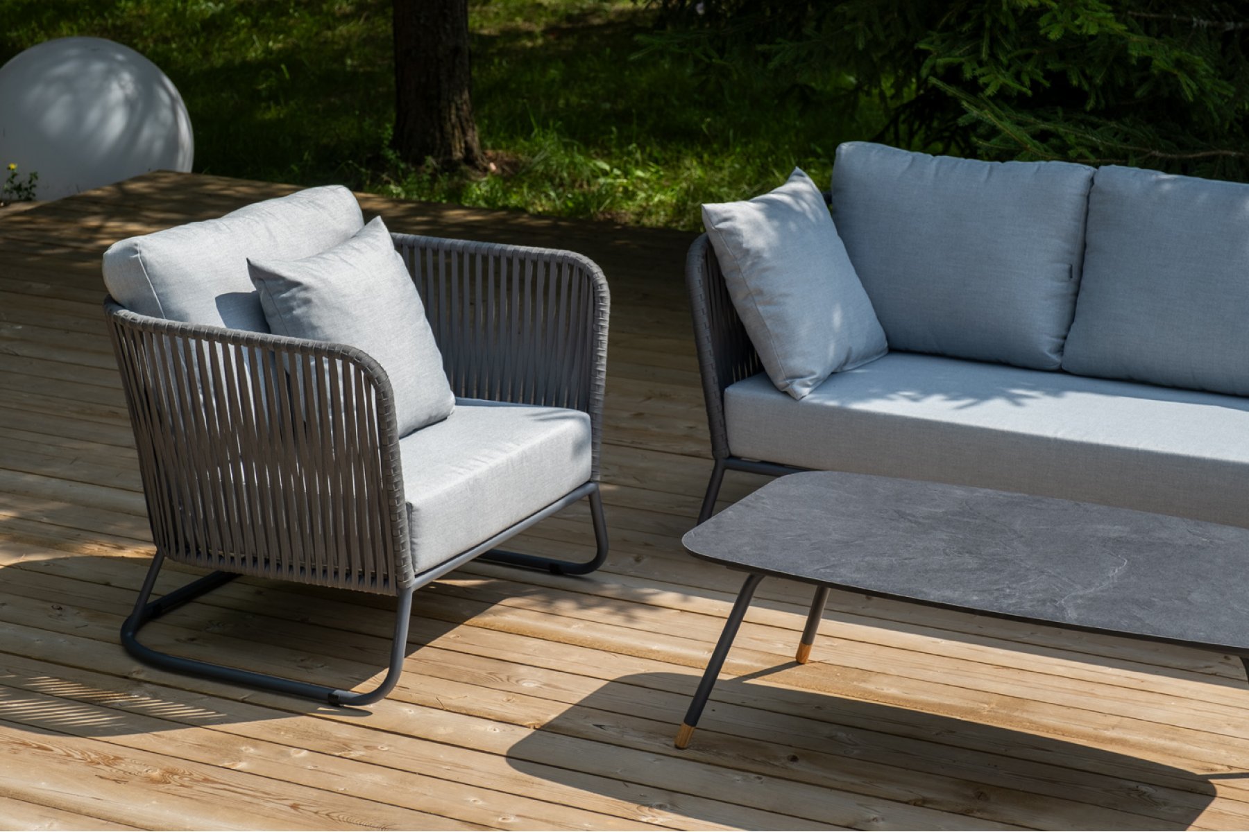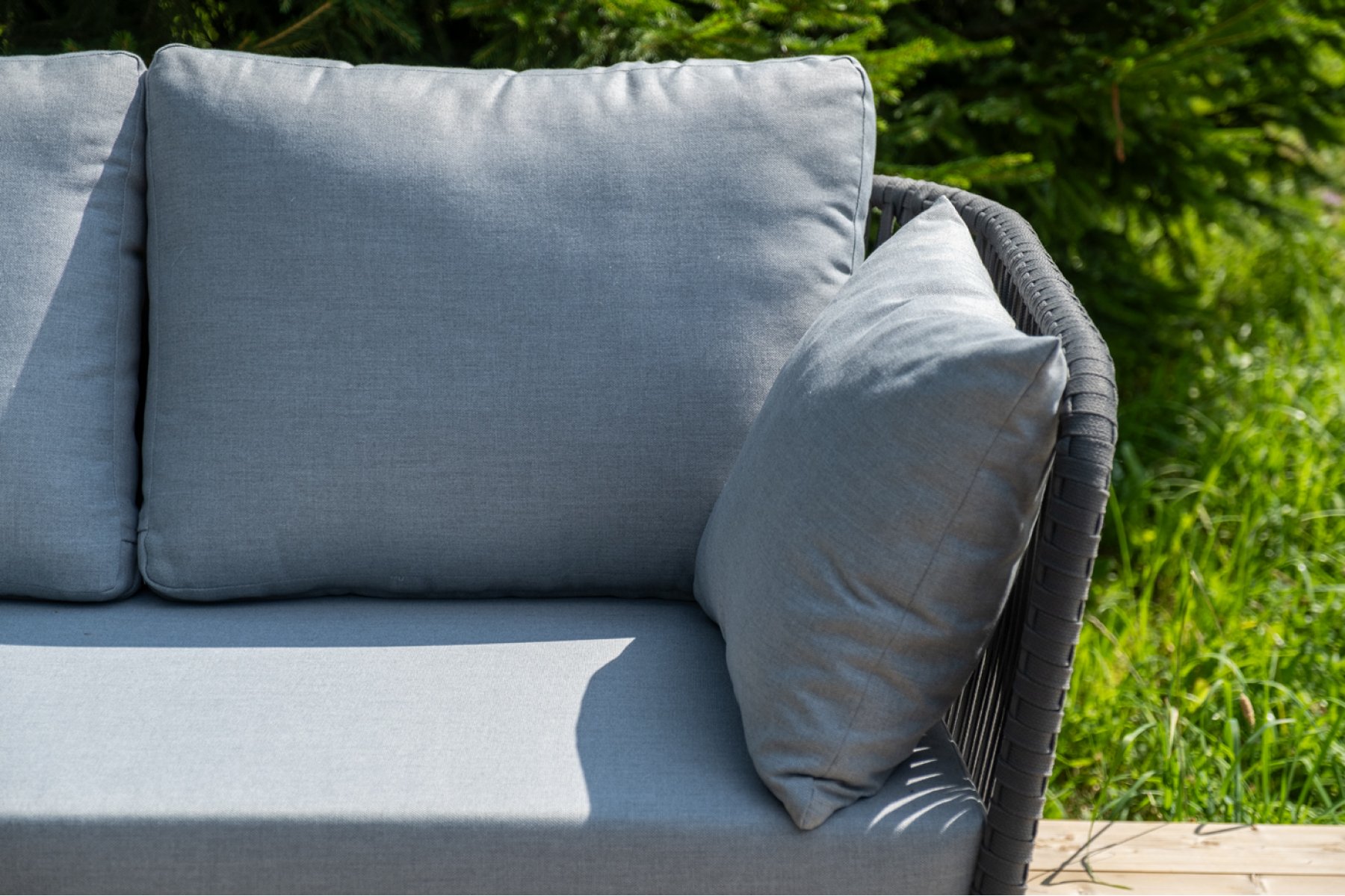 Кресла и диван идут в комплекте с мягкими подушками в чехлах светло-се "Багамы" диван 3-местный плетеный из роупа, каркас алюминий темно-серый (RAL7024) муар, роуп серый 15мм, ткань светло-серая 1шт. 2 000Х800Х735, "Багамы" кресло плетеное из роупа, каркас алюминий темно-серый (RAL7024) муар, роуп серый 15мм, ткань светло-серая 2шт. 920Х800Х735, "Верона" журнальный стол из HPL 120х65, H40, каркас черный муар, цвет столешницы "серый гранит" 1шт. 1 200Х650Х400,