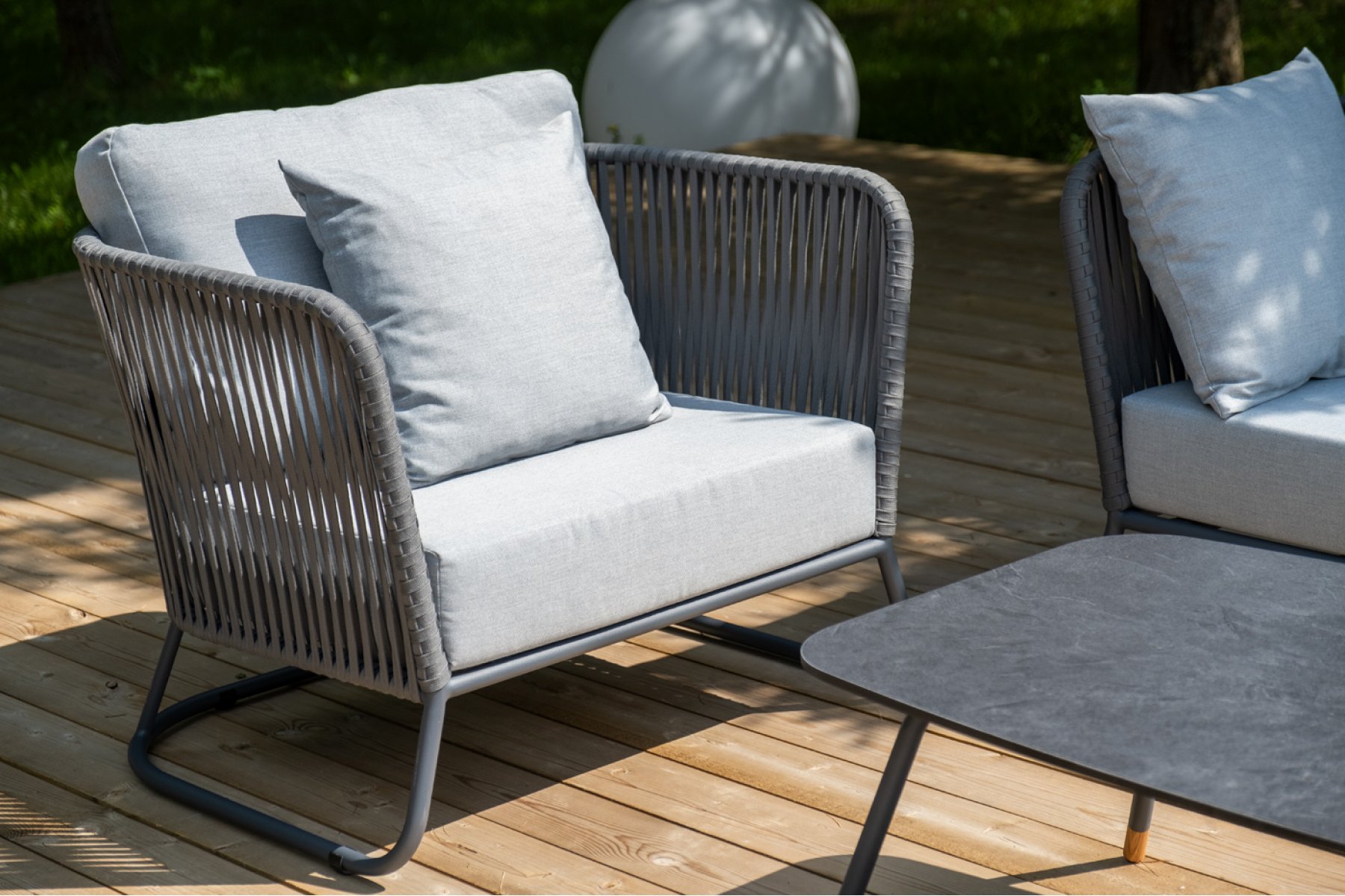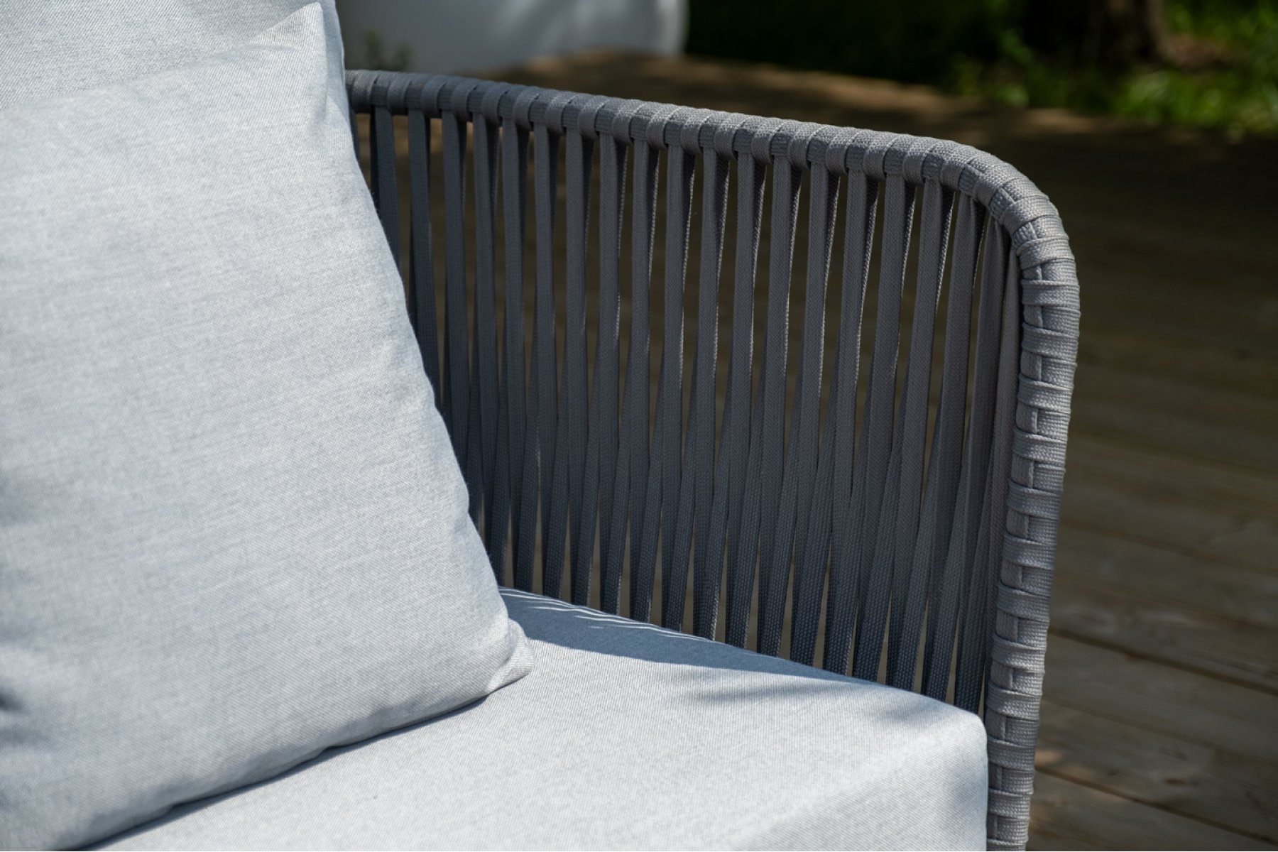 Каркас уличной мебели выполнен из износостойкого алюминия. Его дополняет серая ручная оплетка, изготовленная на основе эластичных синтетических лент из полиэфирных волокон высокой прочности (роупа).