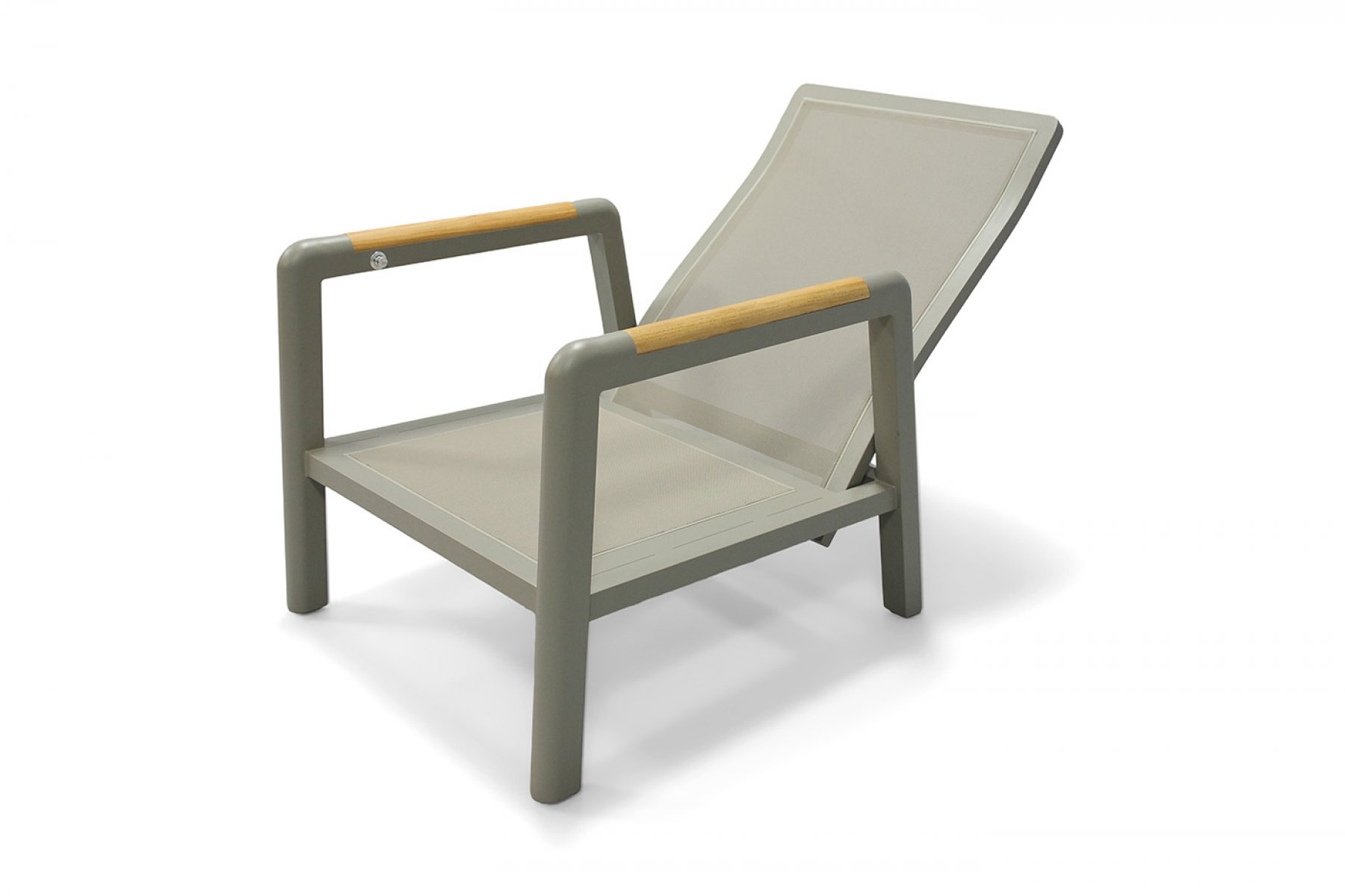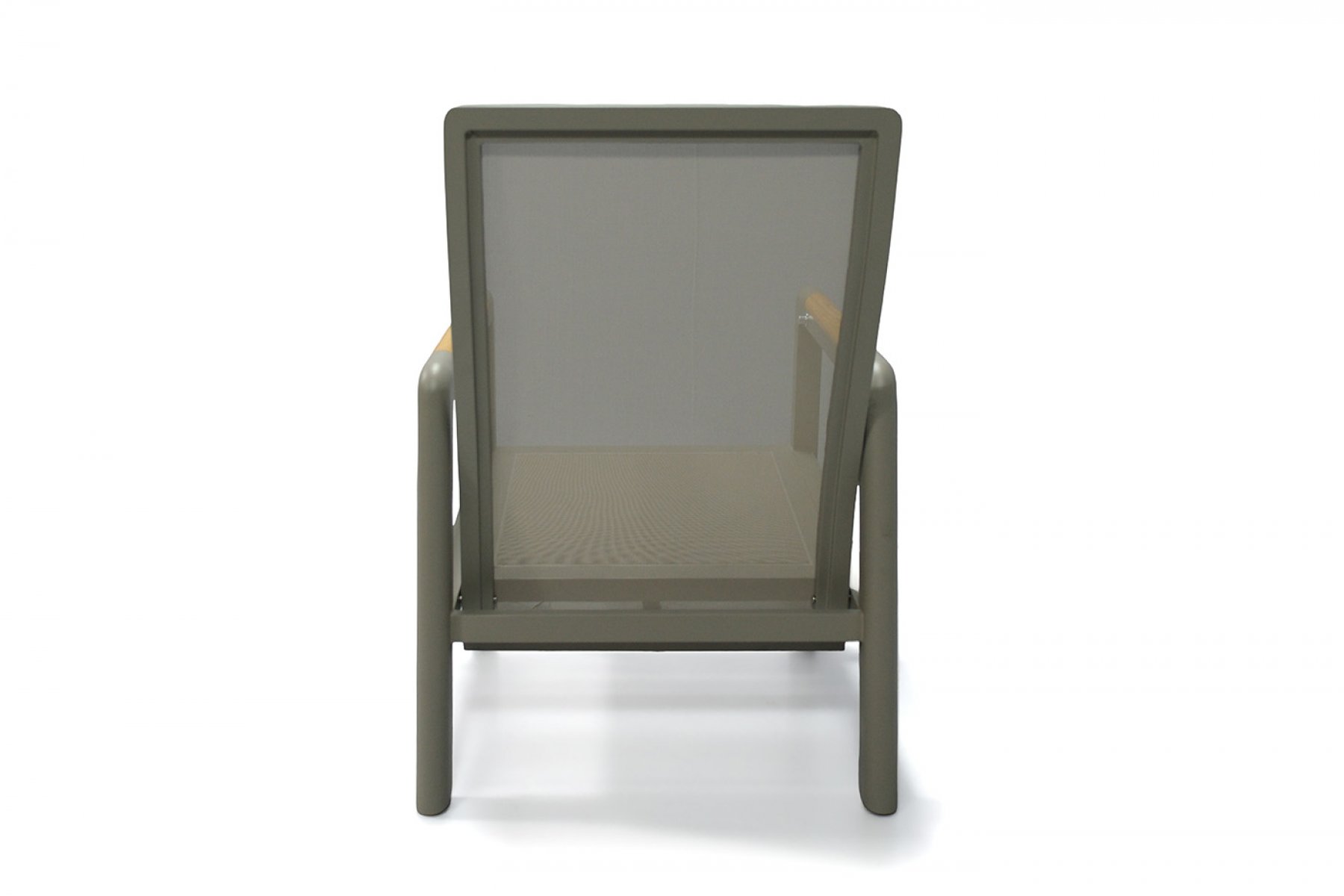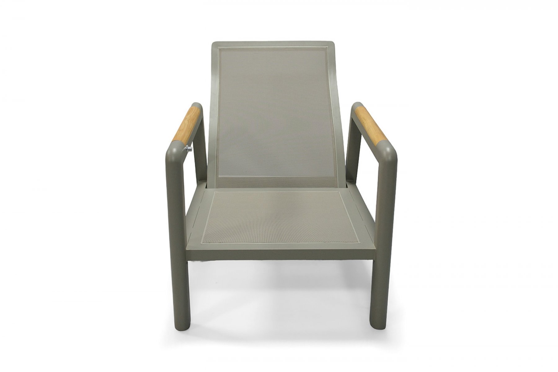 Каркас выполнен из прочного алюминия, обработанного порошковым покрытием светло-серого цвета, что обеспечивает устойчивость к коррозии и долговечность в эксплуатации. Подлокотники украшены вставками из тикового дерева.