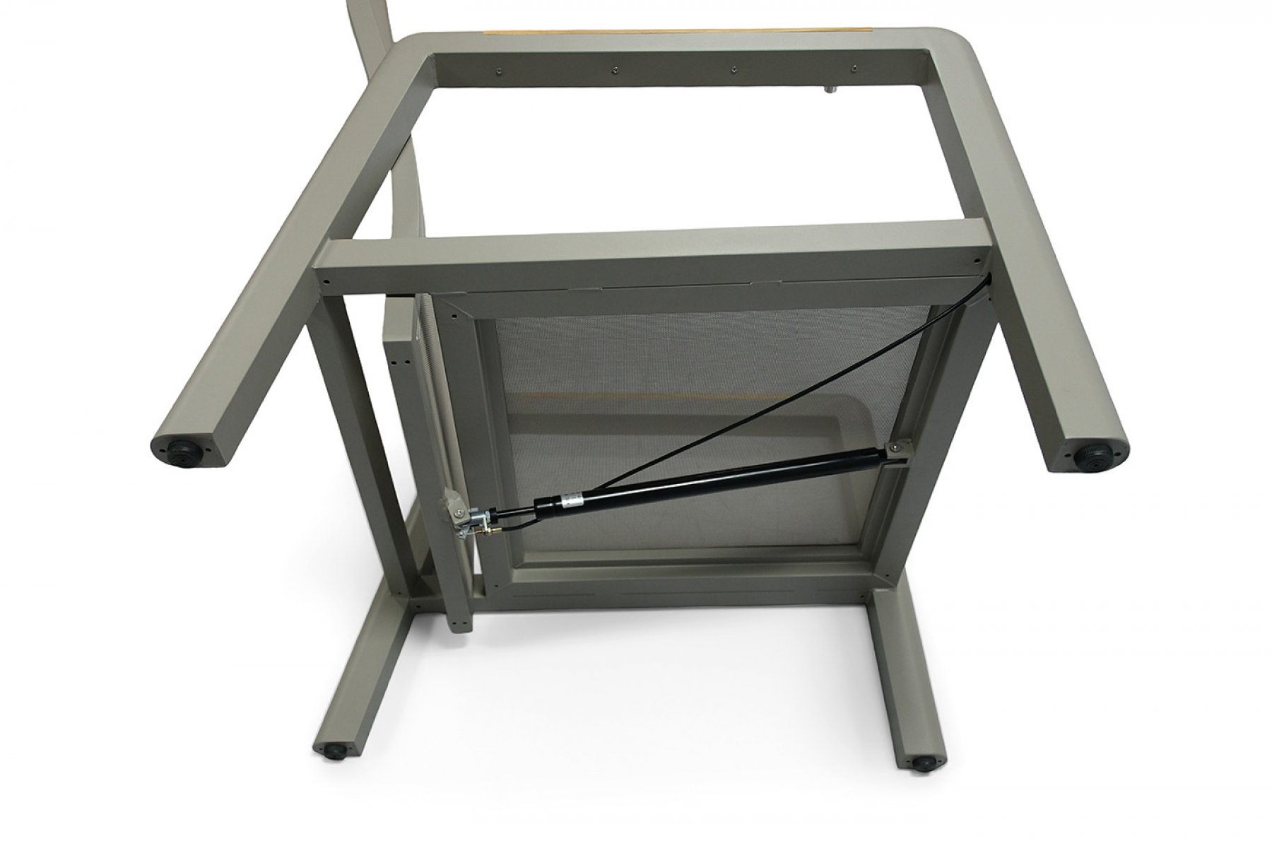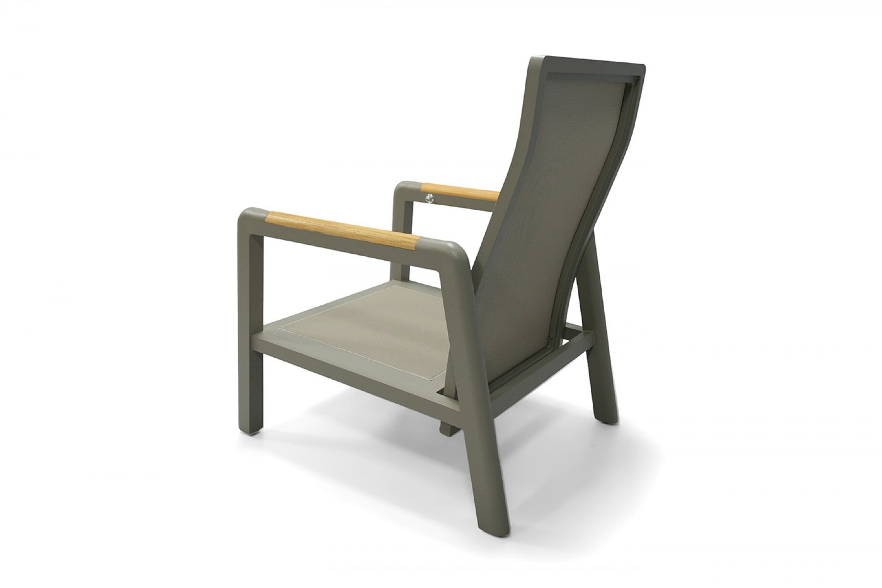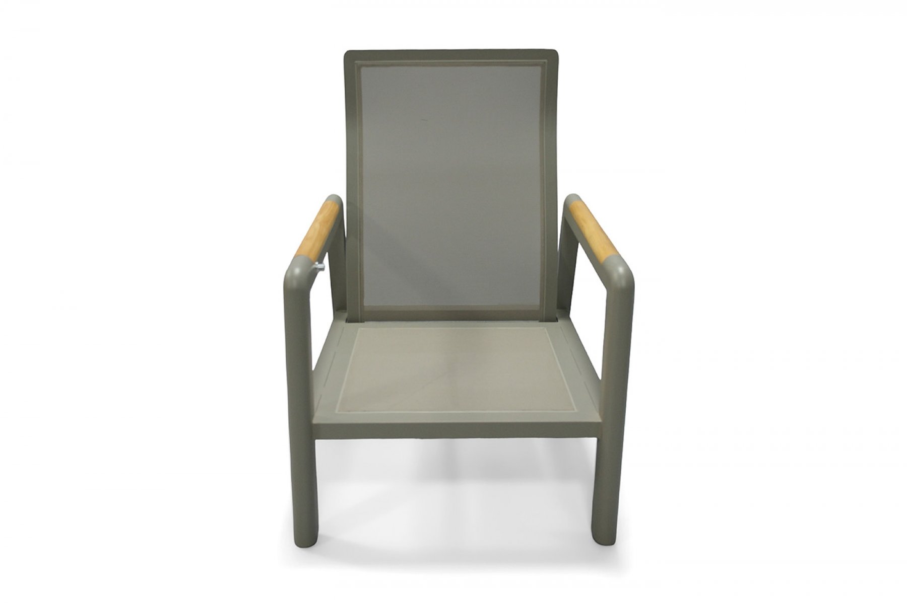 Каркас выполнен из прочного алюминия, обработанного порошковым покрытием светло-серого цвета, что обеспечивает устойчивость к коррозии и долговечность в эксплуатации. Подлокотники украшены вставками из тикового дерева.