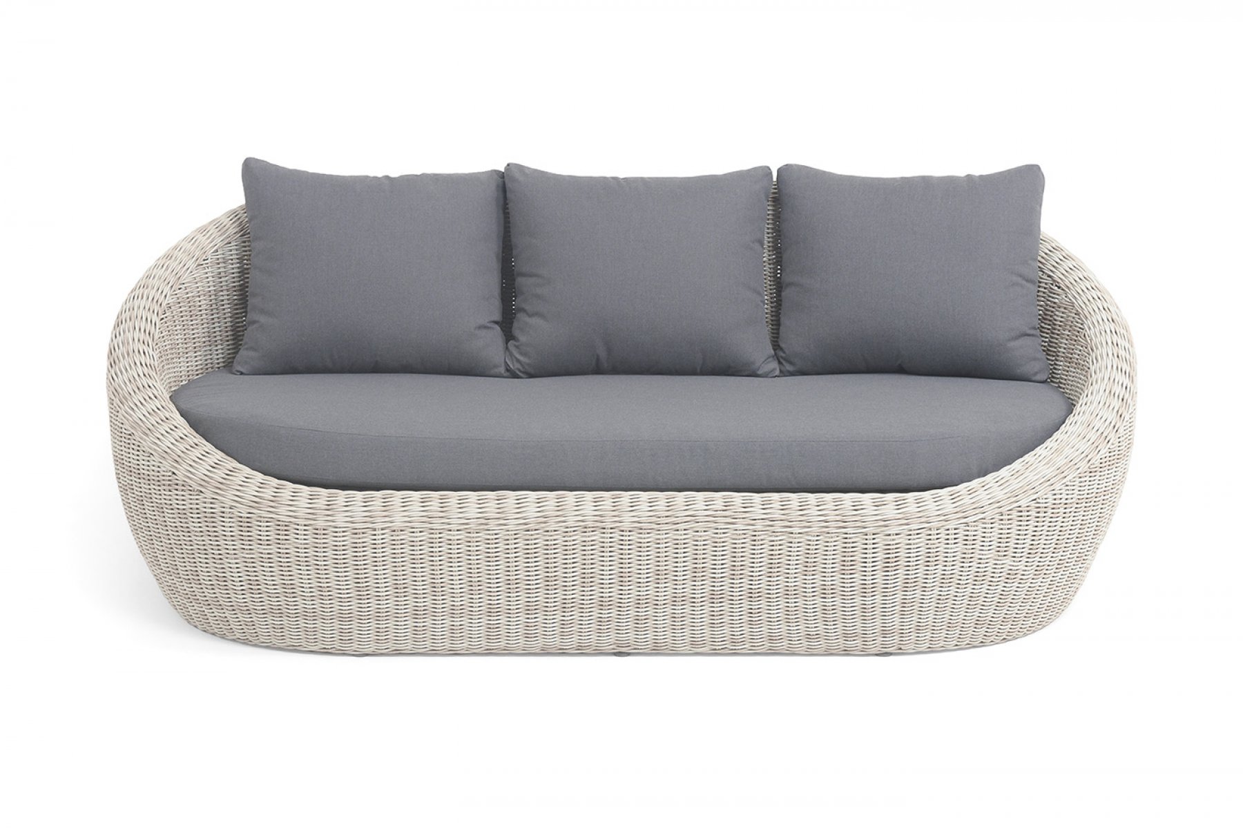 Трехместный диван дополняют мягкие подушки в сером цвете со съёмными чехлами. Тканевые изделия выполнены из прочного полиэстера плотностью 300гр/м2. Материал имеет влагоотталкивающую пропитку.