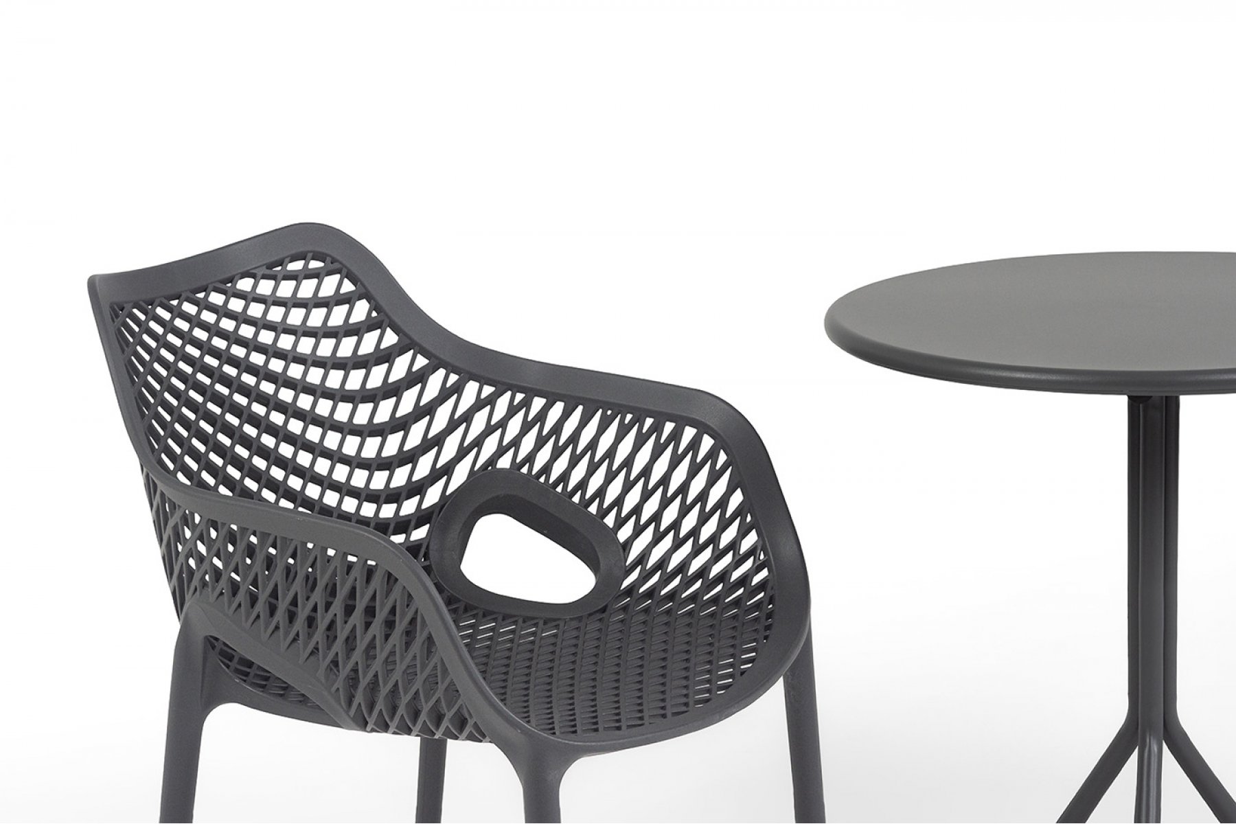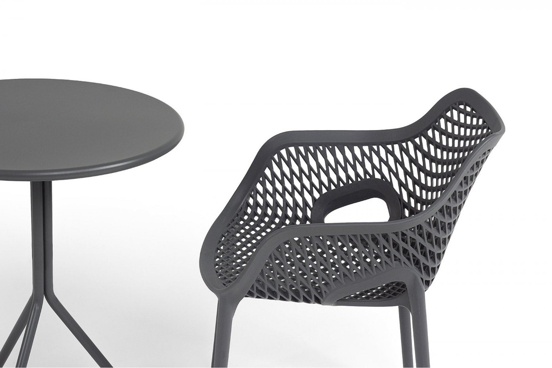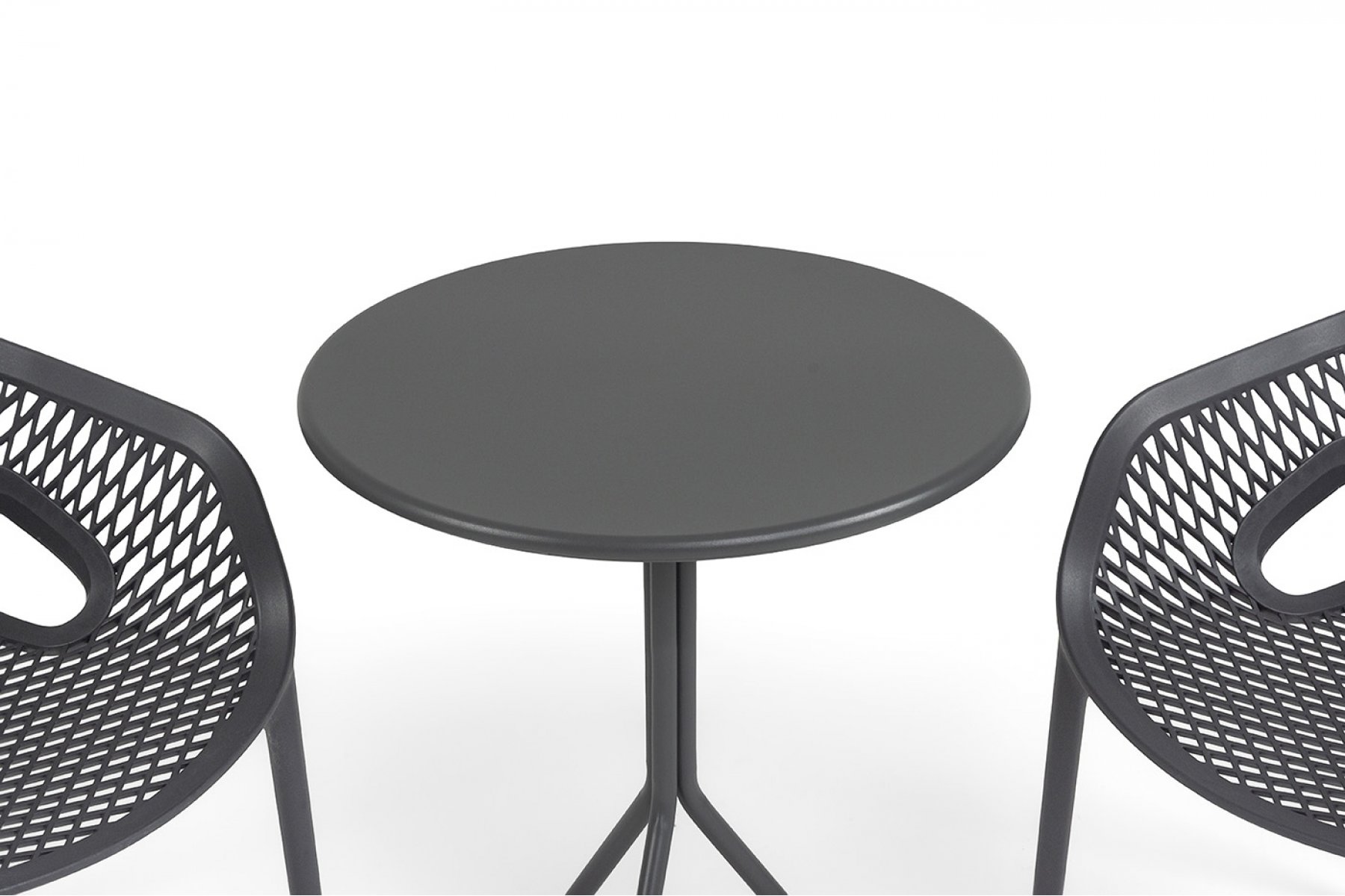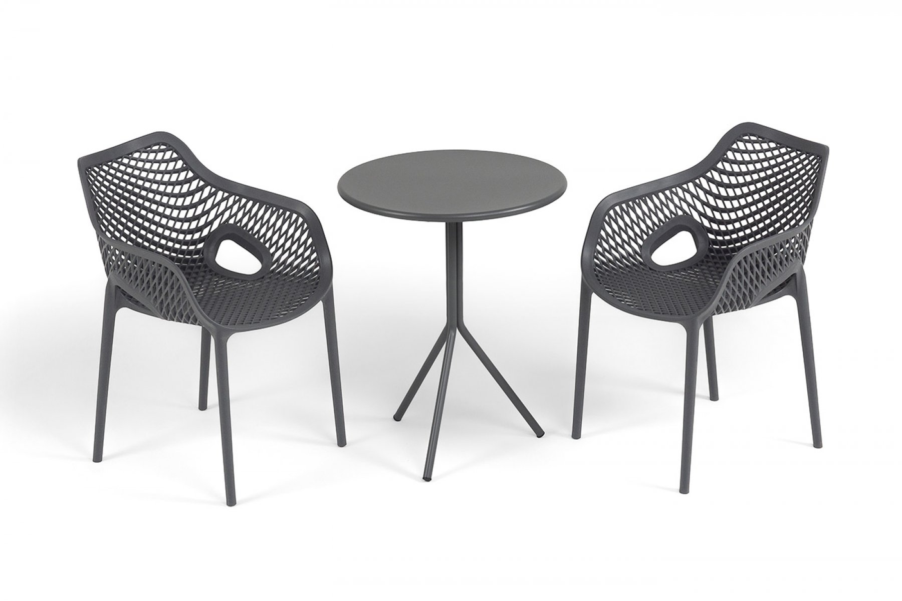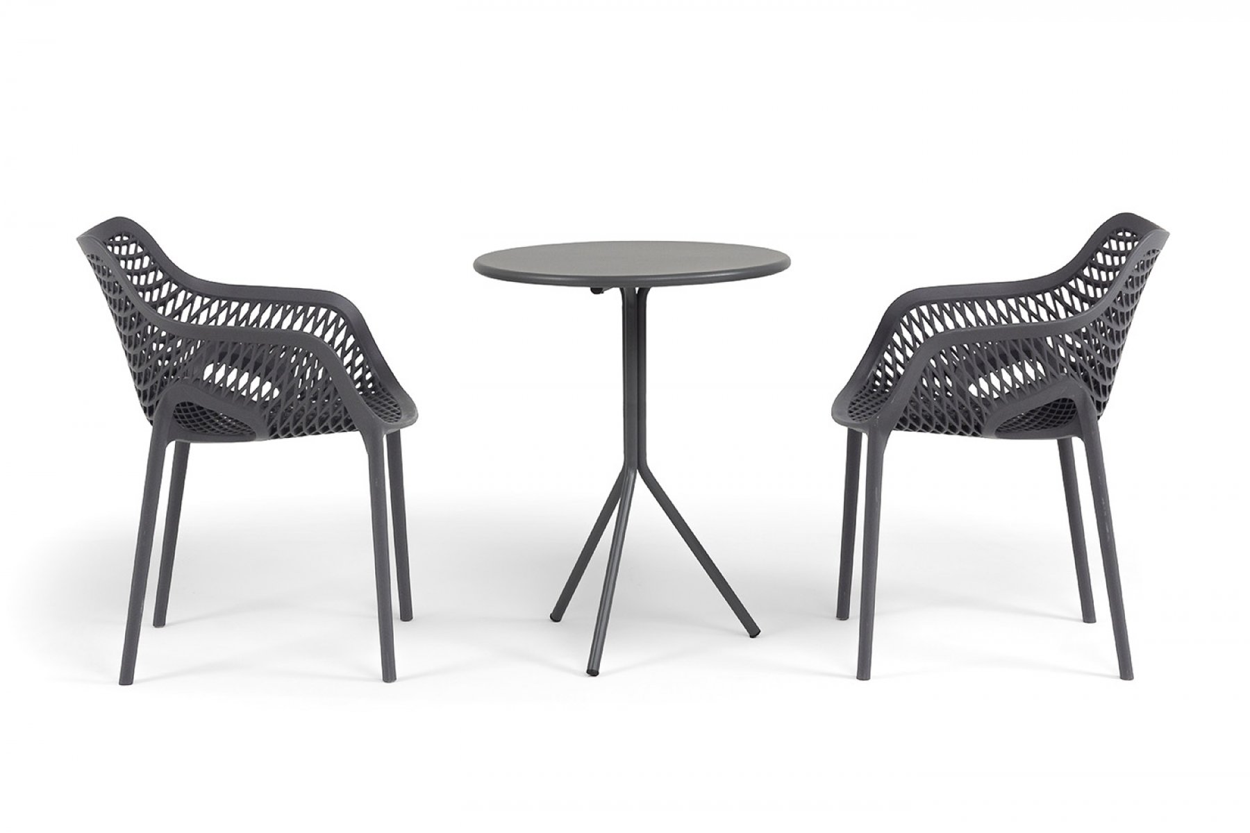 Стулья изготовлены из полипропилена, прочного и стойкого пластика, устойчивого к УФ-излучению, благодаря этому стул сохраняет свой первоначальный вид и не выцветает на солнце даже несмотря на активную эксплуатацию. Цвет - темно-серый. "Мохито" стальной круглый стол Ø60см, цвет темно-серый 1шт. 600Х600Х750, "Беллини" стул пластиковый, цвет темно-серый 2шт. 540Х610Х810,