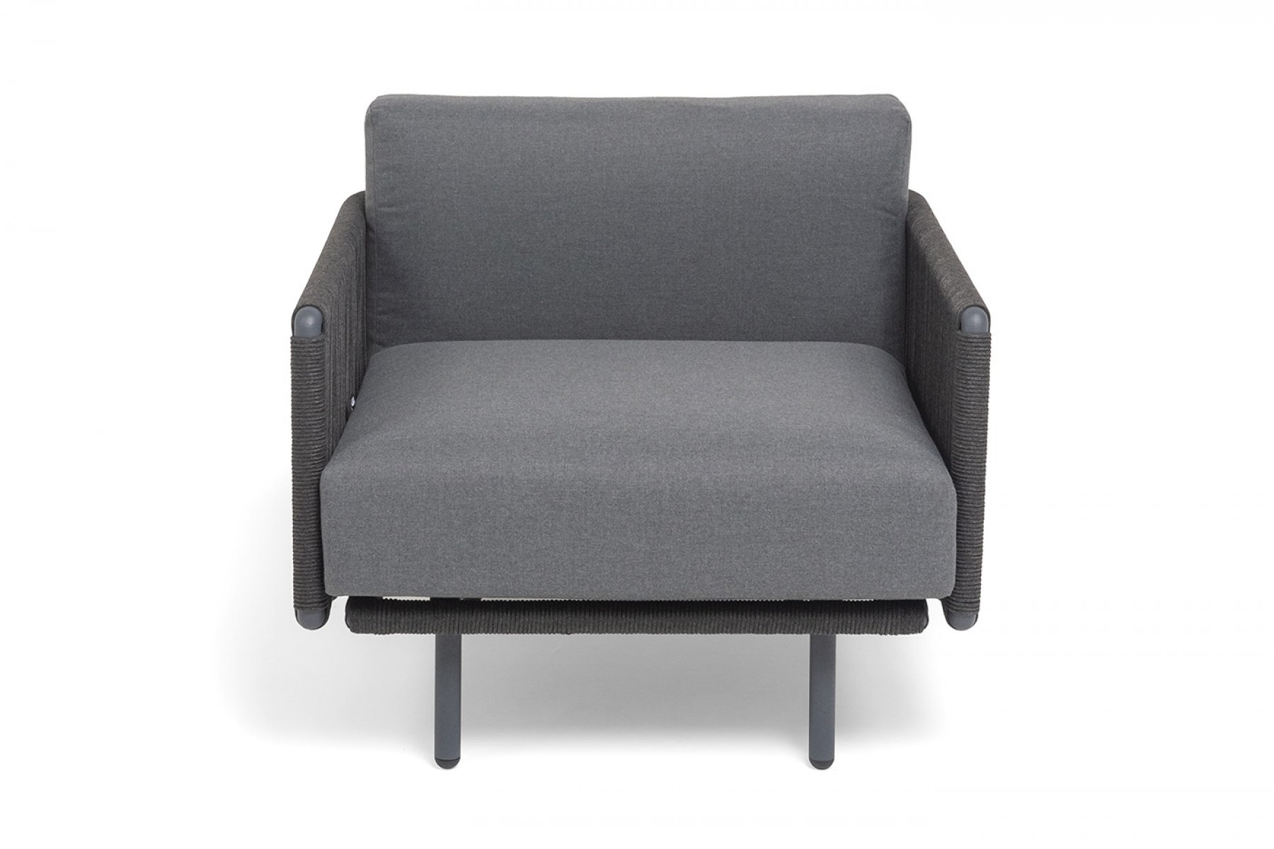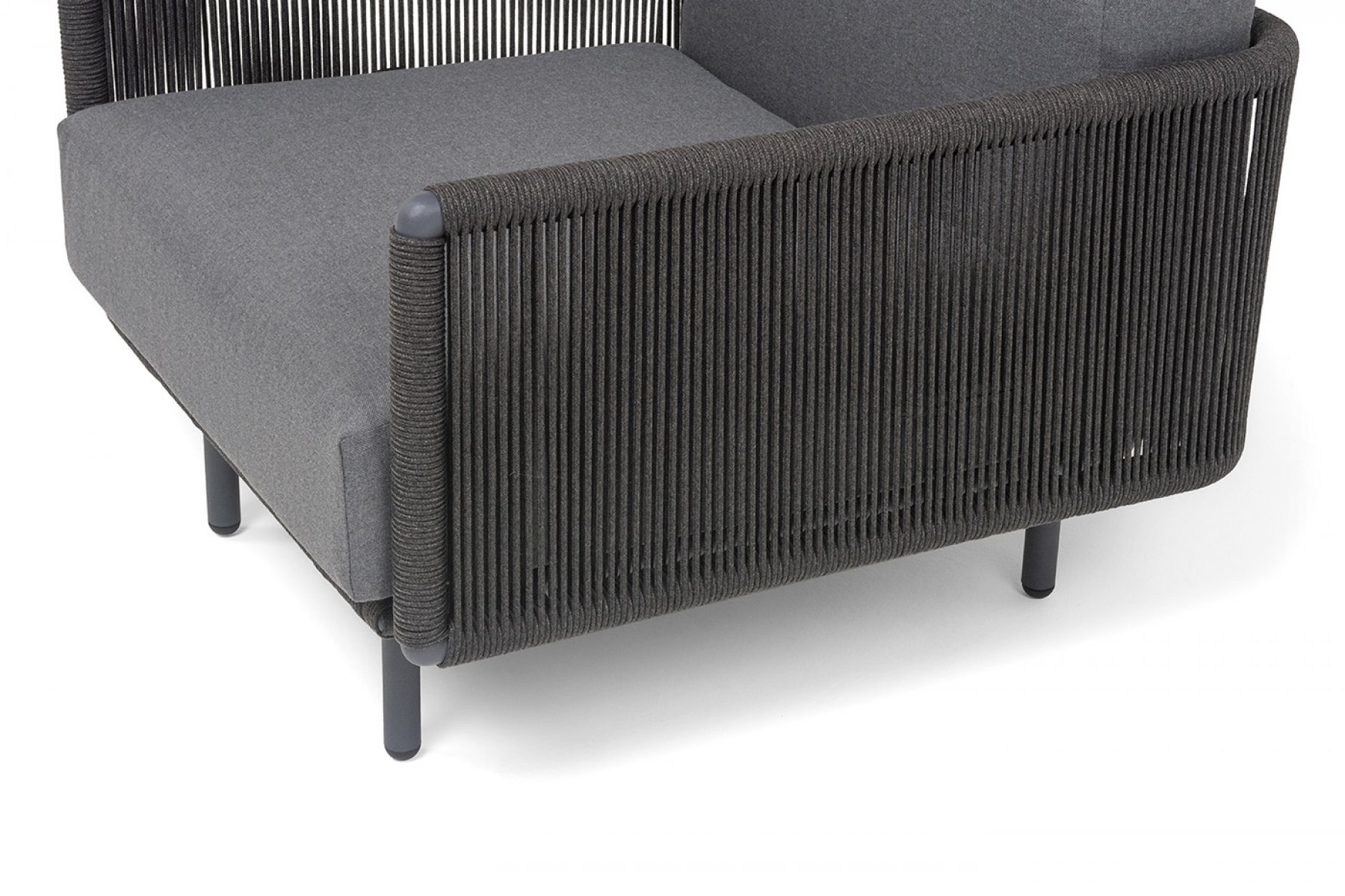 Каркас изготовлен из алюминия и покрыт порошковой краской темно-серого цвета (RAL7024), что повышает устойчивость к атмосферным воздействиям. Боковины каркаса вручную оплетены роупом — эластичными синтетическими лентами, выполненными из прочных полиэфирных волокон.