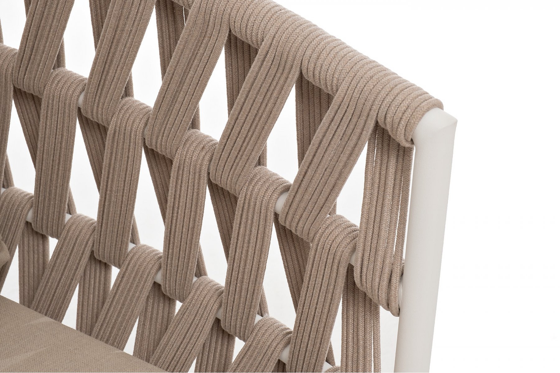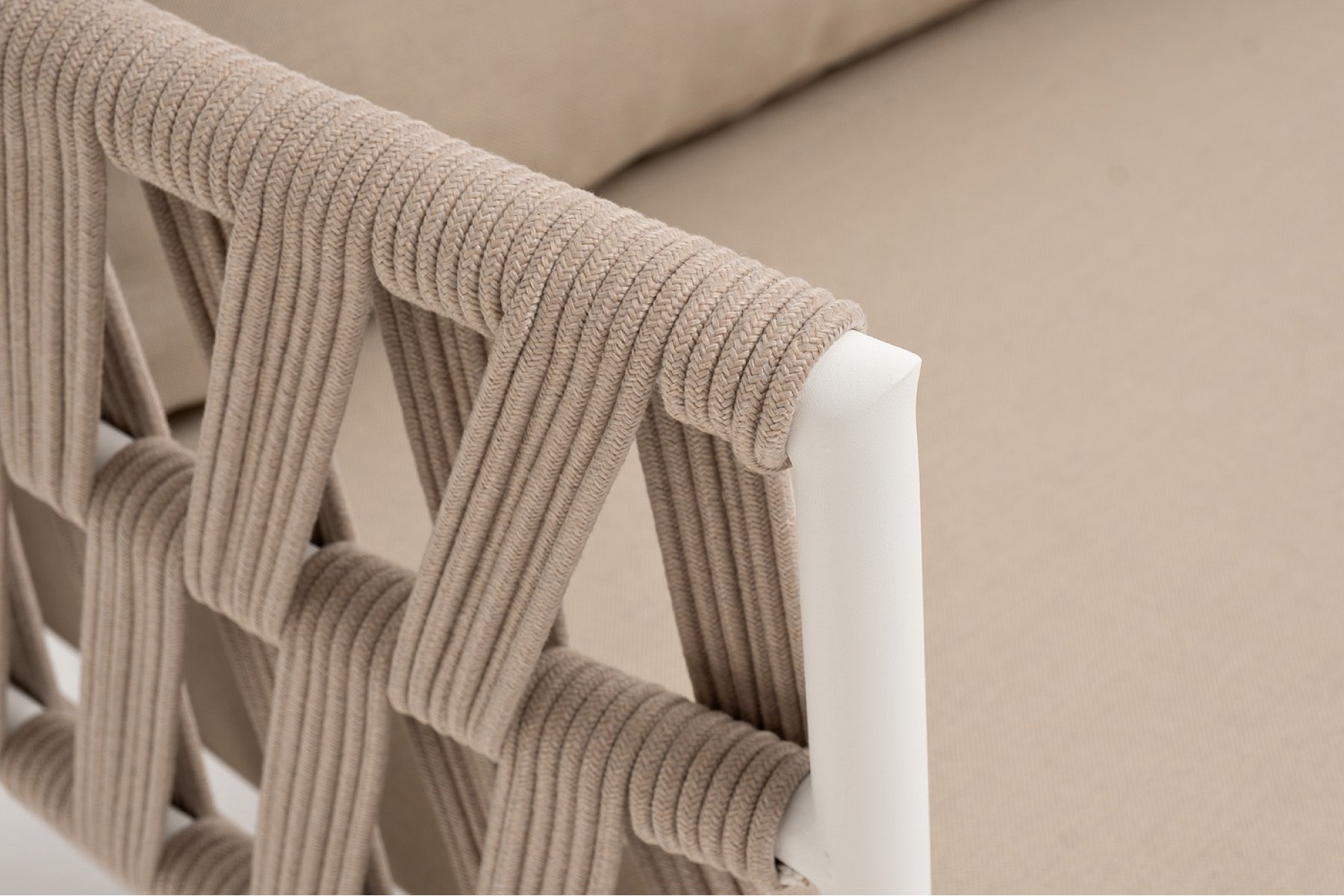 "Диего" диван 2-местный плетеный из роупа, каркас алюминий белый муар, роуп бежевый круглый, ткань бежевая 052