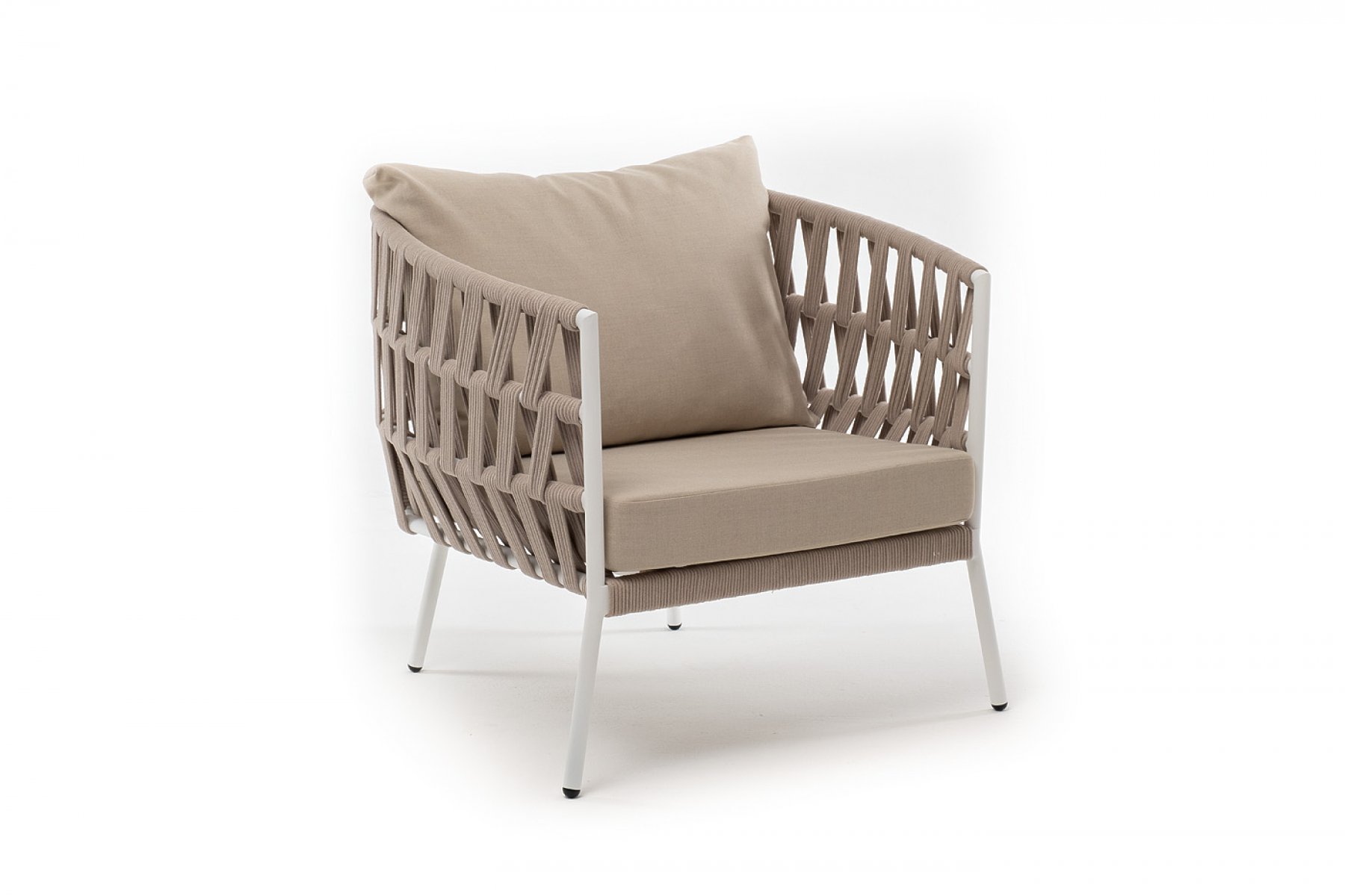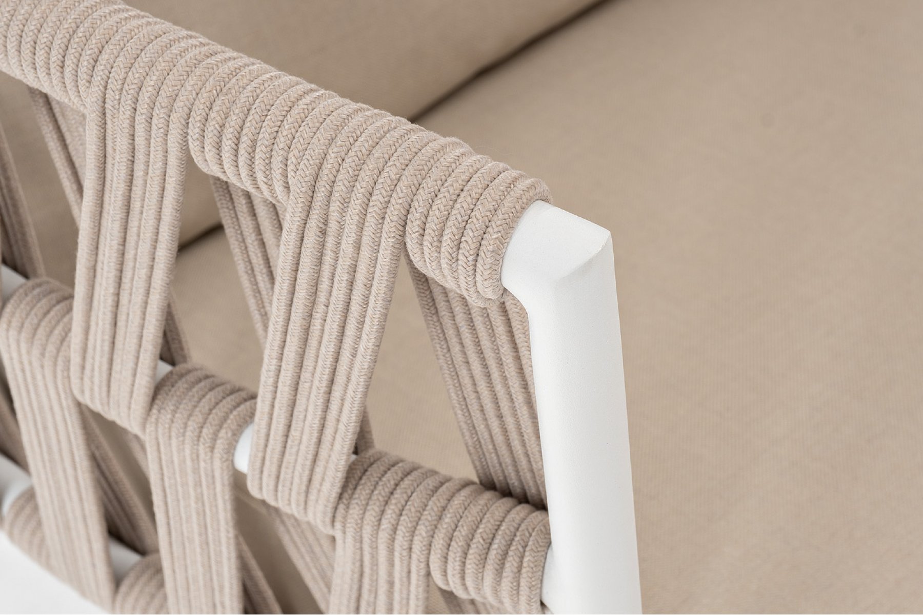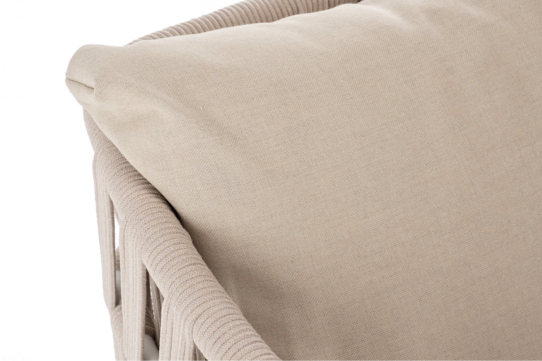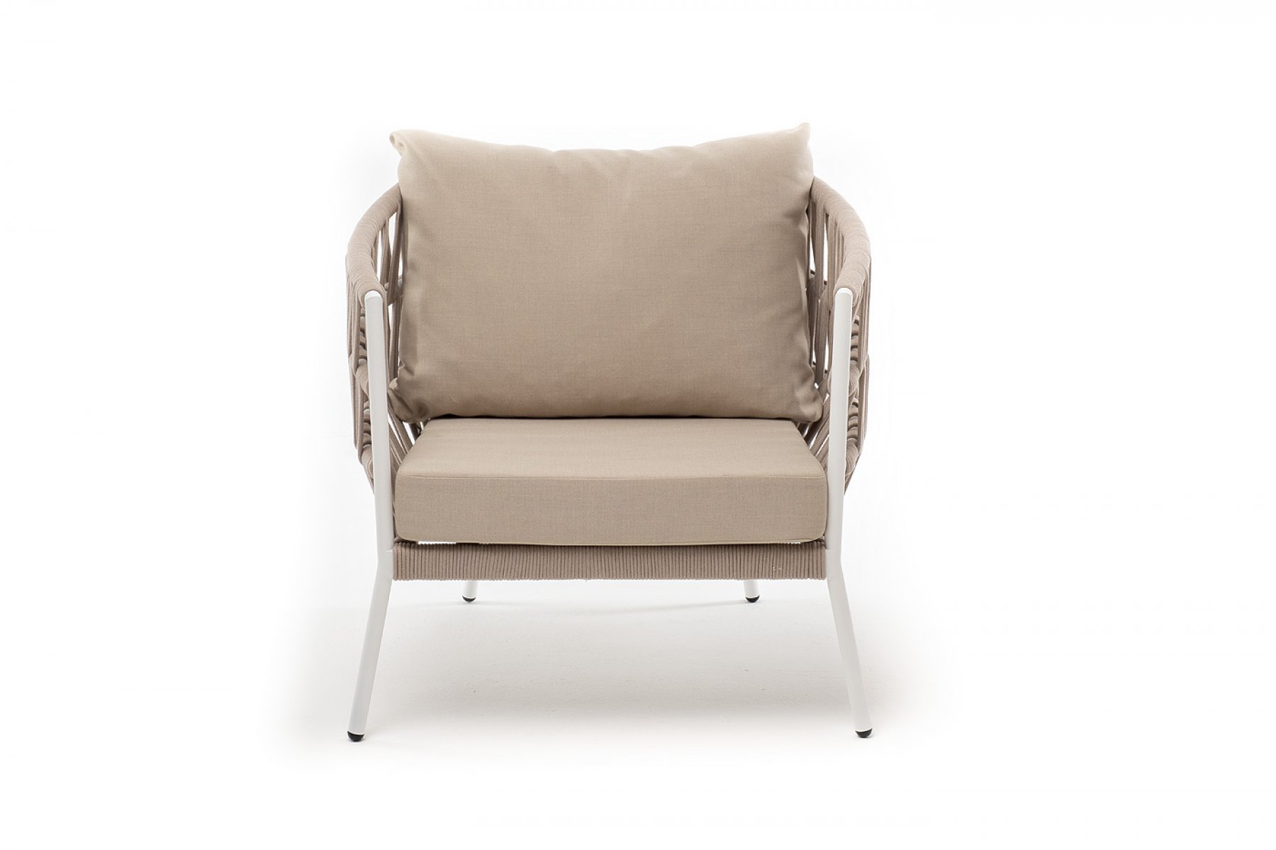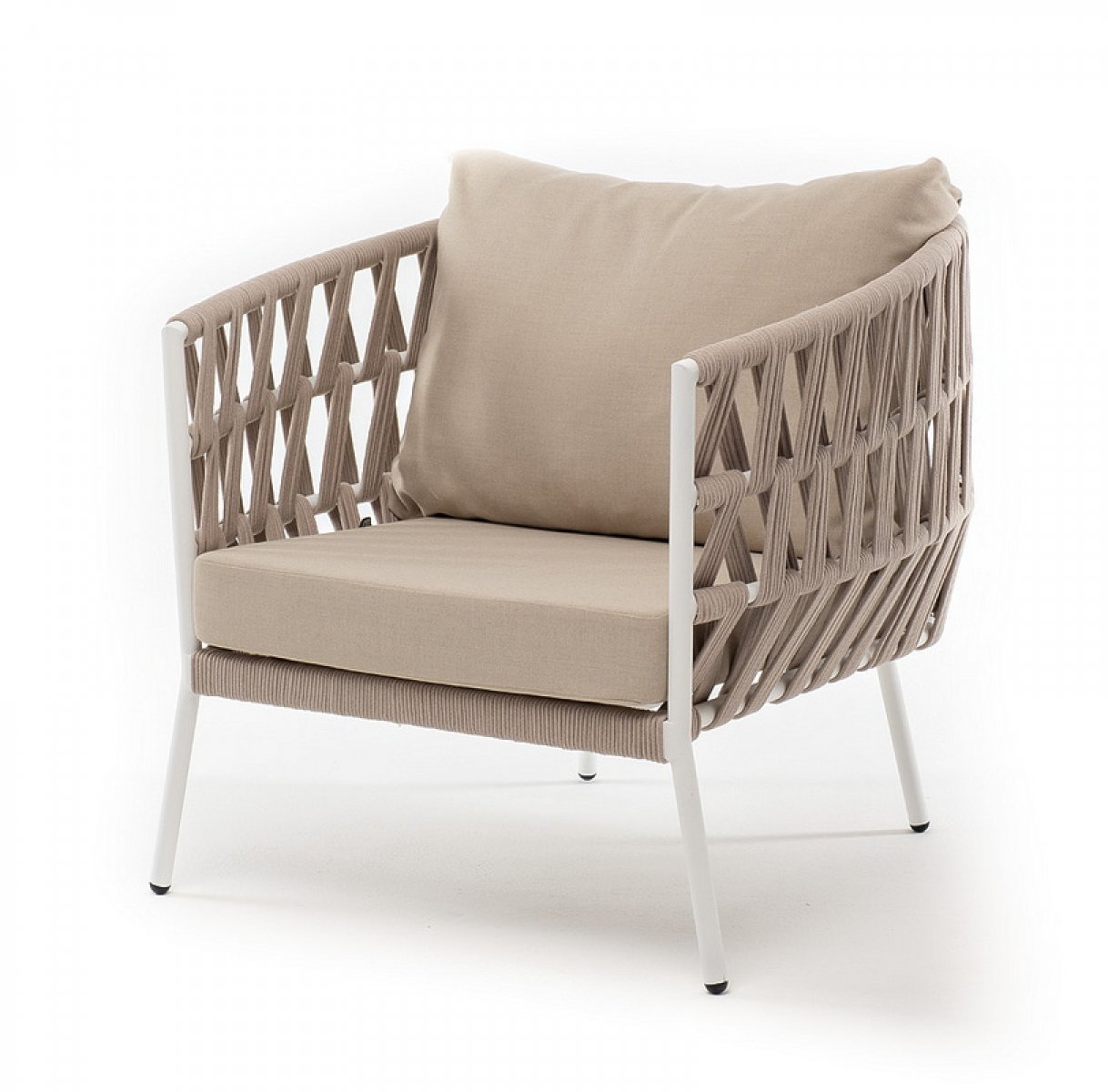 Кресло имеет алюминиевый каркас, окрашенный порошковой краской в белый цвет. Боковины каркаса вручную оплетены роупом - эластичными синтетическими лентами, изготовленными из высокопрочных полиэфирных волокон. Цвет оплетки - бежевый.