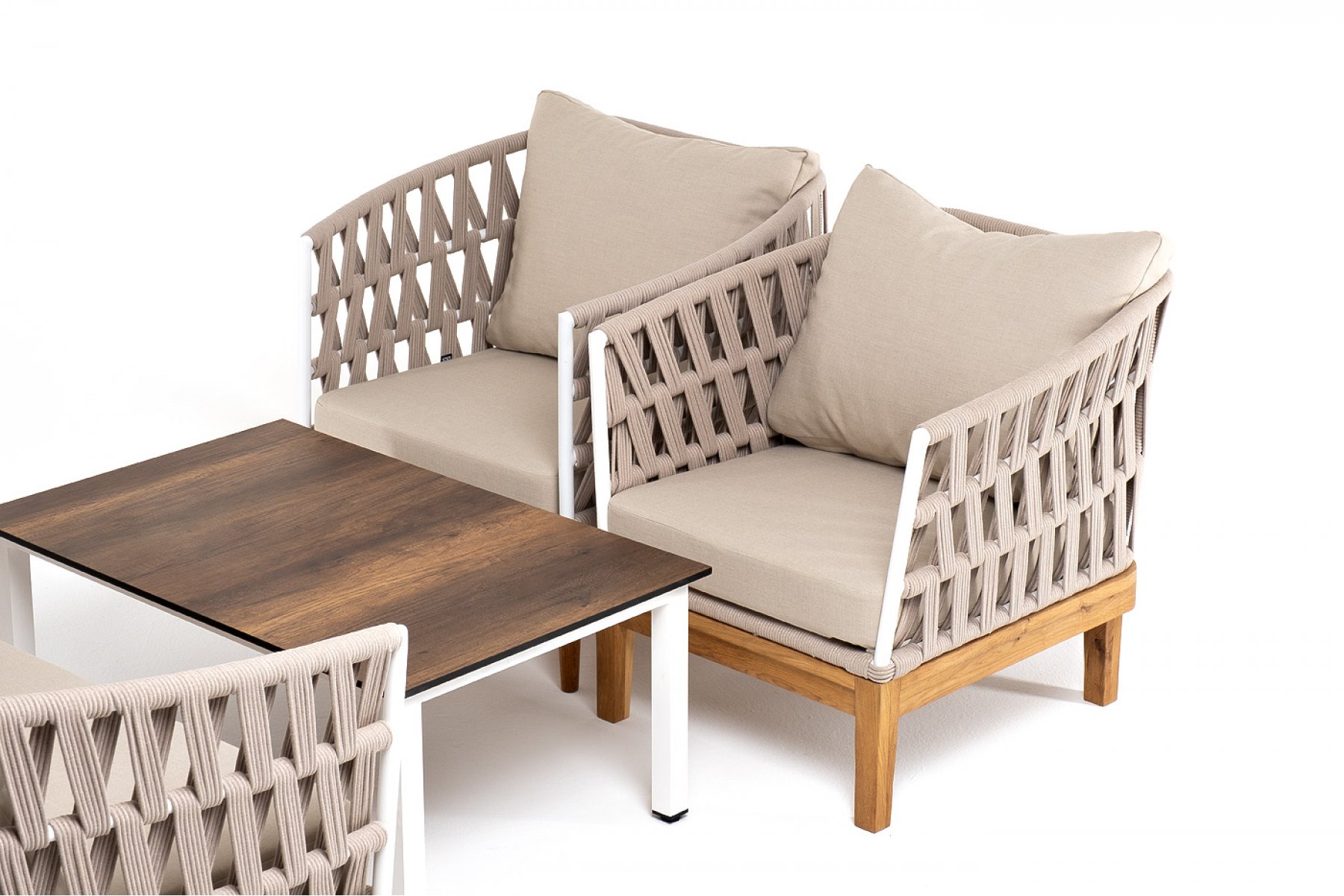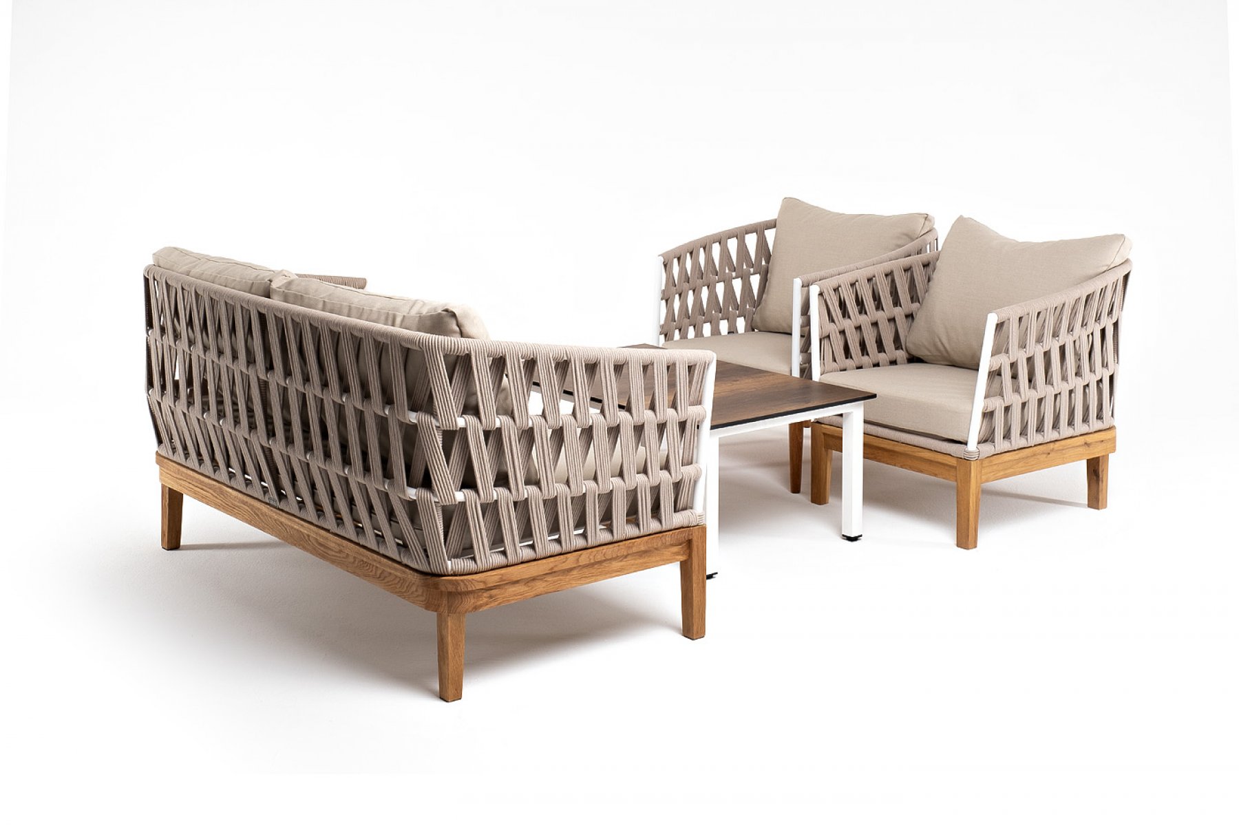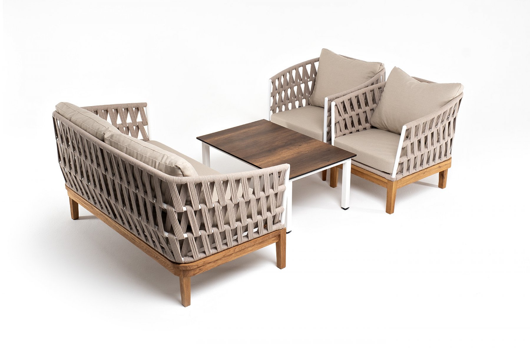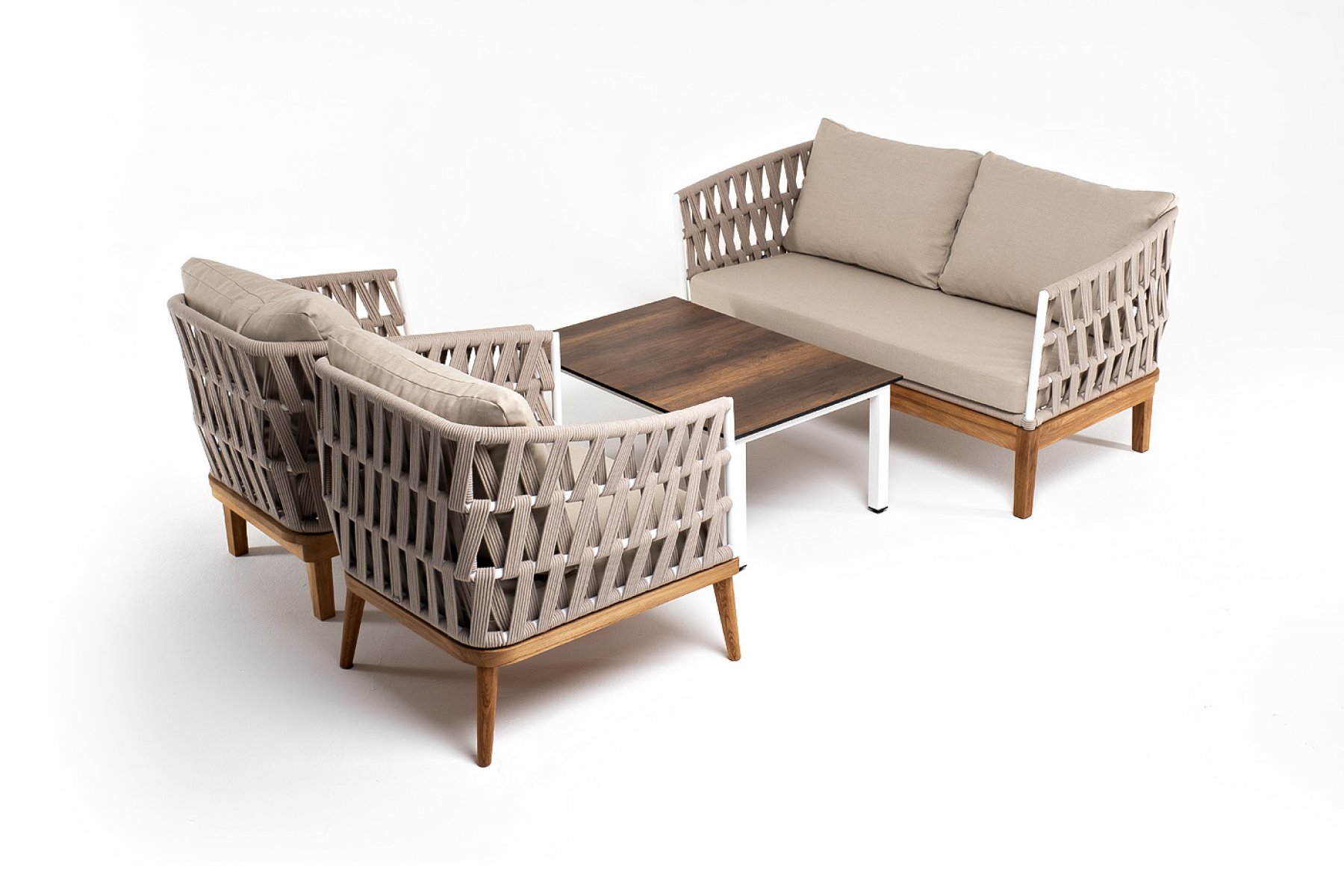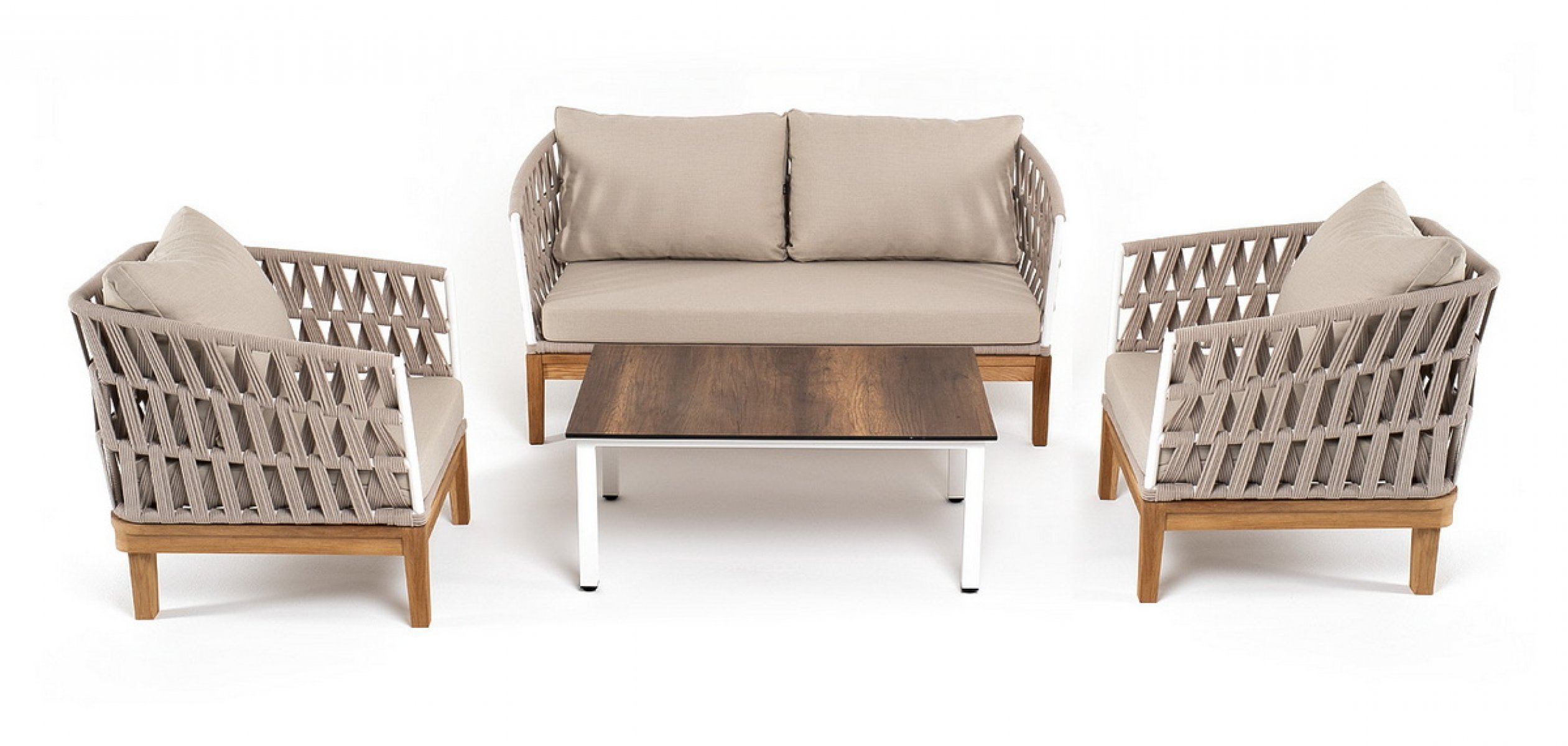 Каркас уличной мебели выполнен из дуба. Его дополняет бежевая оплетка, изготовленная на основе эластичных синтетических лент из полиэфирных волокон высо "Канны" журнальный столик из HPL 90х60, H40, каркас белый, цвет столешницы "дуб" 1шт. 900Х600Х400, "Диего" диван 2-местный плетеный из роупа, основание дуб, каркас алюминий светло-серый (RAL7035) шагрень, роуп бежевый круглый, ткань бежевая 15052 1шт. 1 580Х720Х800, "Диего" кресло плетеное из роупа, основание дуб, каркас алюминий светло-серый (RAL7035) шагрень, роуп бежевый круглый, ткань бежевая 15052 2шт. 770Х720Х800,
