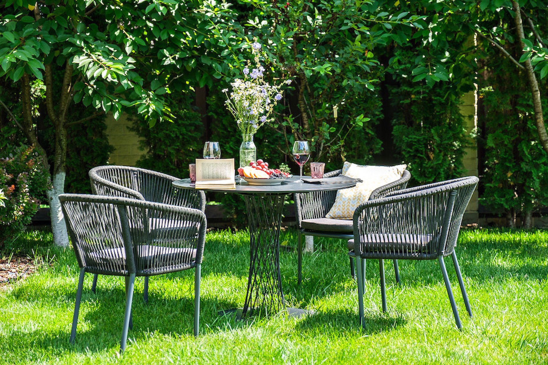 4 кресла из коллекции «Марсель», выполненных из алюминиевого каркаса и ручной оплетки роупом. Это эластичные синтетические ленты из высокопрочных полиэфирных волокон, представлены в темно-сером цвете.
