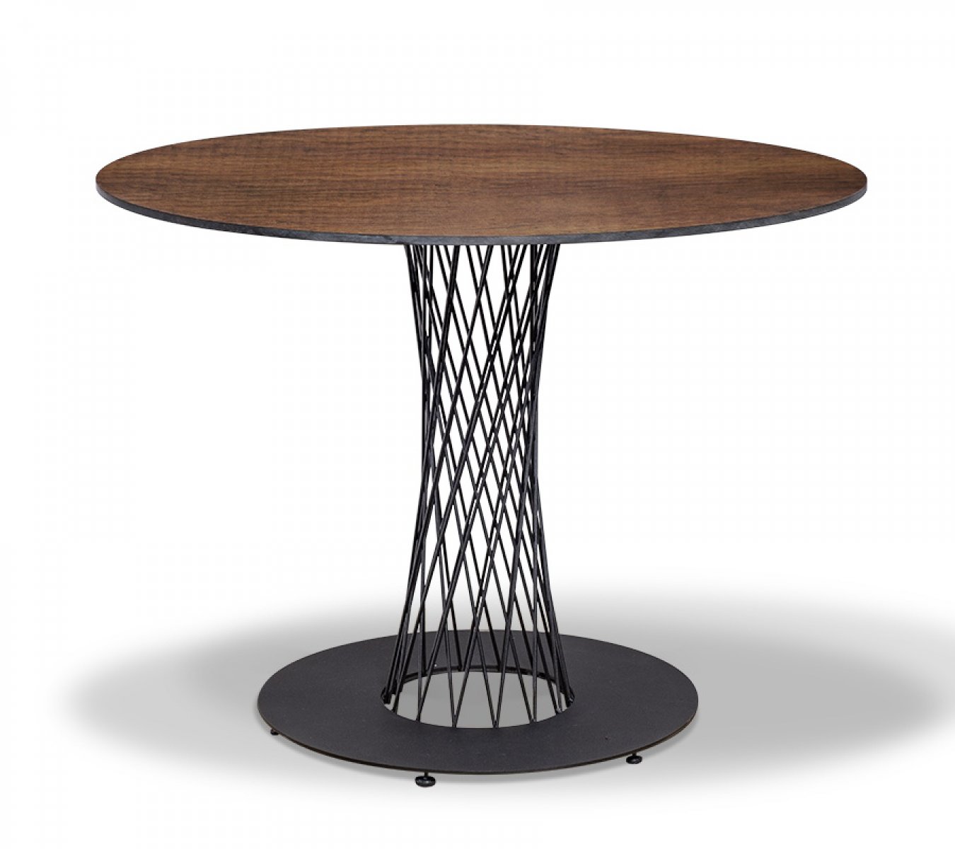 Круглый обеденный стол «Диего» с подстольем, произведенным посредством вертикального плетения из надежных металлических прутьев, выкрашенных в черный цвет.