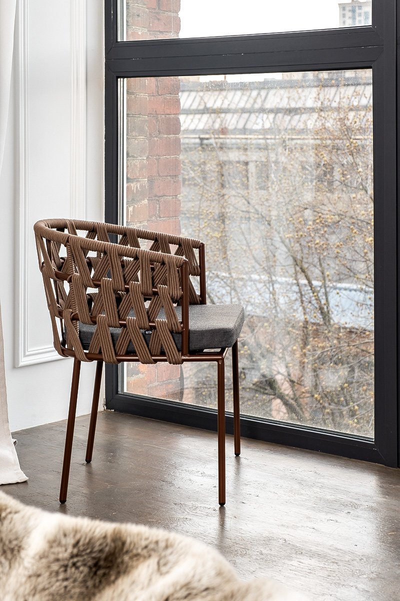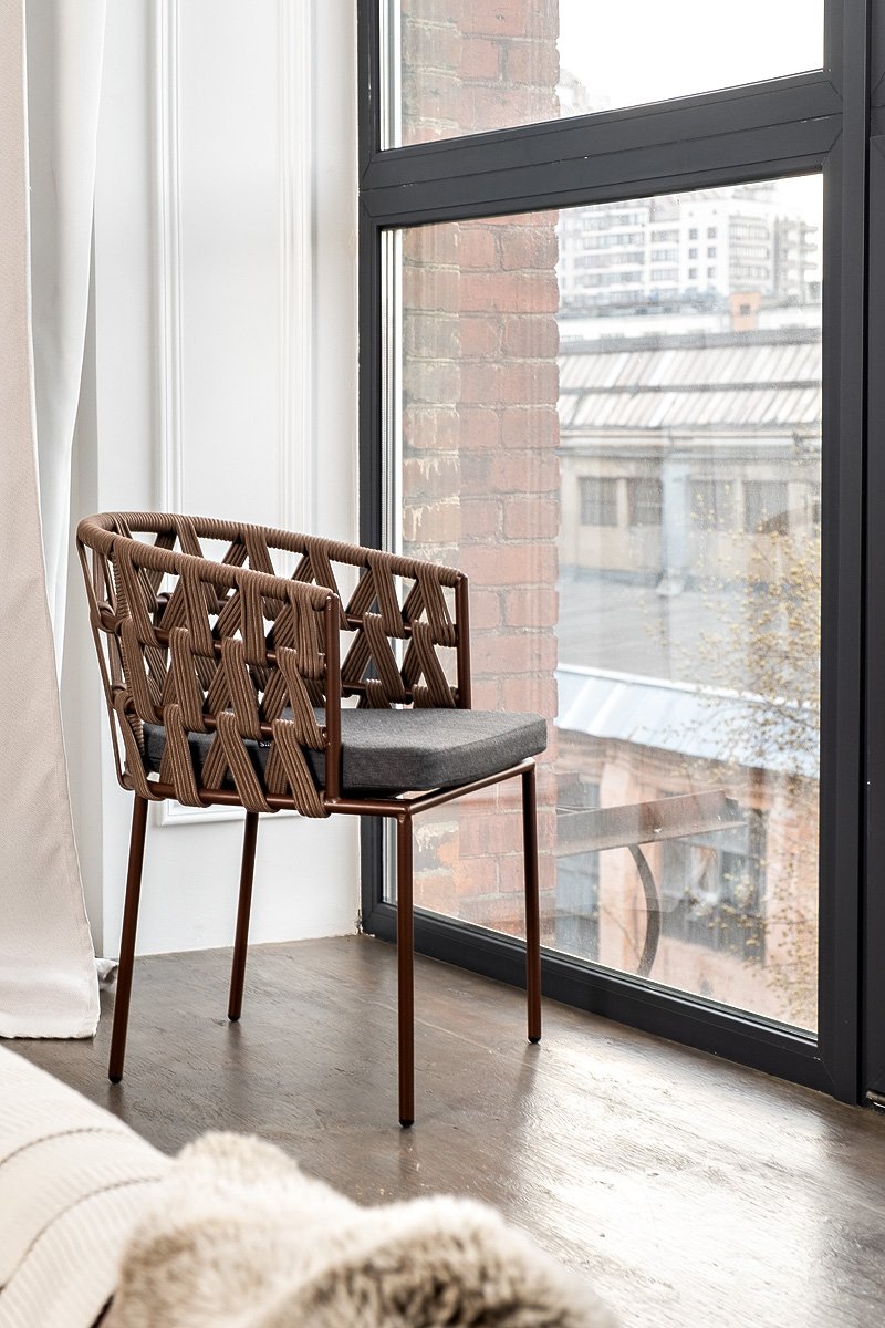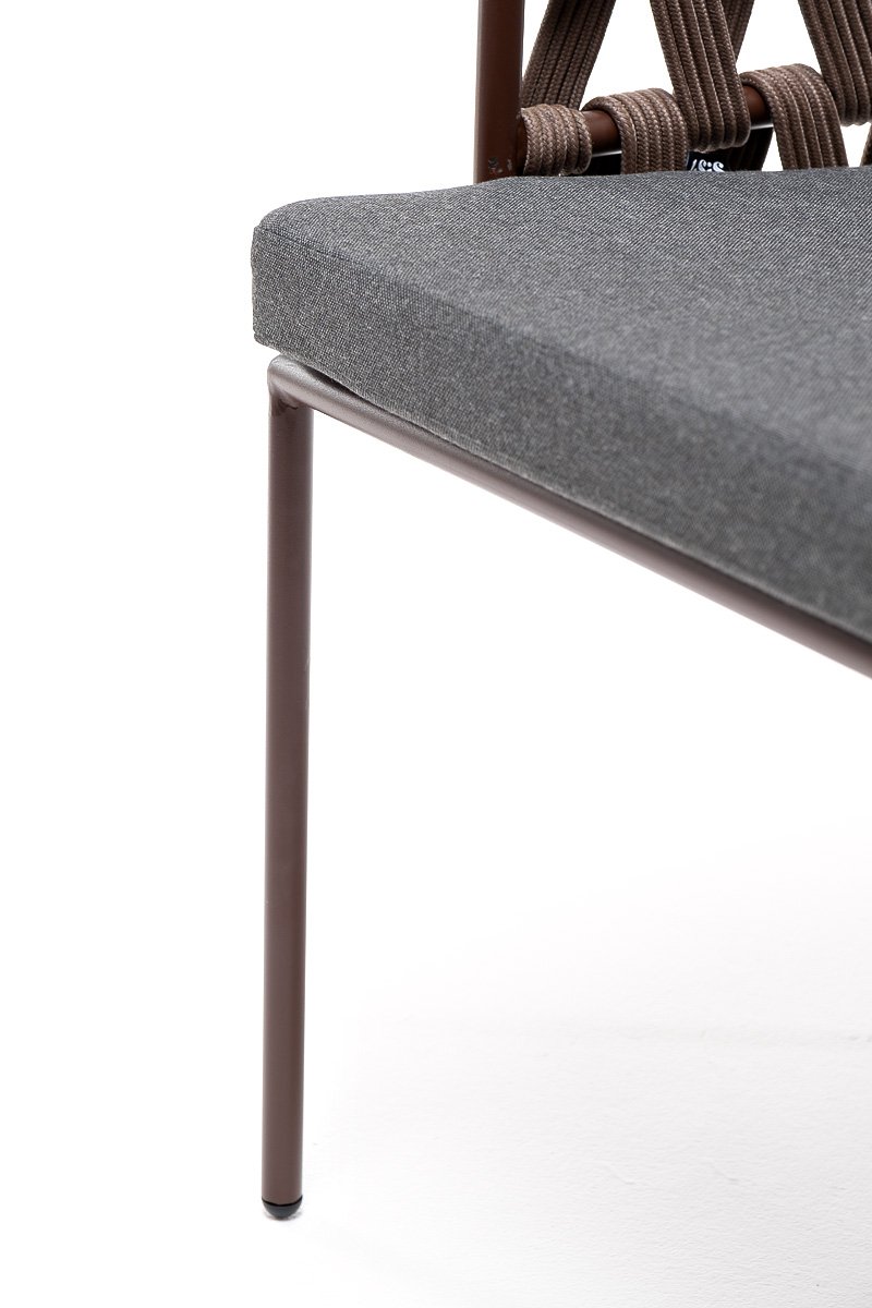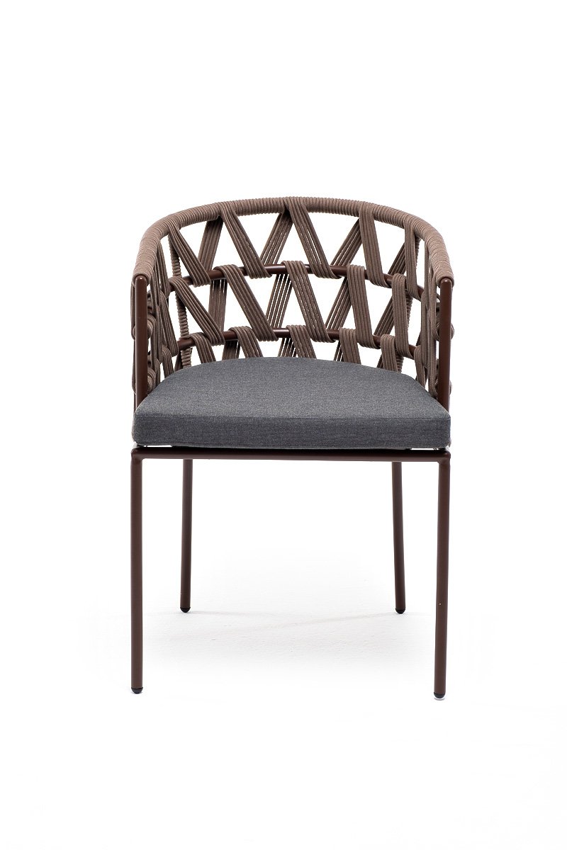 "Диего" стул плетеный из роупа, каркас из стали коричневый (RAL8016) муар, роуп коричневый круглый, ткань темно-серая 027