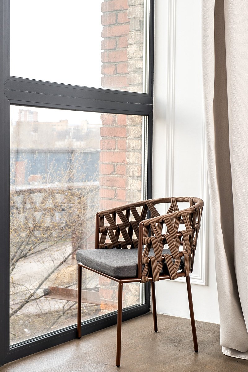 Каркас вручную оплетен коричневым (RAL8016) роупом - эластичными синтетическими лентами из высокопрочных полиэфирных волокон.