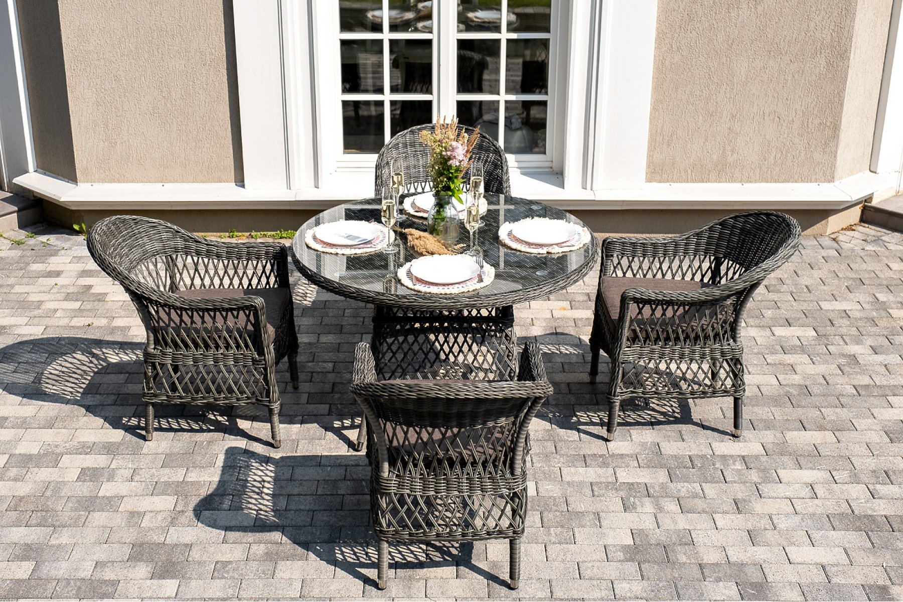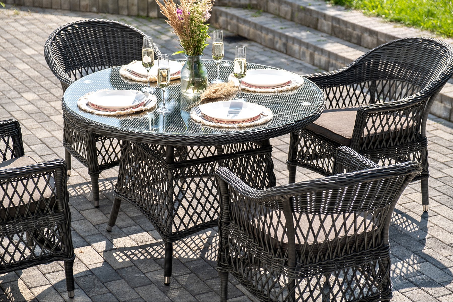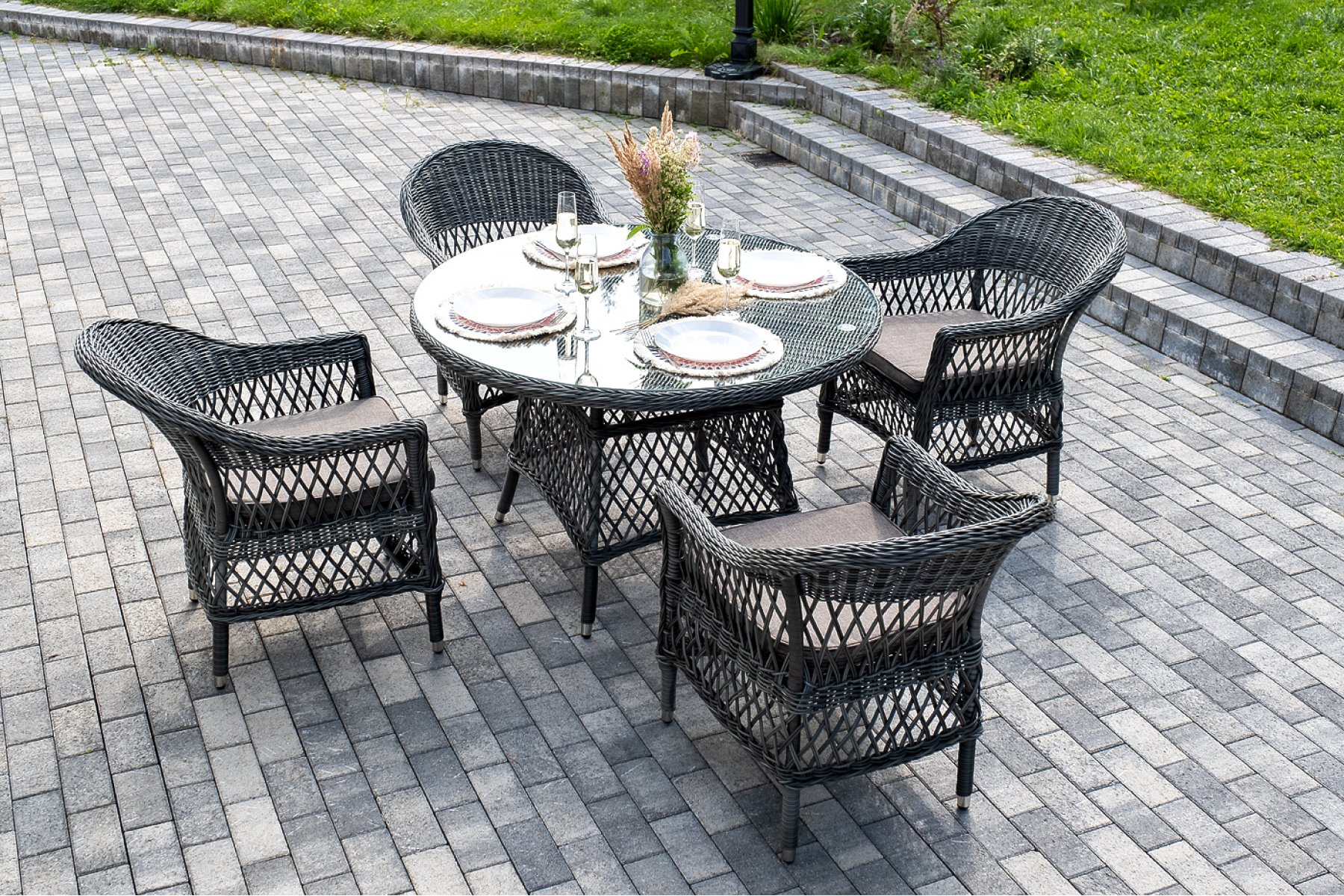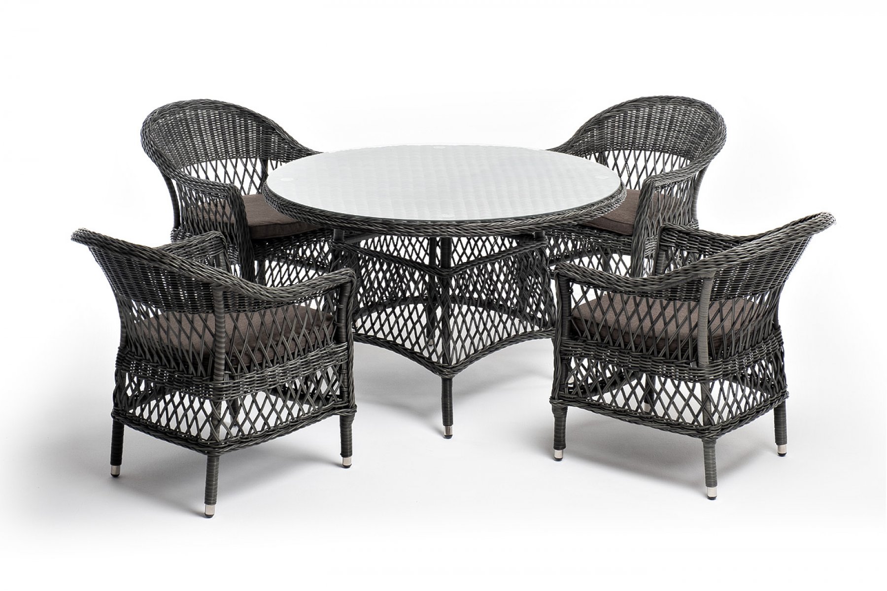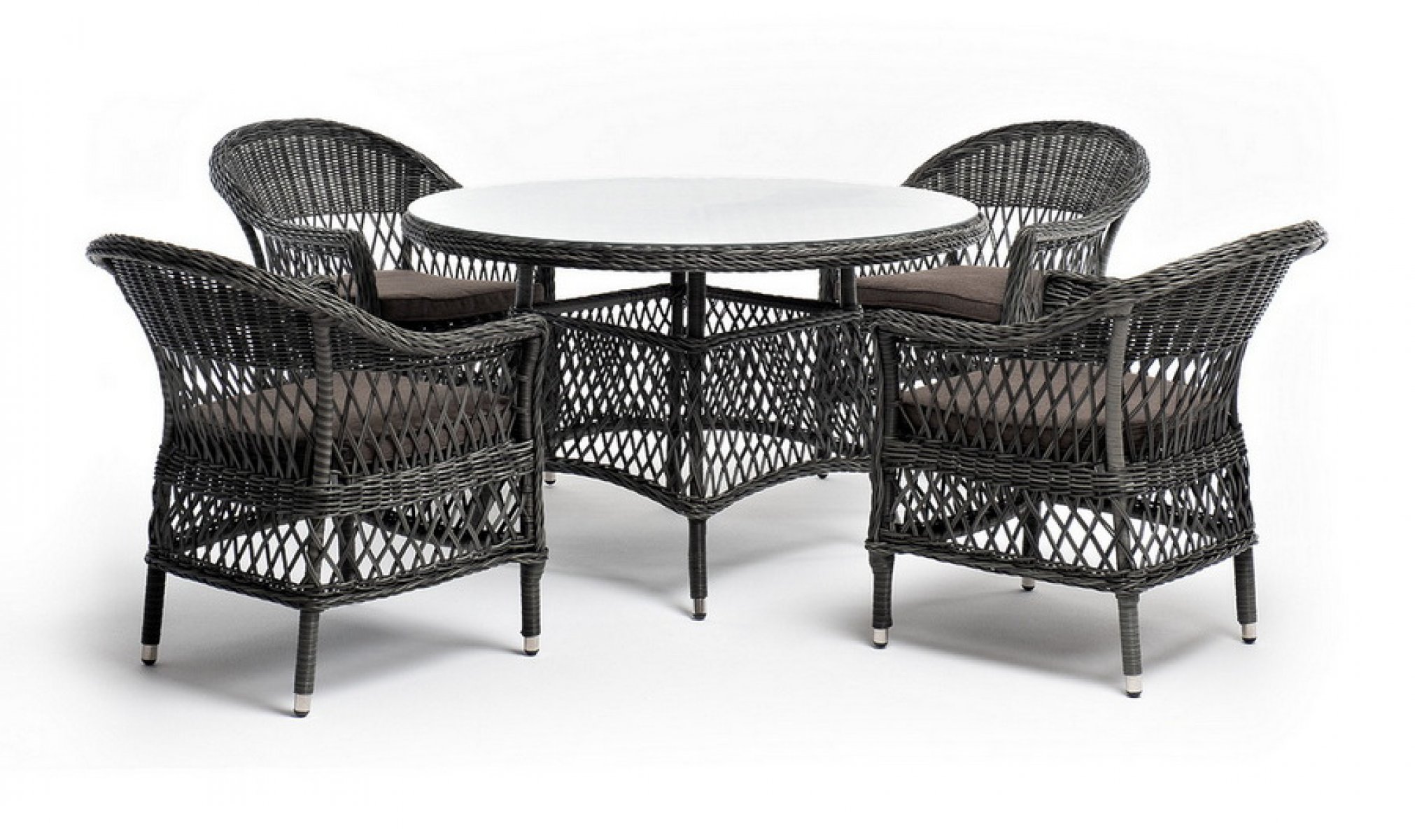 Вся мебель изготовлена из алюминия, поэтому ее очень легко перемещать. Декоративное покрытие выполнено из долговечного искусственного ротанга, устойчивого к перепадам температур и переменам погоды. Столешница изготовлена из прочного закаленного стекла 5 мм, кресла уком "Сицилия" плетеный стул из искусственного ротанга, цвет графит 4шт. 590Х640Х820, "Эспрессо" плетеный круглый стол, диаметр 118 см, цвет графит 1шт. 1 180Х1 180Х750,