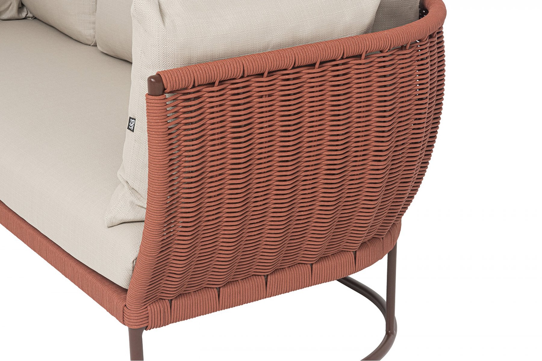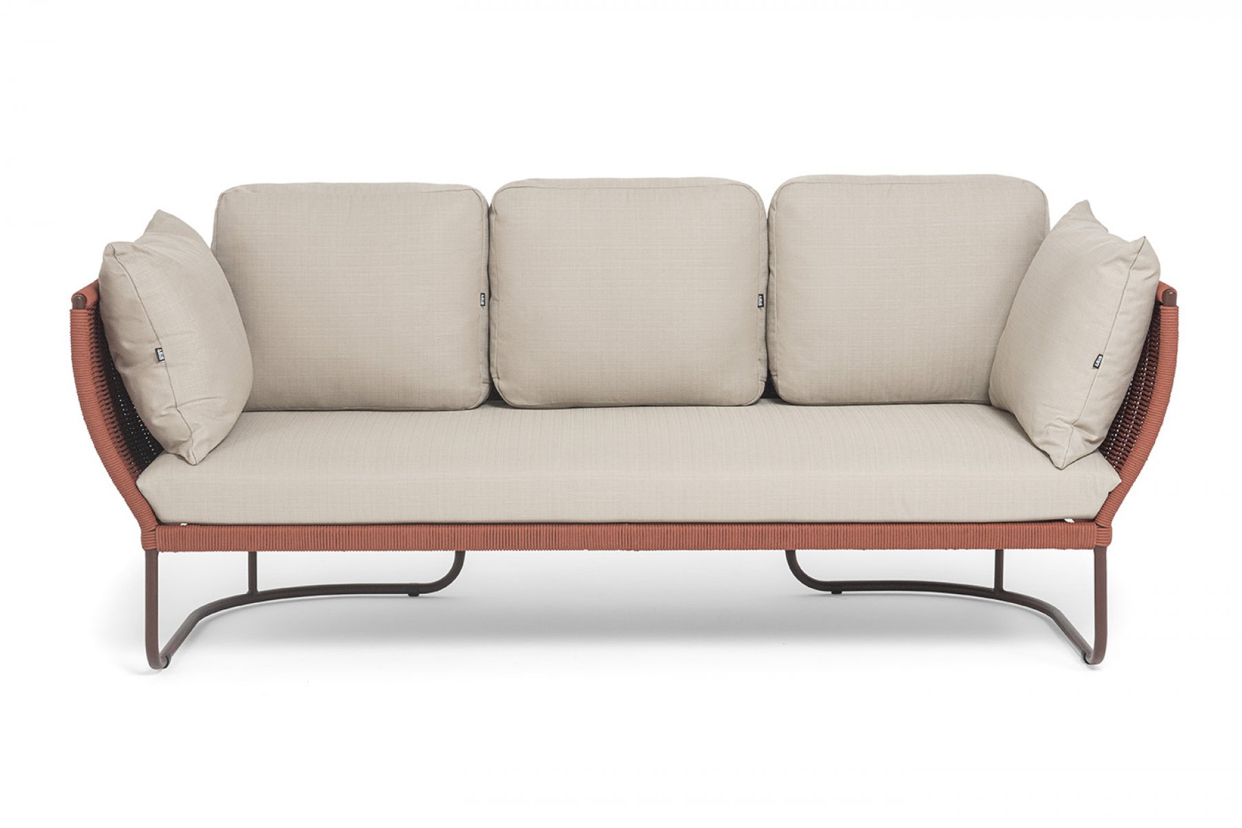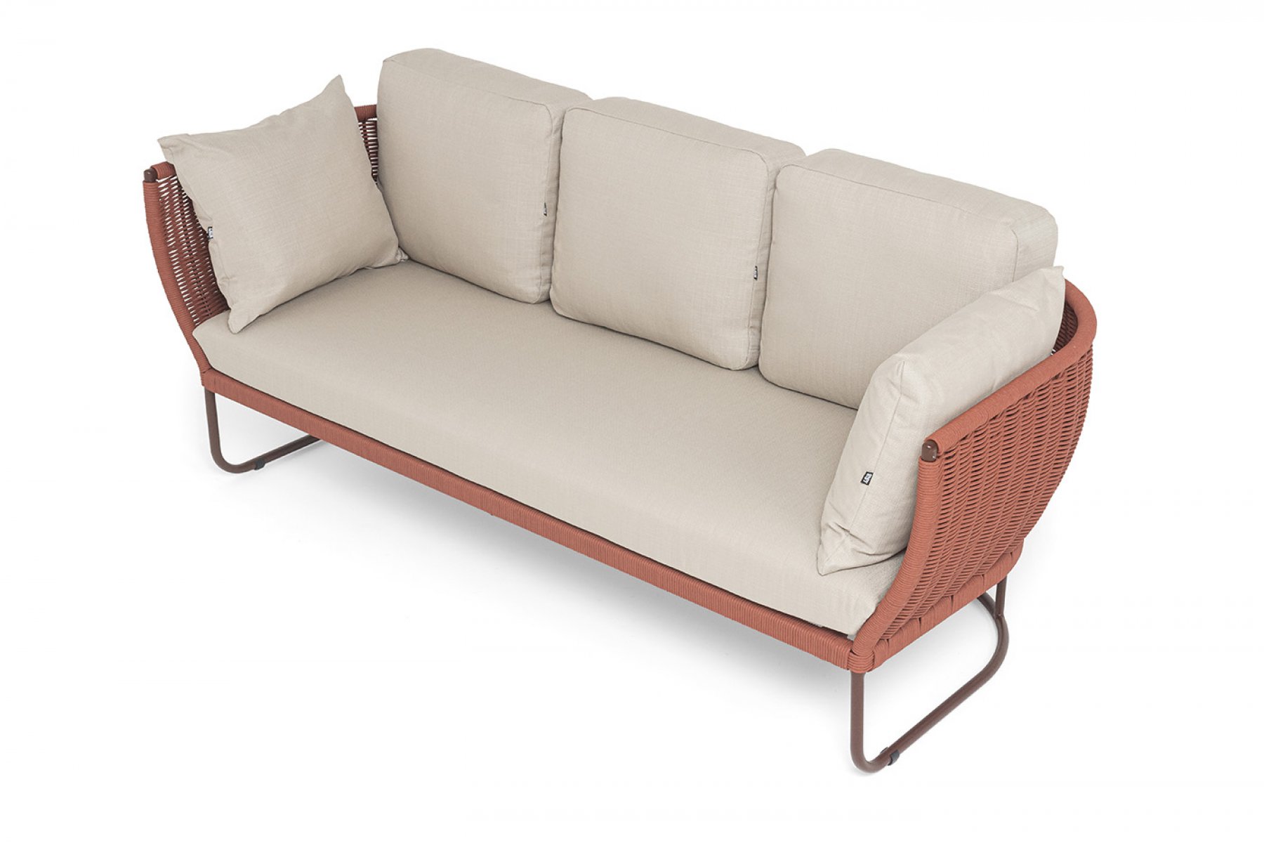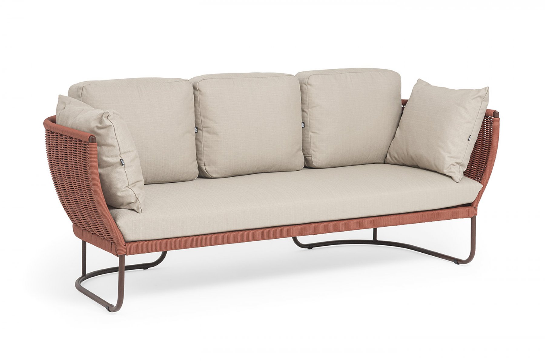 "Фиджи" диван 3-местный плетеный из роупа, каркас алюминий коричневый (RAL8016) муар, роуп красный (8372) круглый tex, ткань Mossle бежевая
