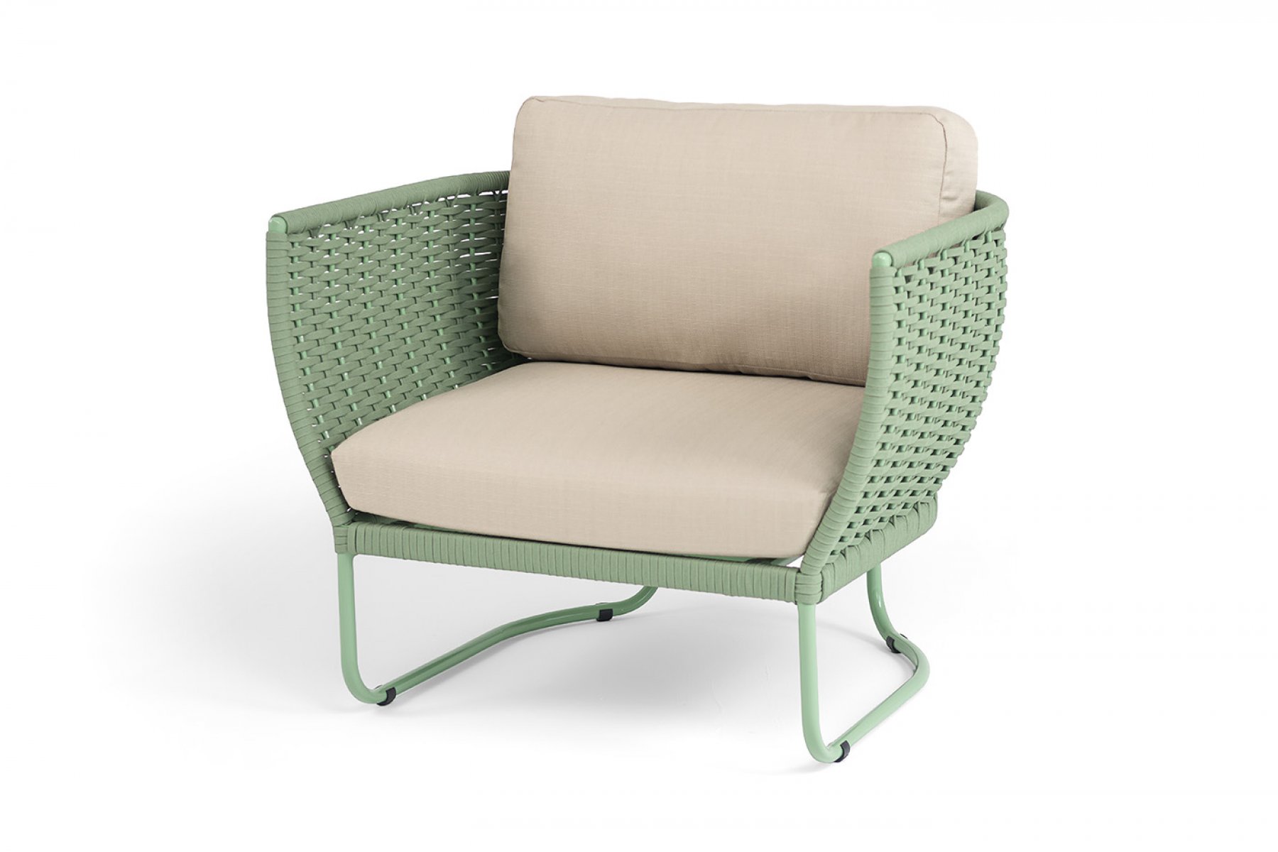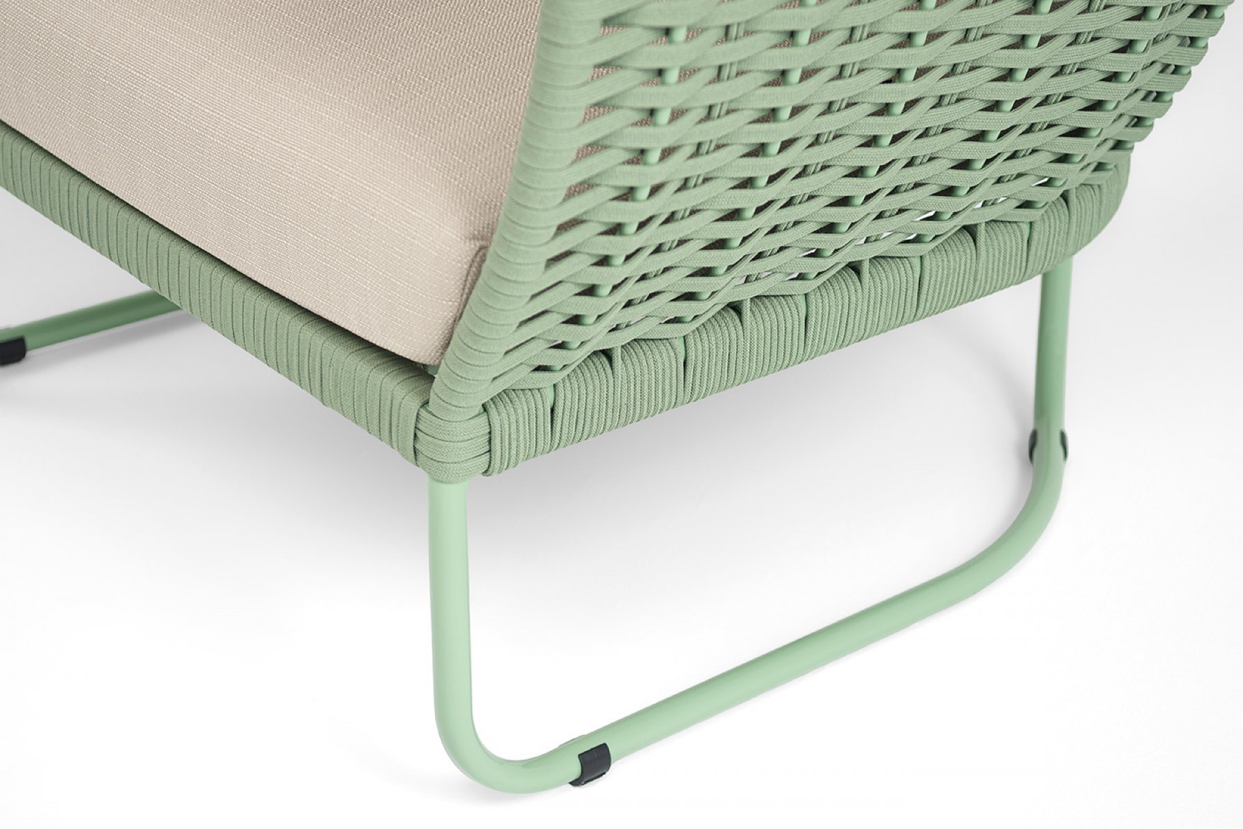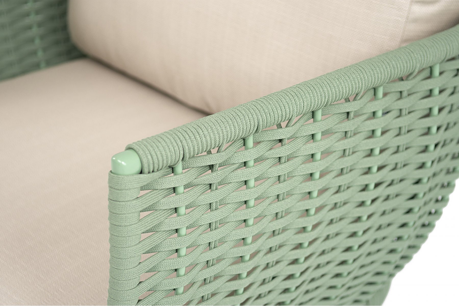 "Фиджи" кресло плетеное из роупа, каркас алюминий (RAL6021) глянец, роуп зеленый (4204) круглый tex/KT18-0024, 15 мм tex, ткань Mossle бежевая