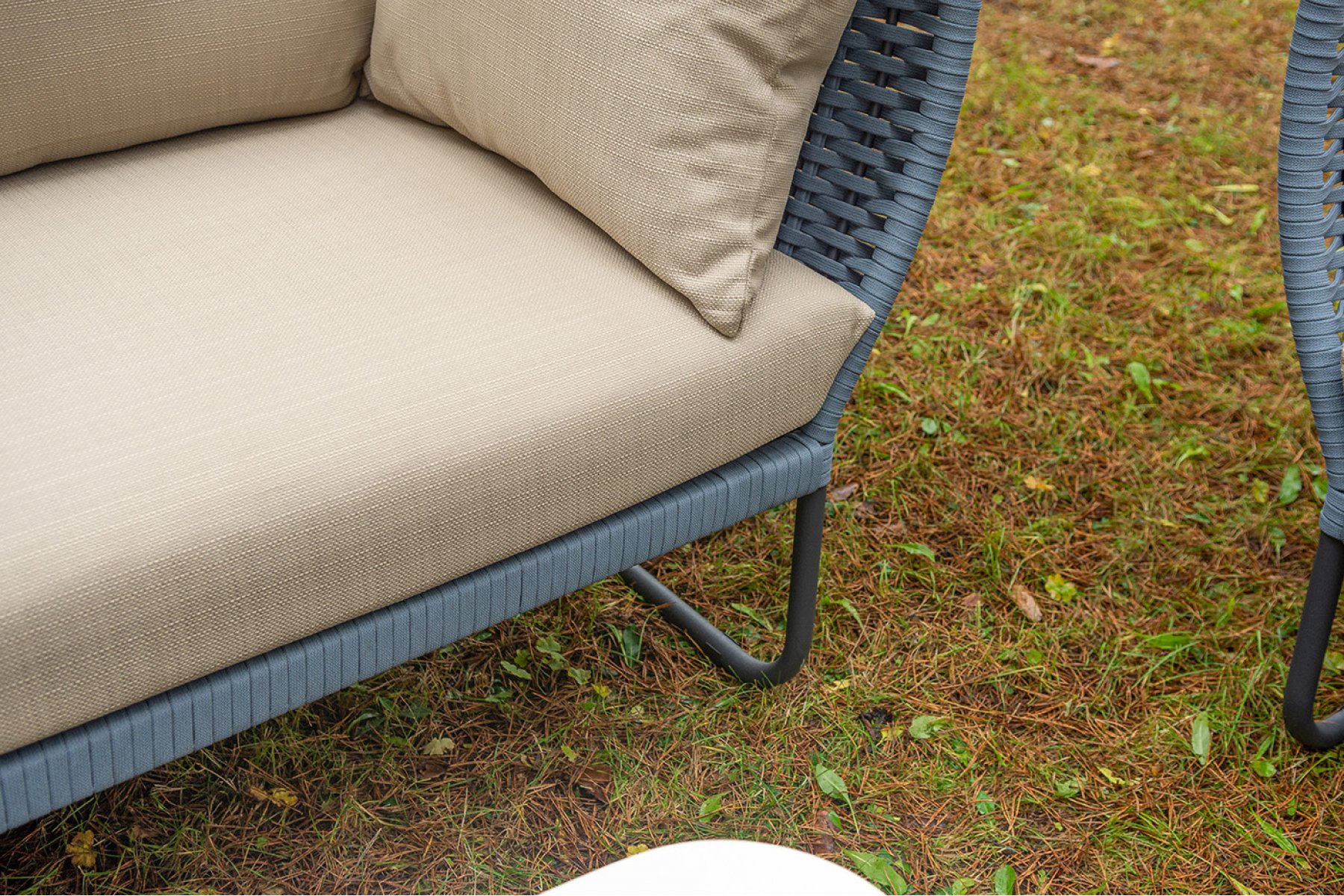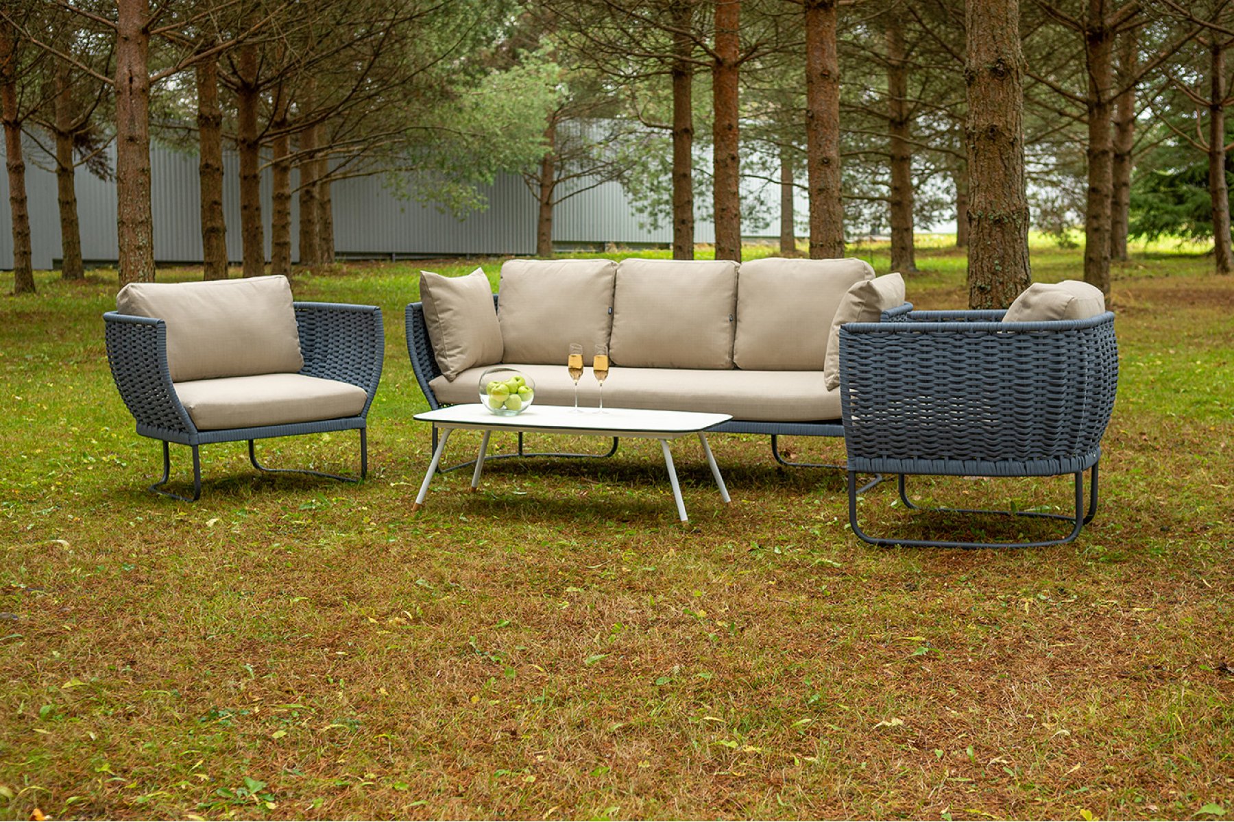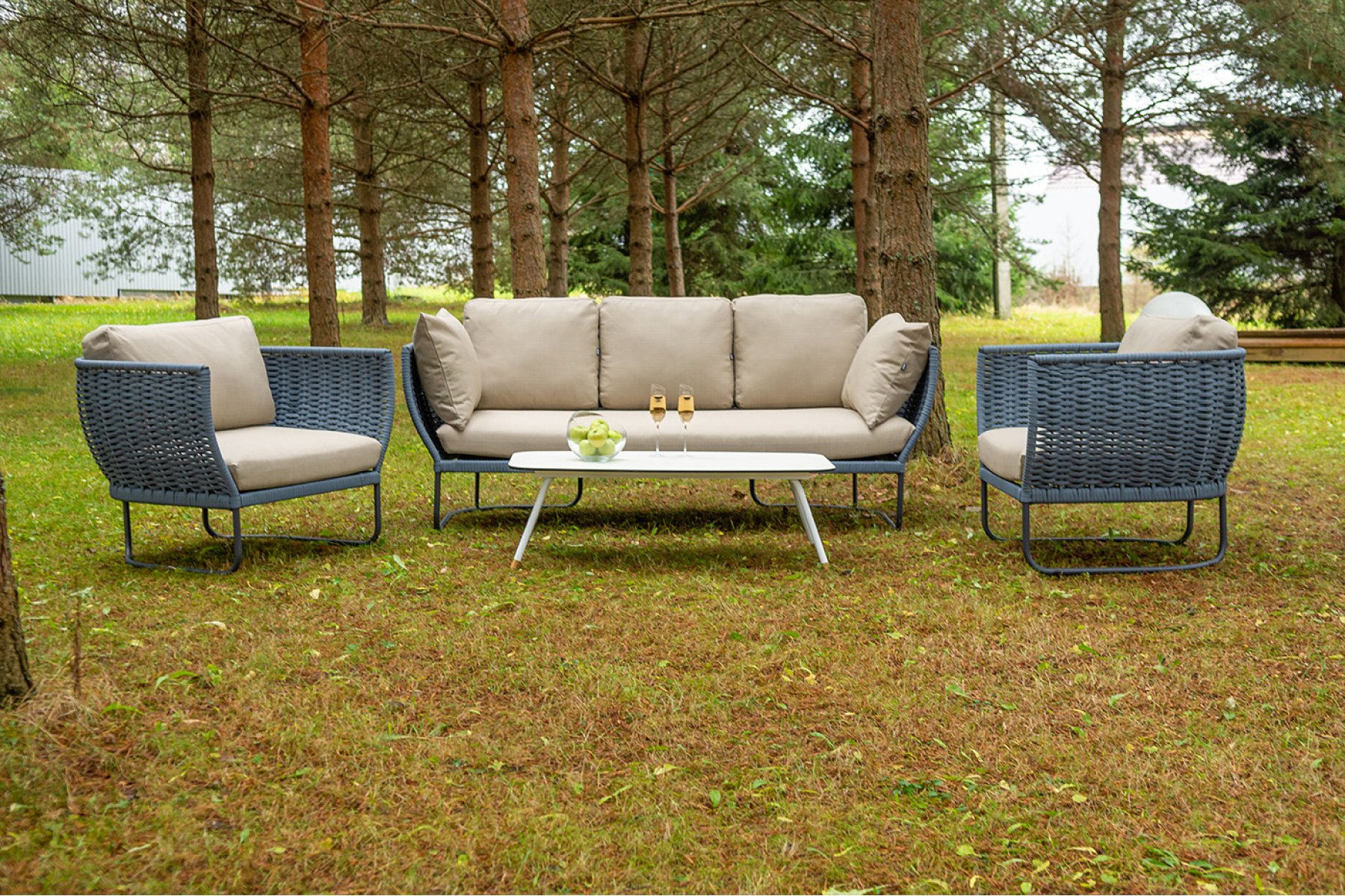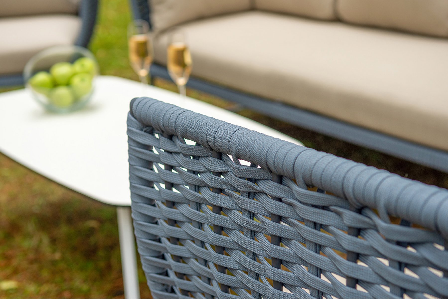 Боковины дивана и кресел вручную оплетены синими синте "Фиджи" диван 3-местный плетеный из роупа, каркас алюминий темно-серый (RAL7024) муар, роуп синий (KT18-0014) 15 мм tex, ткань Mossle бежевая 11шт. 2 140Х900Х790, "Фиджи" кресло плетеное из роупа, каркас алюминий темно-серый (RAL7024) муар, роуп синий (KT18-0014) 15 мм tex, ткань Mossle бежевая 2шт. 1 070Х920Х610, "Диего" журнальный стол из HPL 120х60 H40, каркас белый муар, цвет "молочный" 1шт. 1 200Х600Х400,
