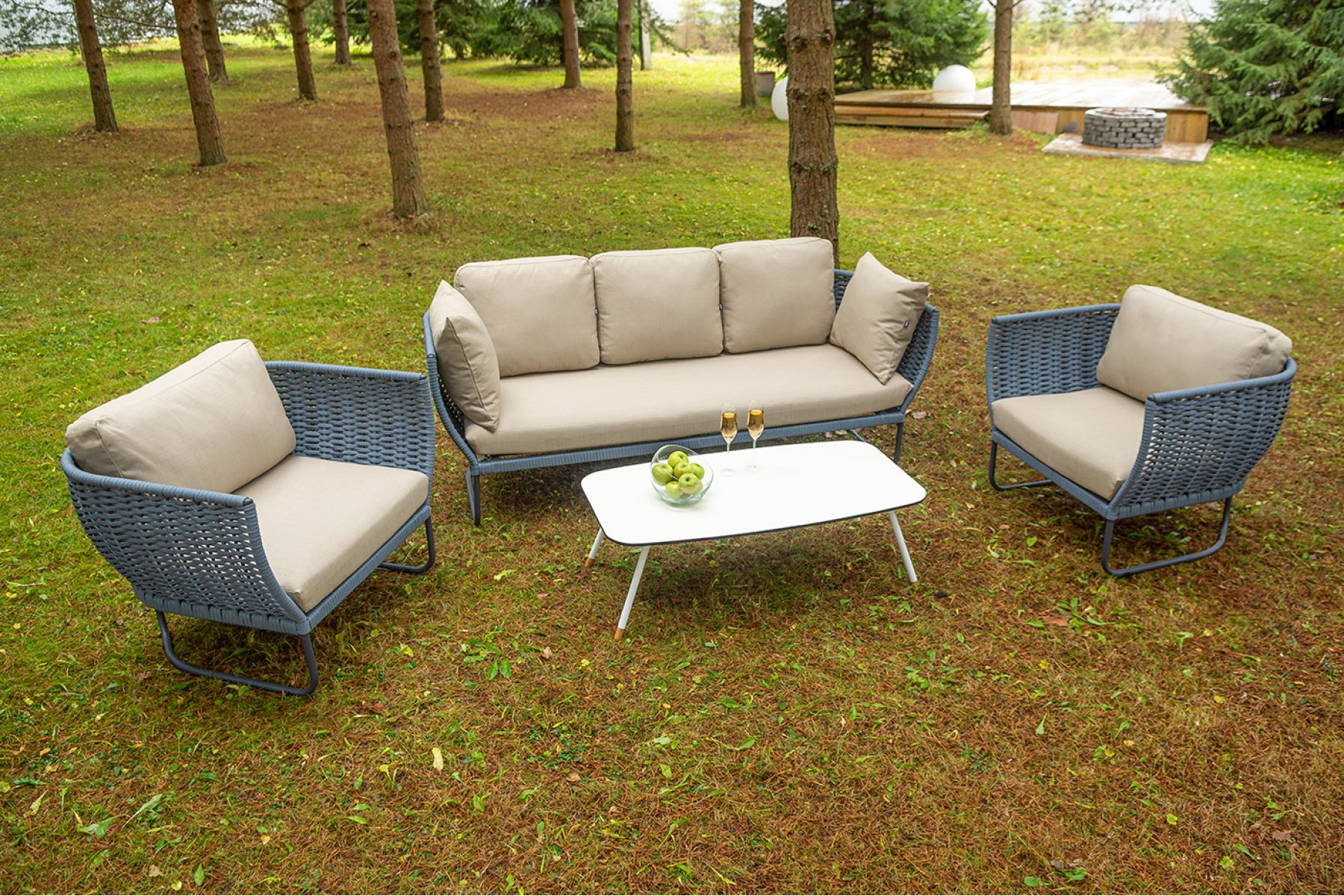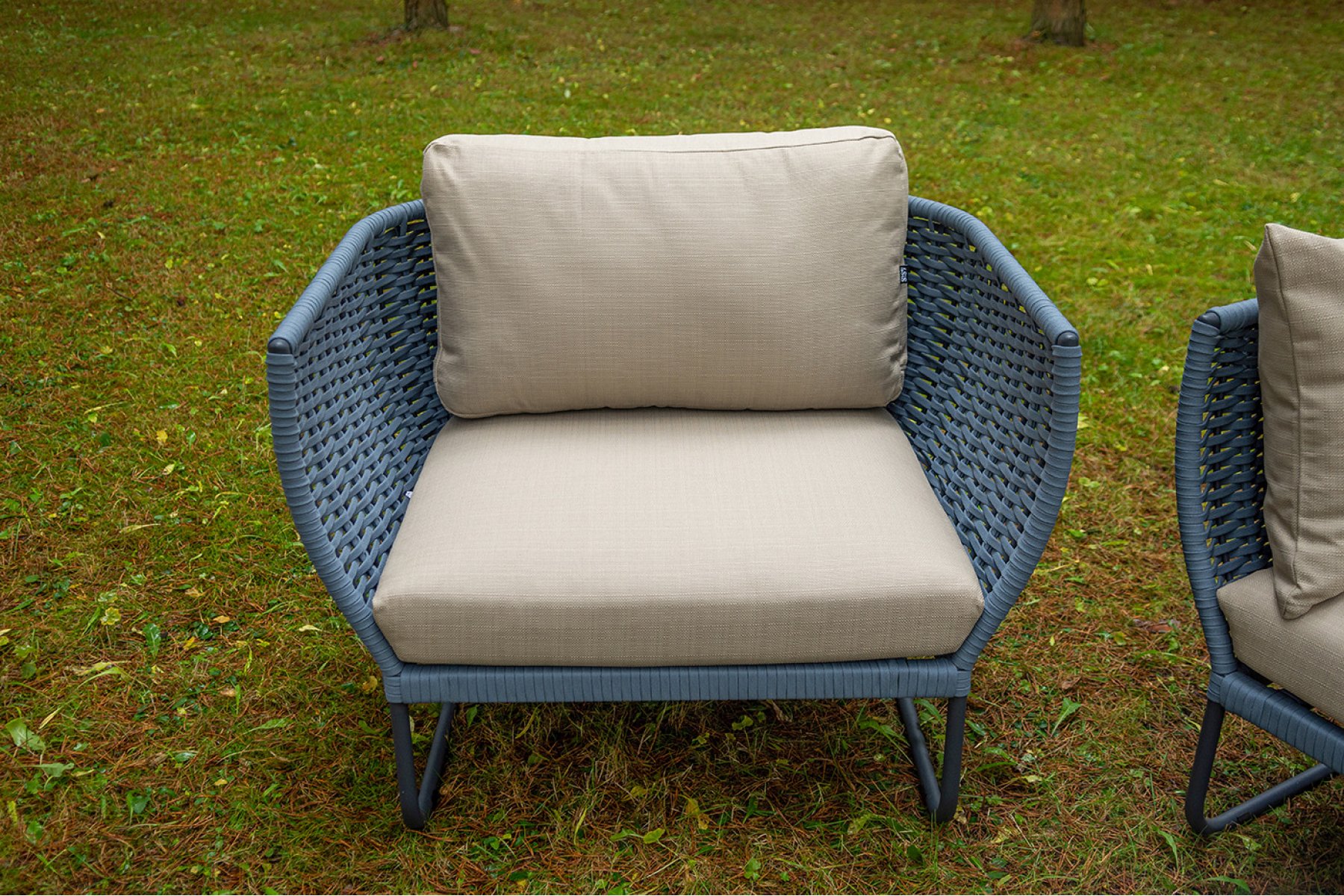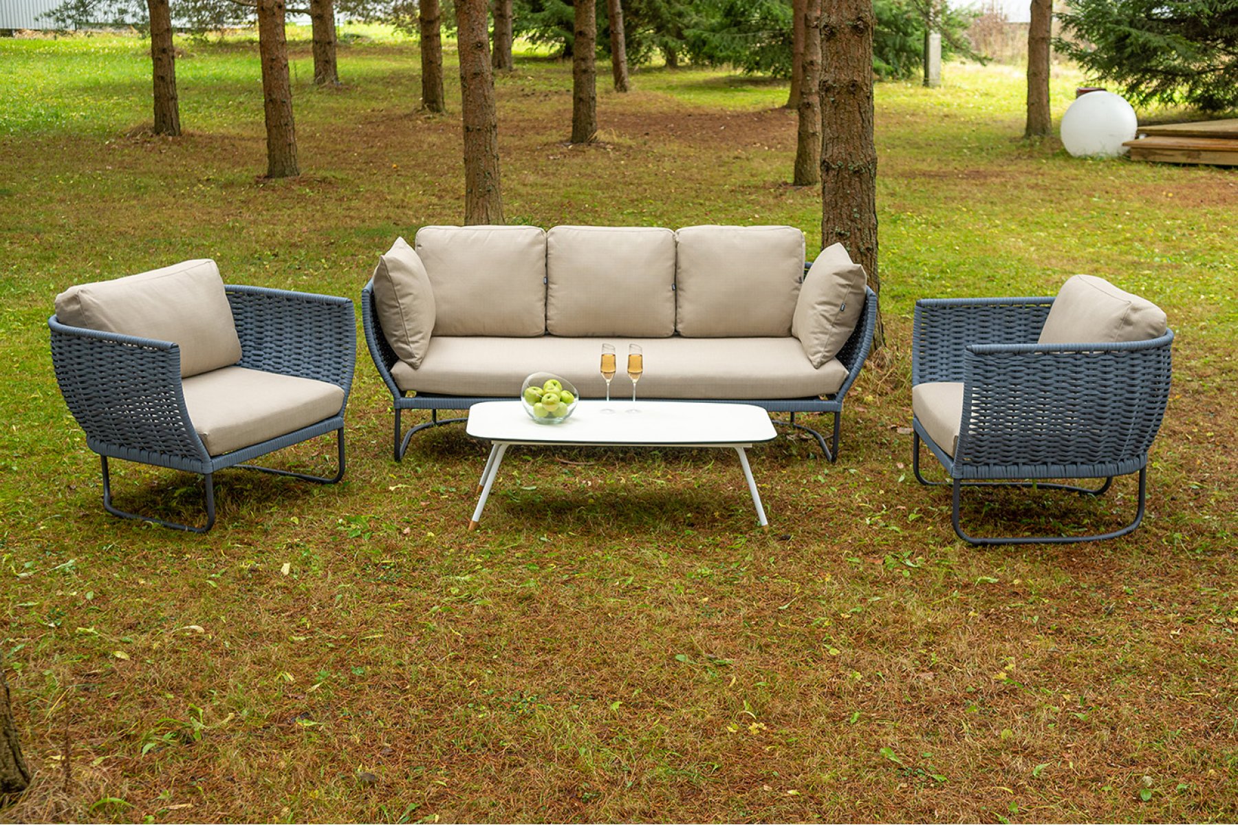 Боковины дивана и кресел вручную оплетены синими синте "Фиджи" диван 3-местный плетеный из роупа, каркас алюминий темно-серый (RAL7024) муар, роуп синий (KT18-0014) 15 мм tex, ткань Mossle бежевая 11шт. 2 140Х900Х790, "Фиджи" кресло плетеное из роупа, каркас алюминий темно-серый (RAL7024) муар, роуп синий (KT18-0014) 15 мм tex, ткань Mossle бежевая 2шт. 1 070Х920Х610, "Диего" журнальный стол из HPL 120х60 H40, каркас белый муар, цвет "молочный" 1шт. 1 200Х600Х400,
