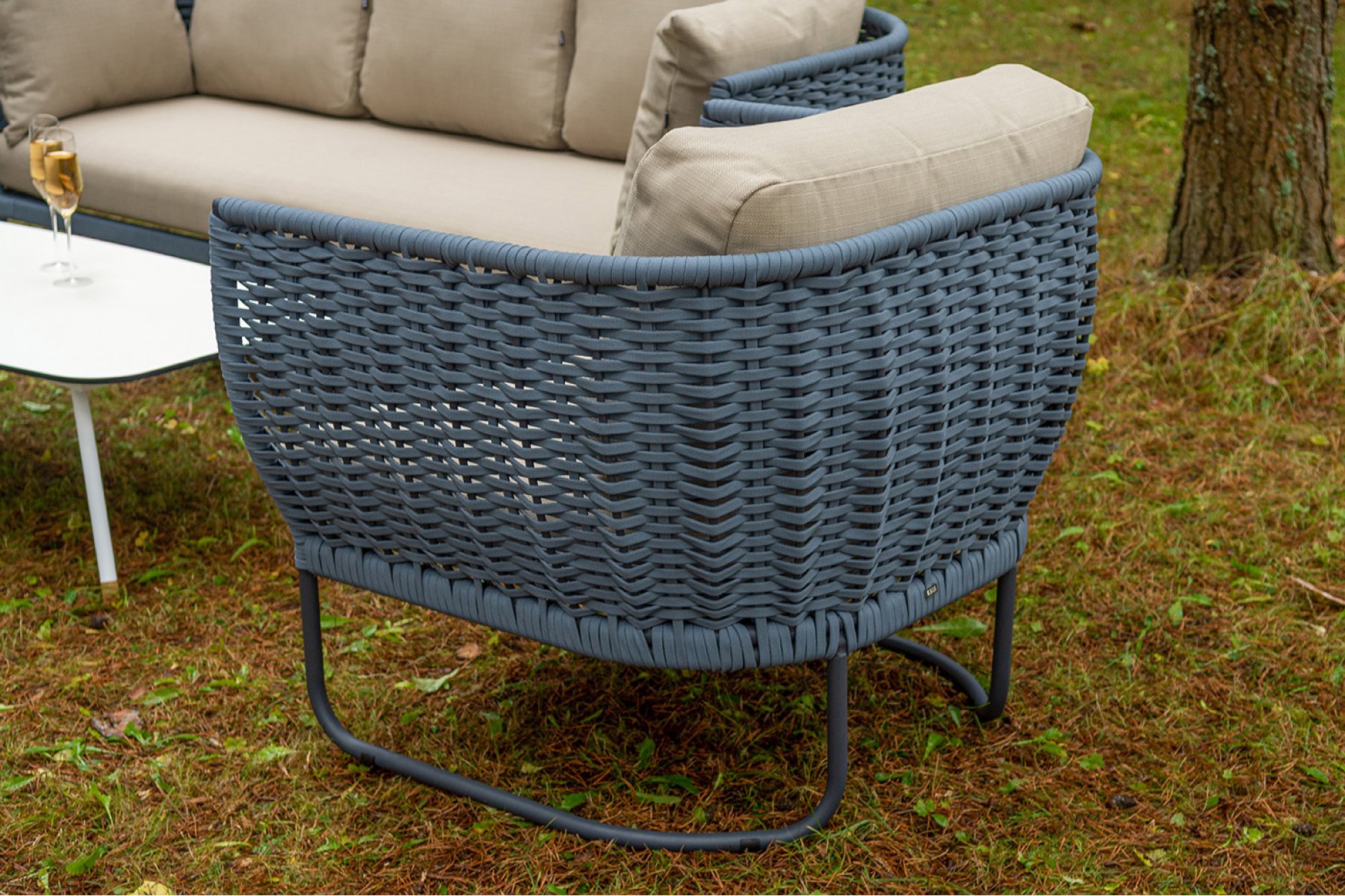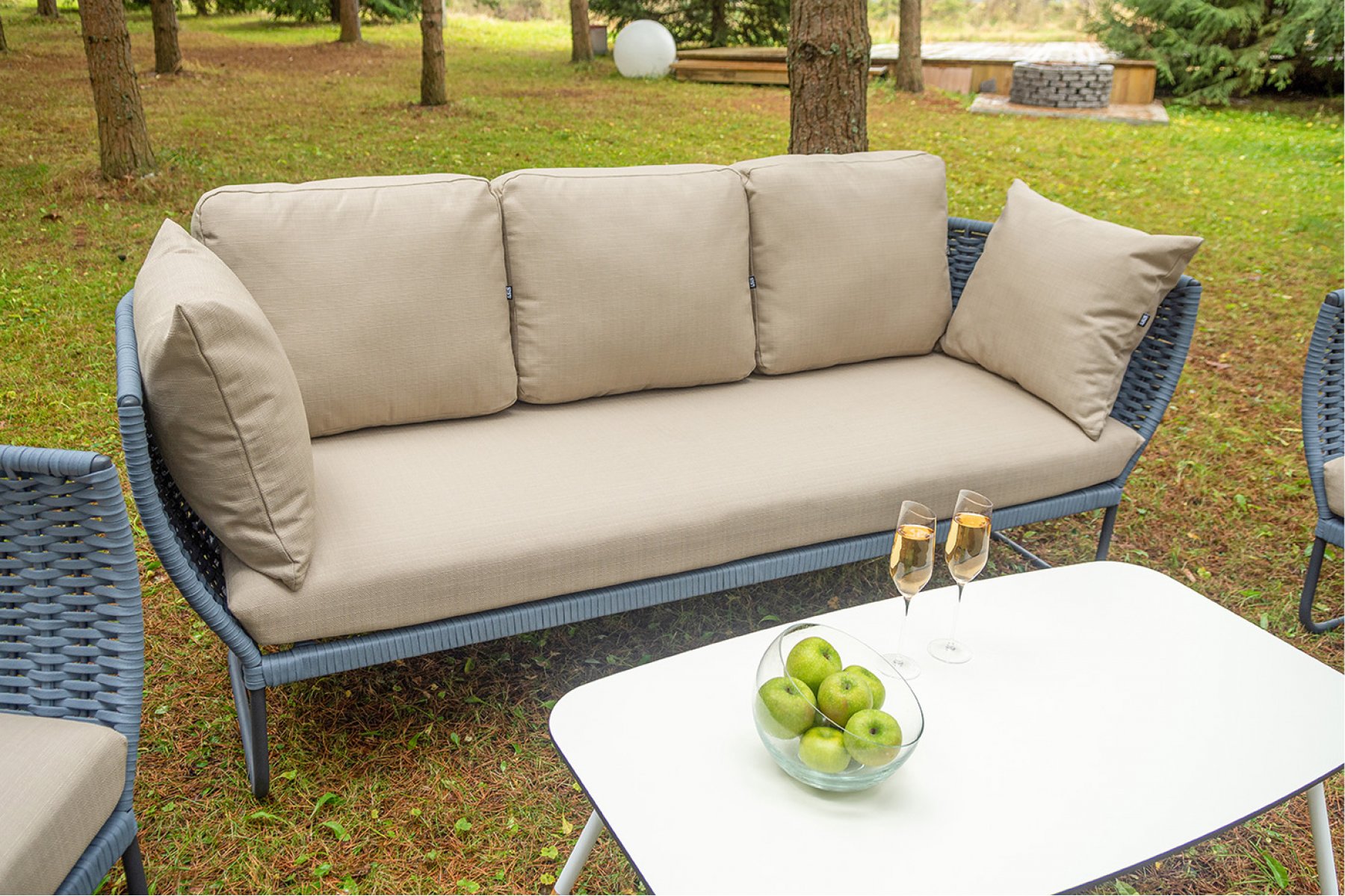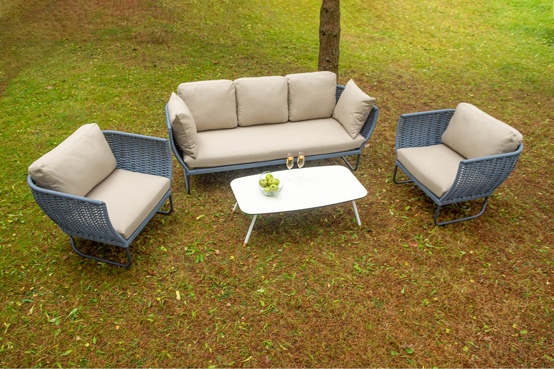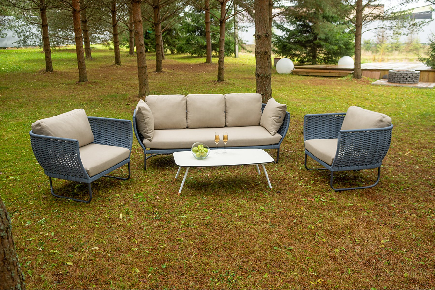 Боковины дивана и кресел вручную оплетены синими синте "Фиджи" диван 3-местный плетеный из роупа, каркас алюминий темно-серый (RAL7024) муар, роуп синий (KT18-0014) 15 мм tex, ткань Mossle бежевая 11шт. 2 140Х900Х790, "Фиджи" кресло плетеное из роупа, каркас алюминий темно-серый (RAL7024) муар, роуп синий (KT18-0014) 15 мм tex, ткань Mossle бежевая 2шт. 1 070Х920Х610, "Диего" журнальный стол из HPL 120х60 H40, каркас белый муар, цвет "молочный" 1шт. 1 200Х600Х400,