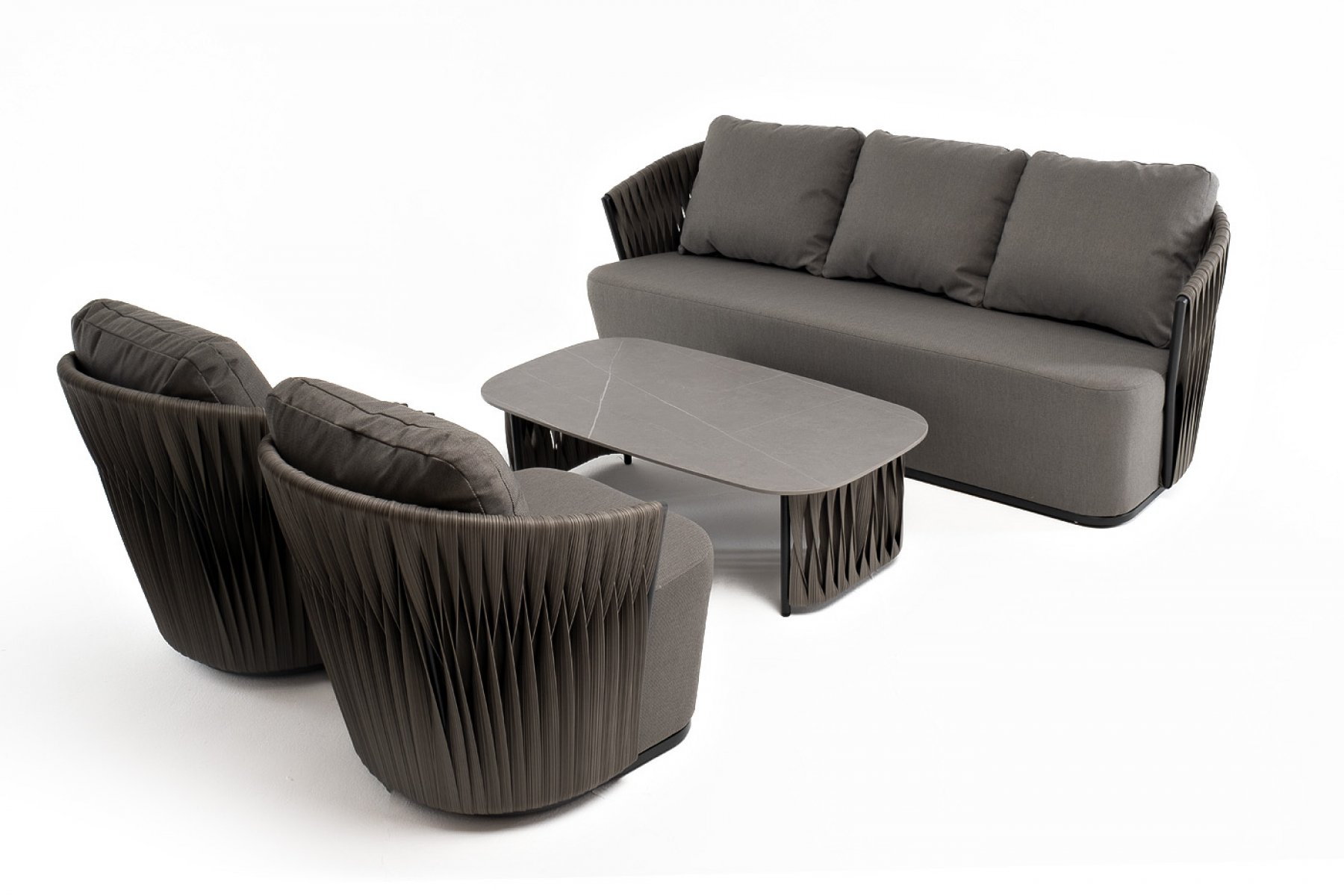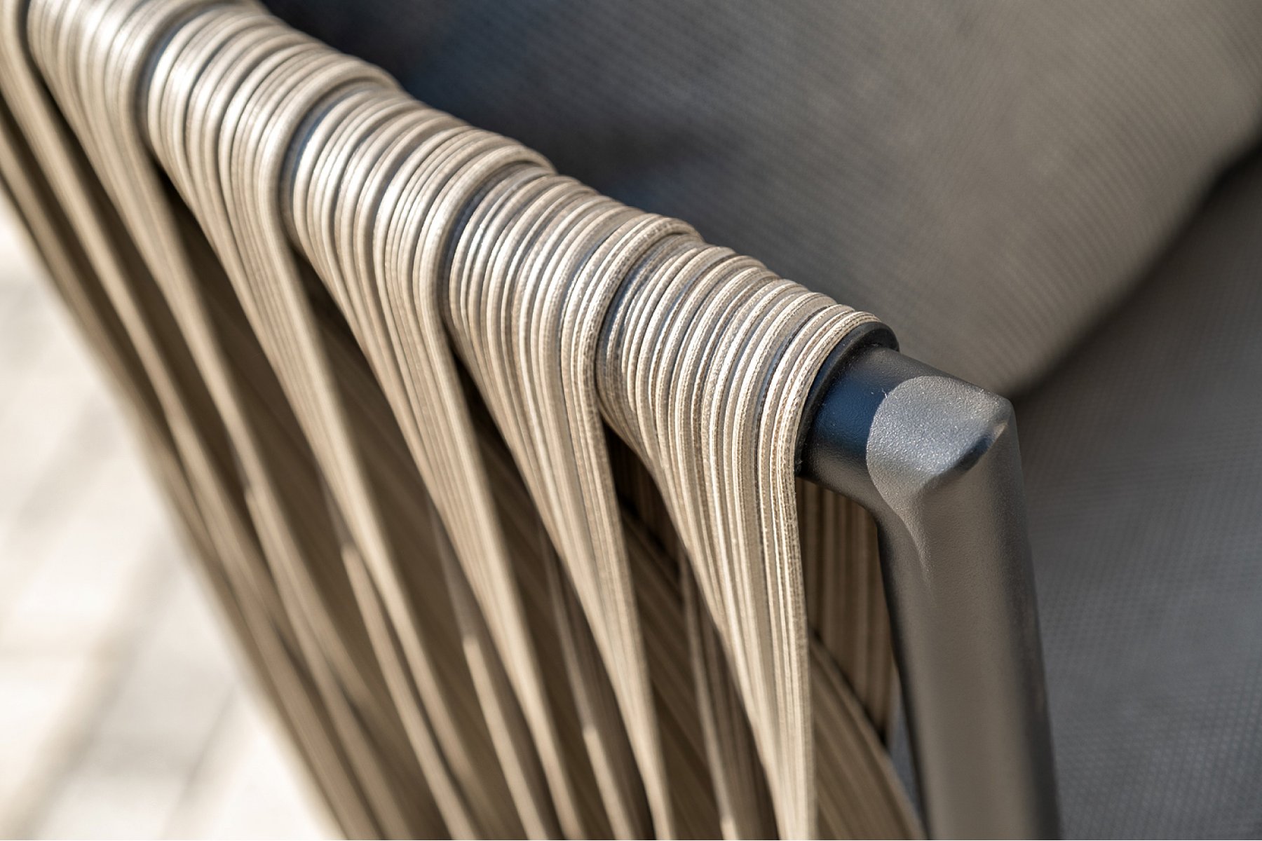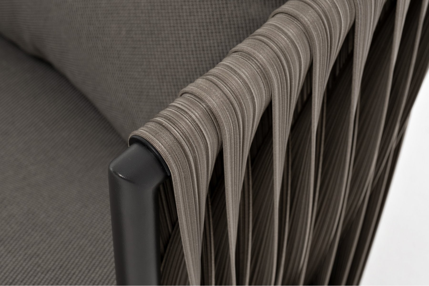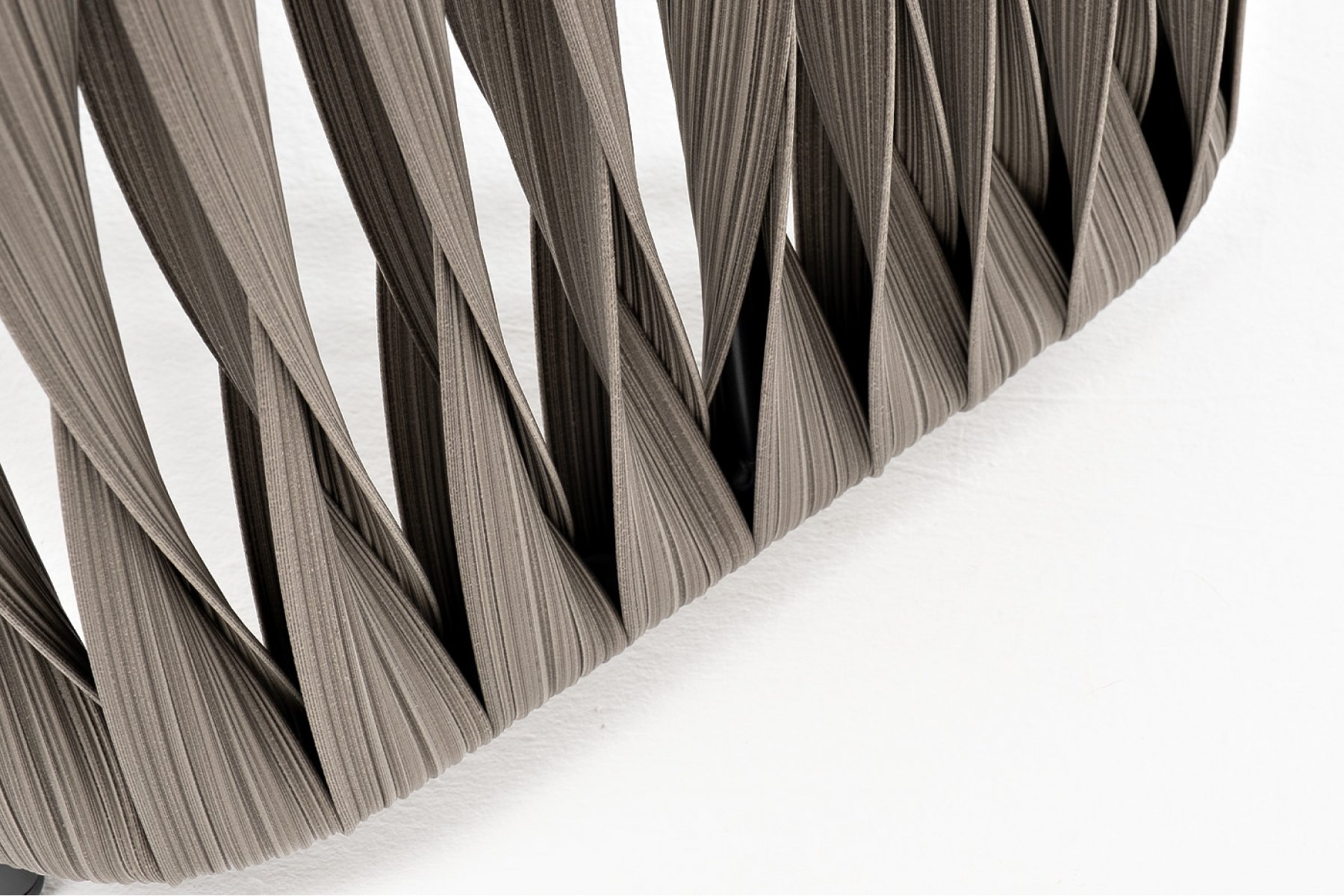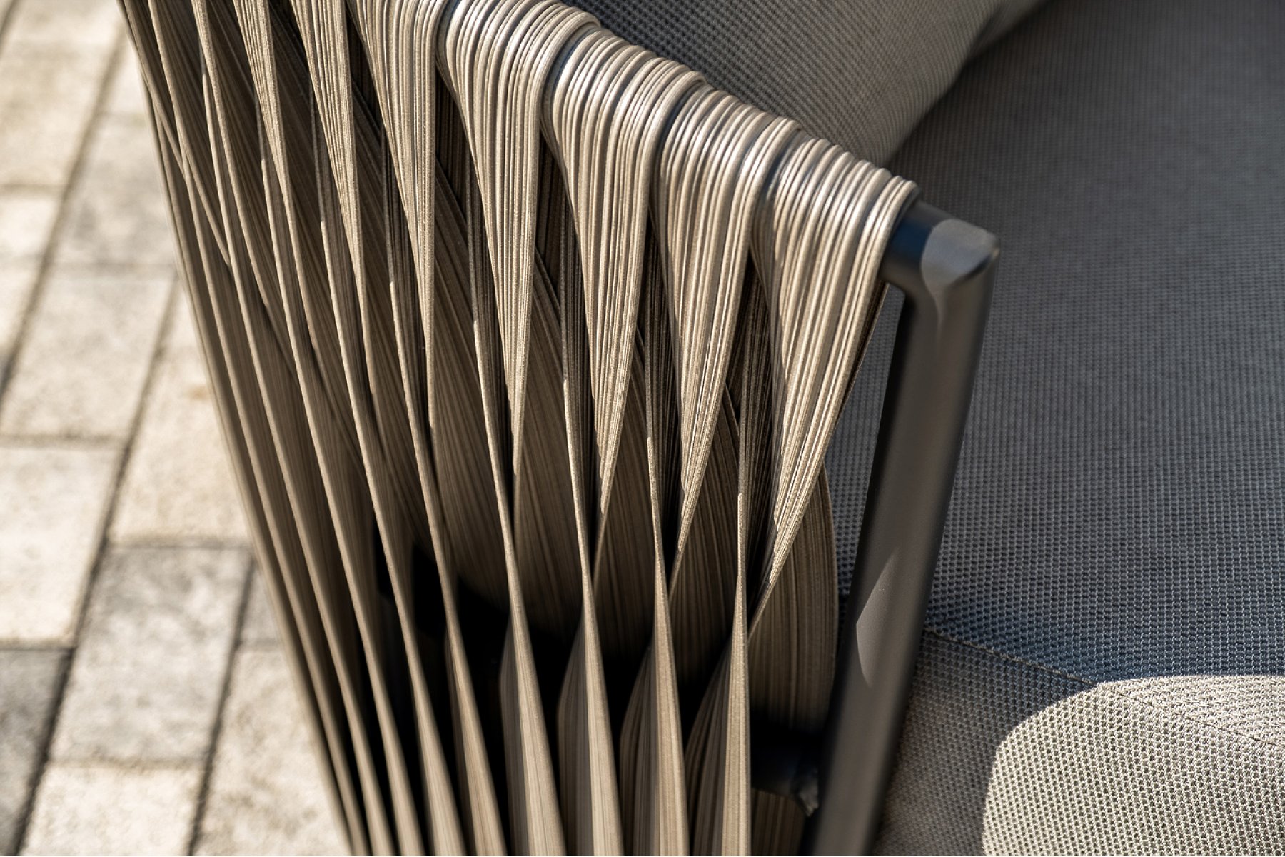 Из алюминия сделан устойчивый каркас мебели. Ее поверхность дополнена искусственным ротангом, из которого сделано ручное плетение - 50×3 мм, цвет графит.