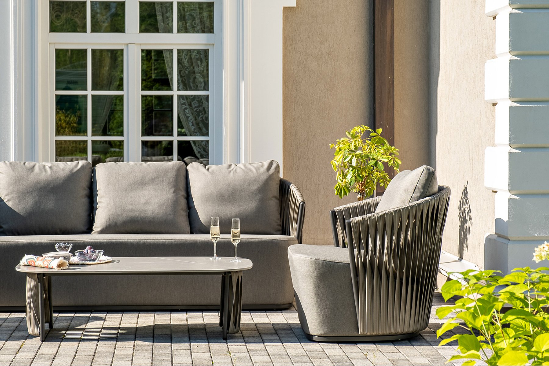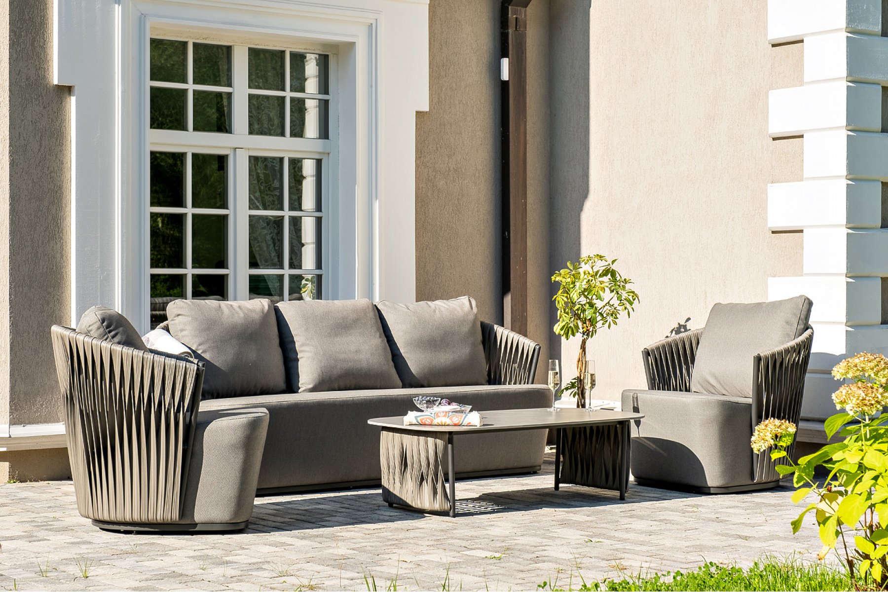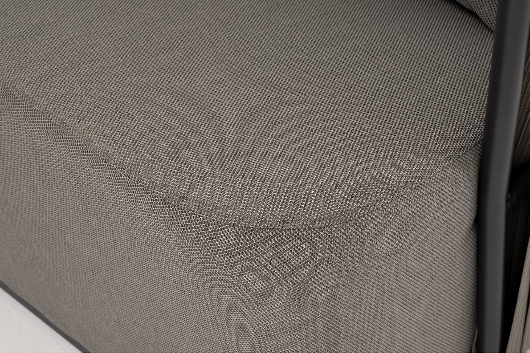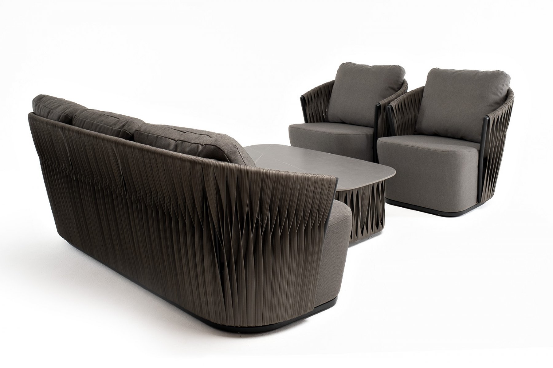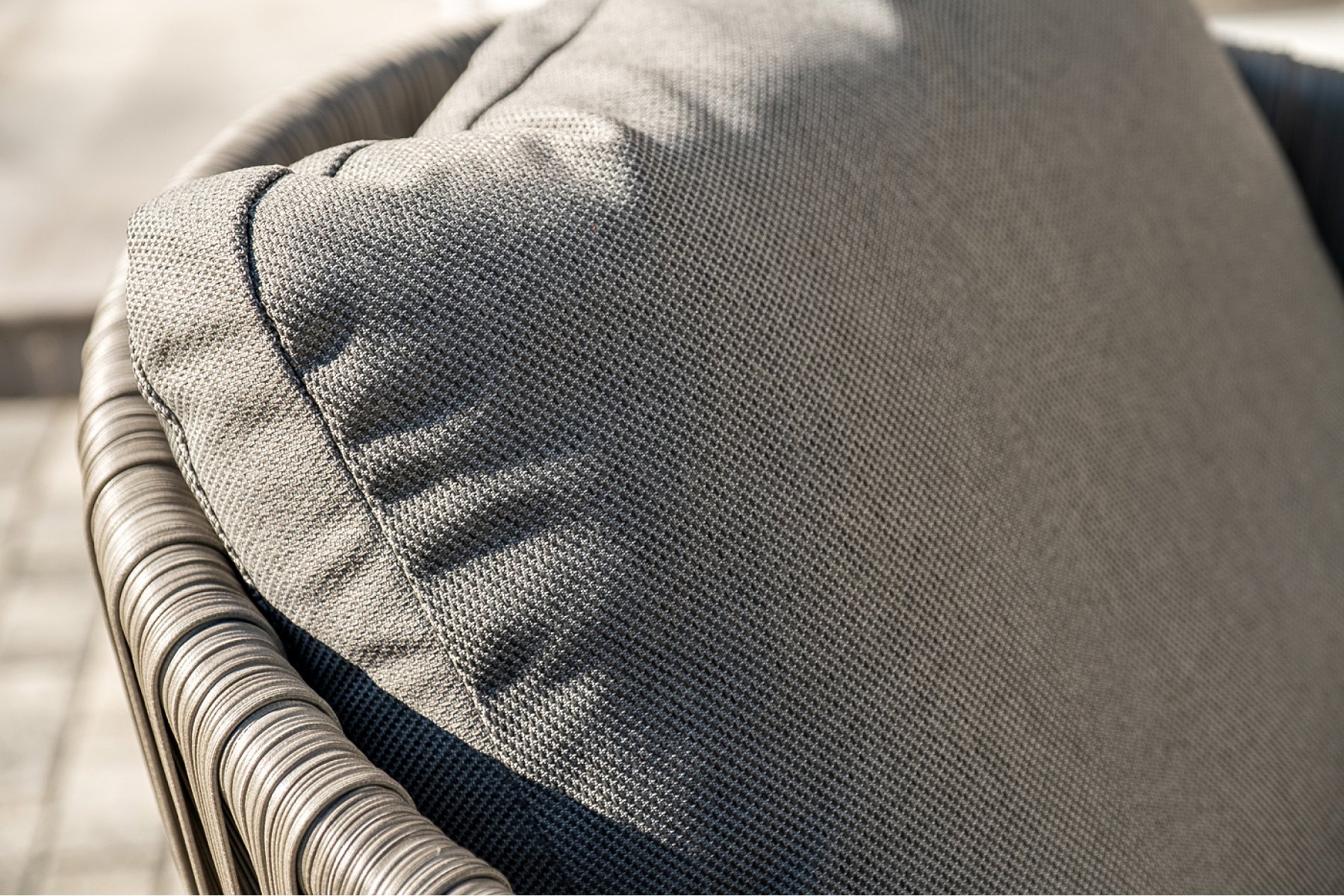 Из алюминия сделан устойчивый каркас мебели. Ее поверхность дополнена искусственным ротангом, из которого сделано ручное плетение - 50×3 мм, цвет графит.