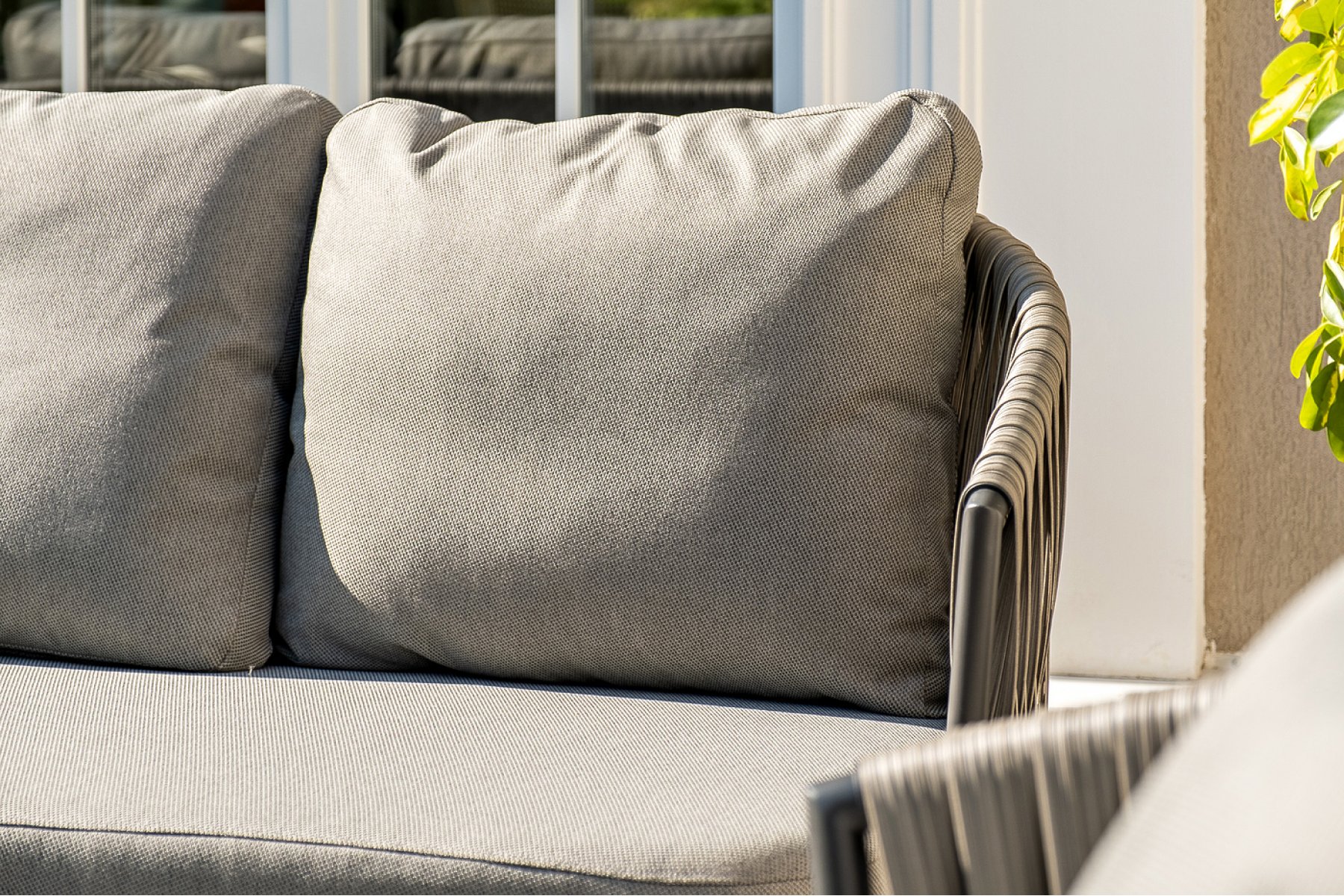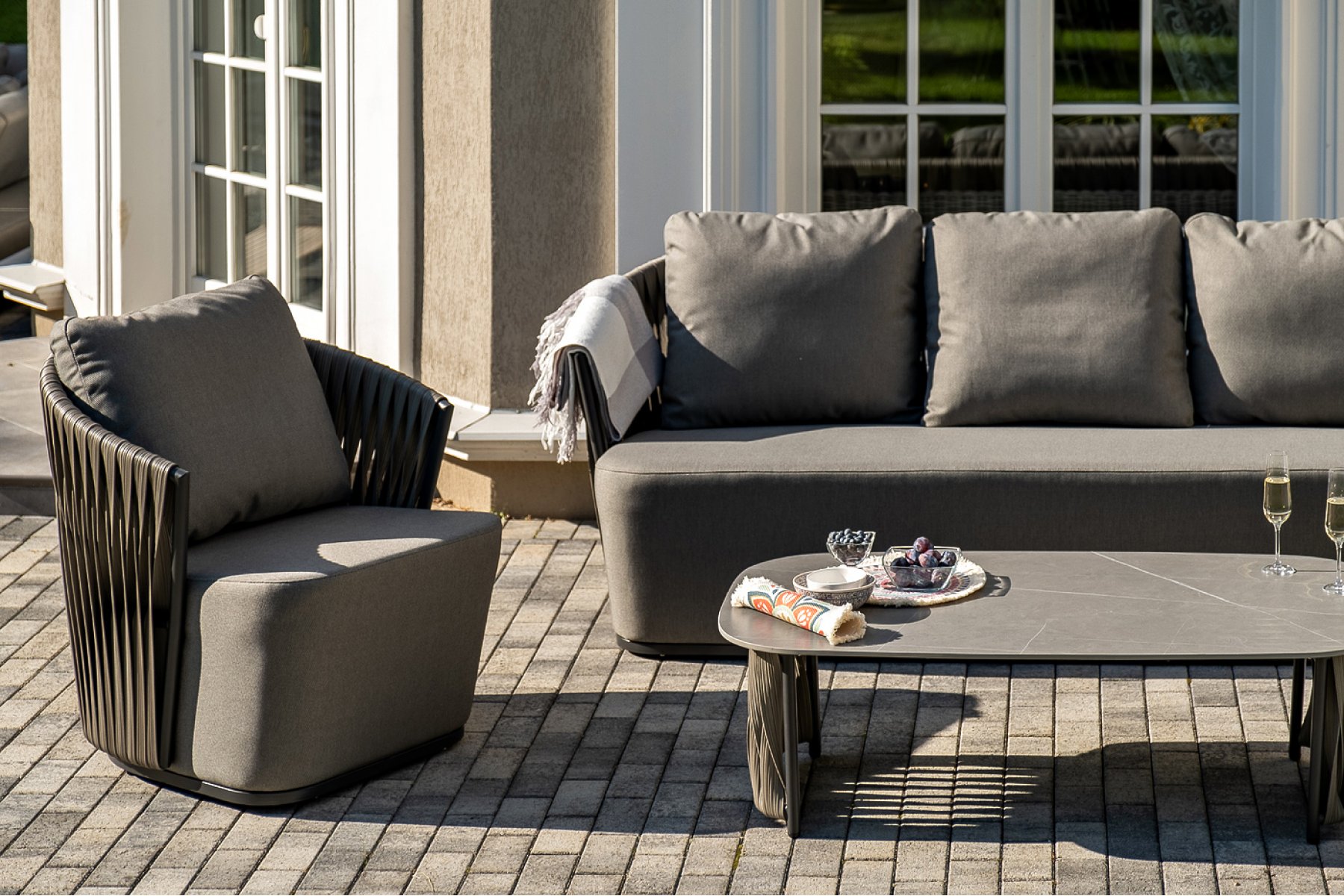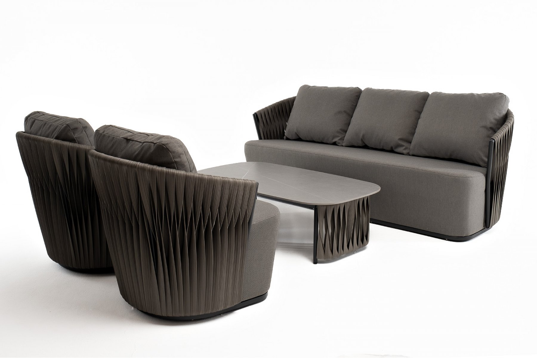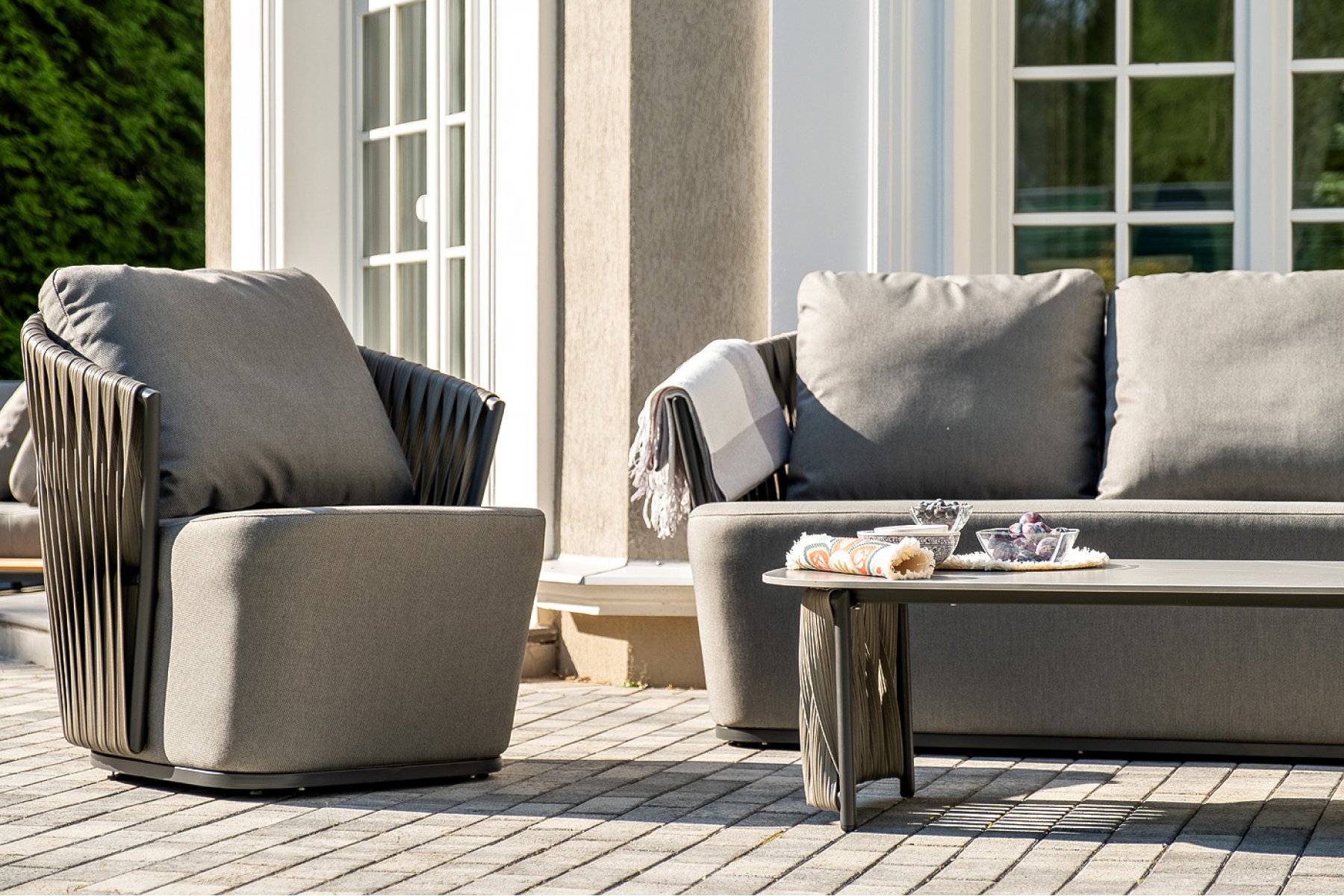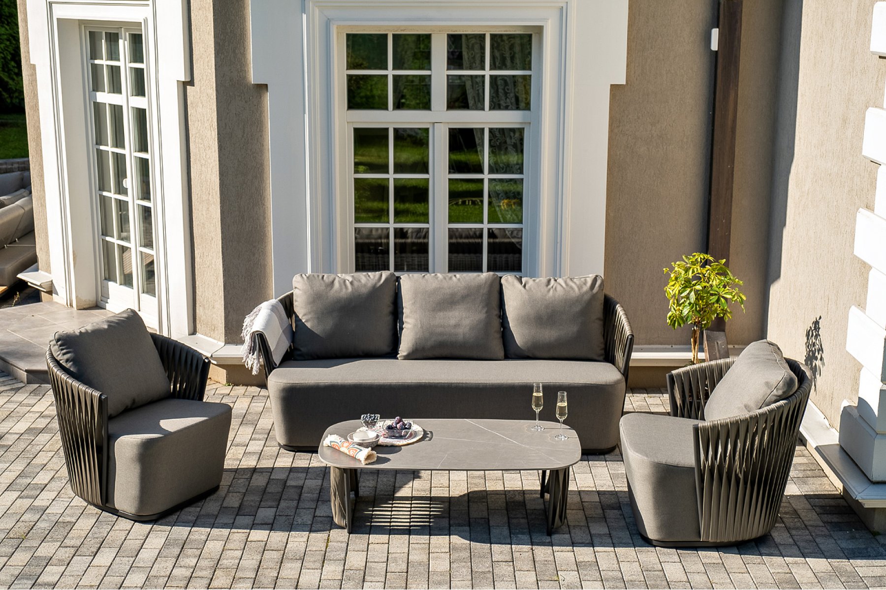 Из алюминия сделан устойчивый каркас мебели. Ее поверхность дополнена искусственным ротангом, из которого сделано ручное плетение - 50×3 мм, цвет графит.