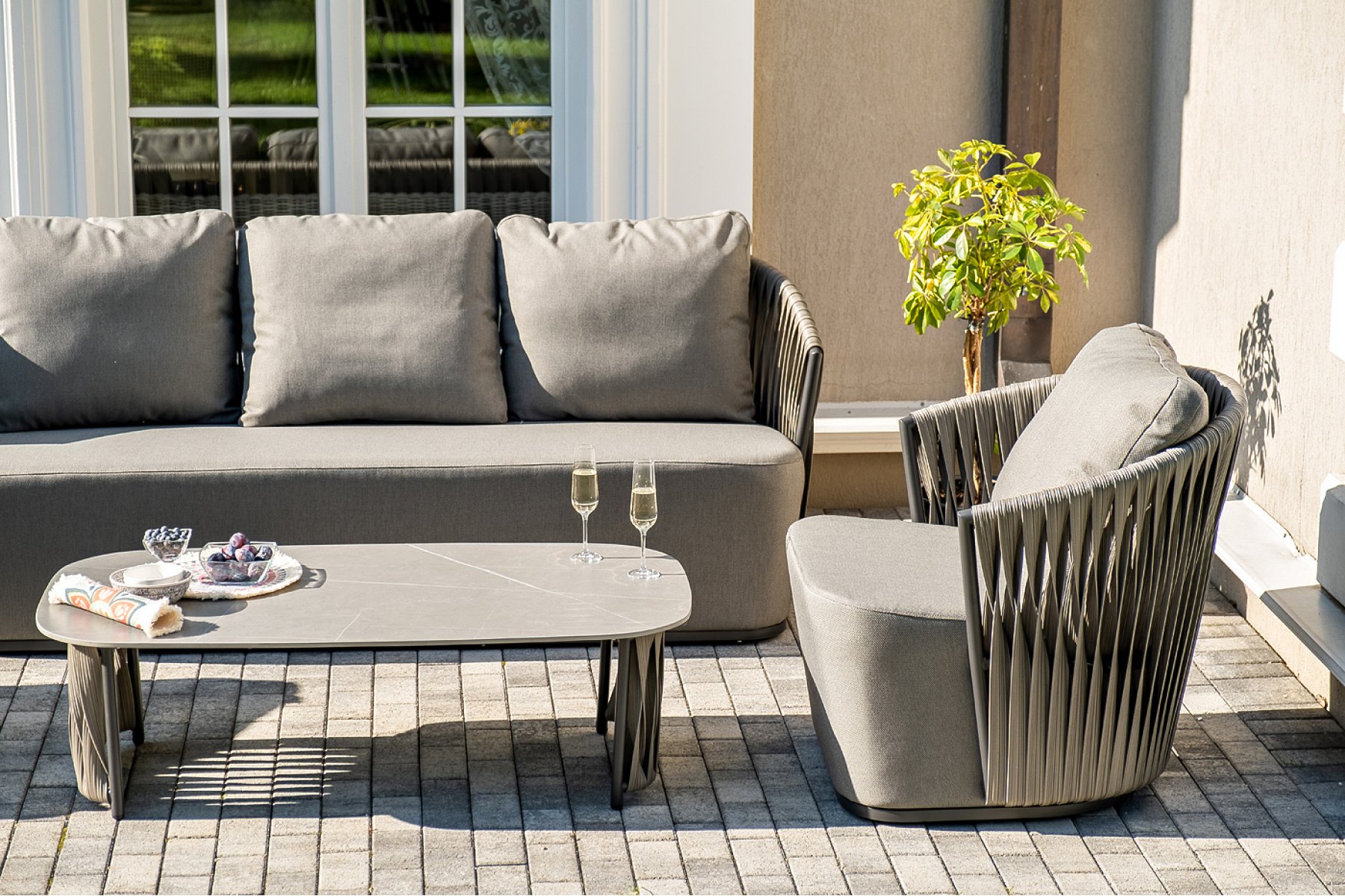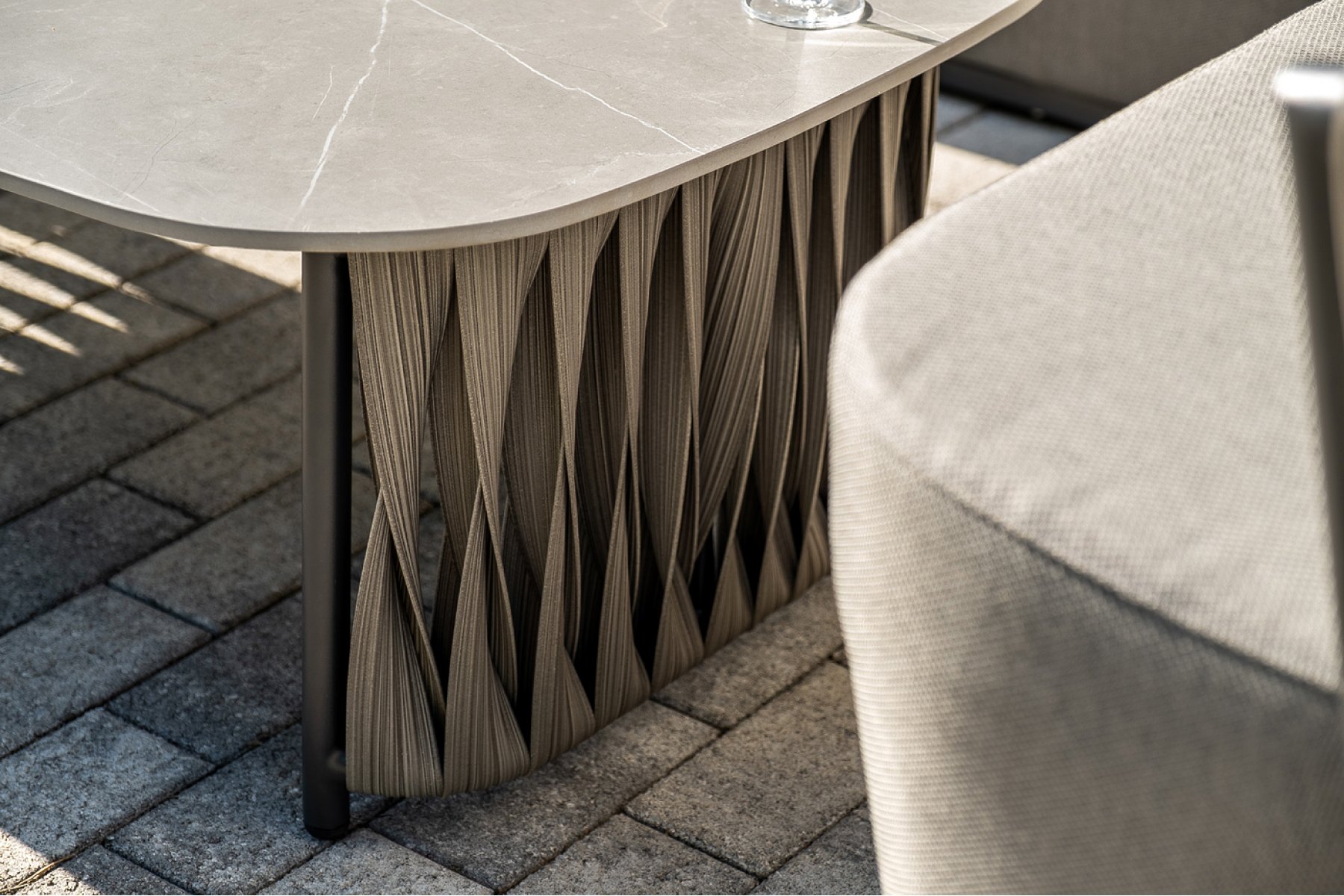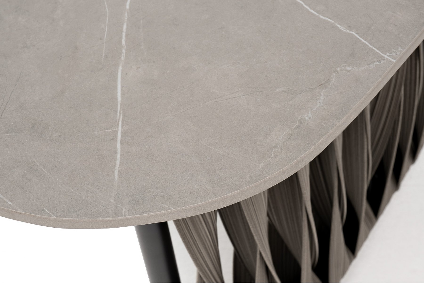 Журнальный столик выполнен из алюминия, окрашенного износостойкой краской графитового цвета. Столешница - овальная, выполнена из искусственного камня графитового цвета.