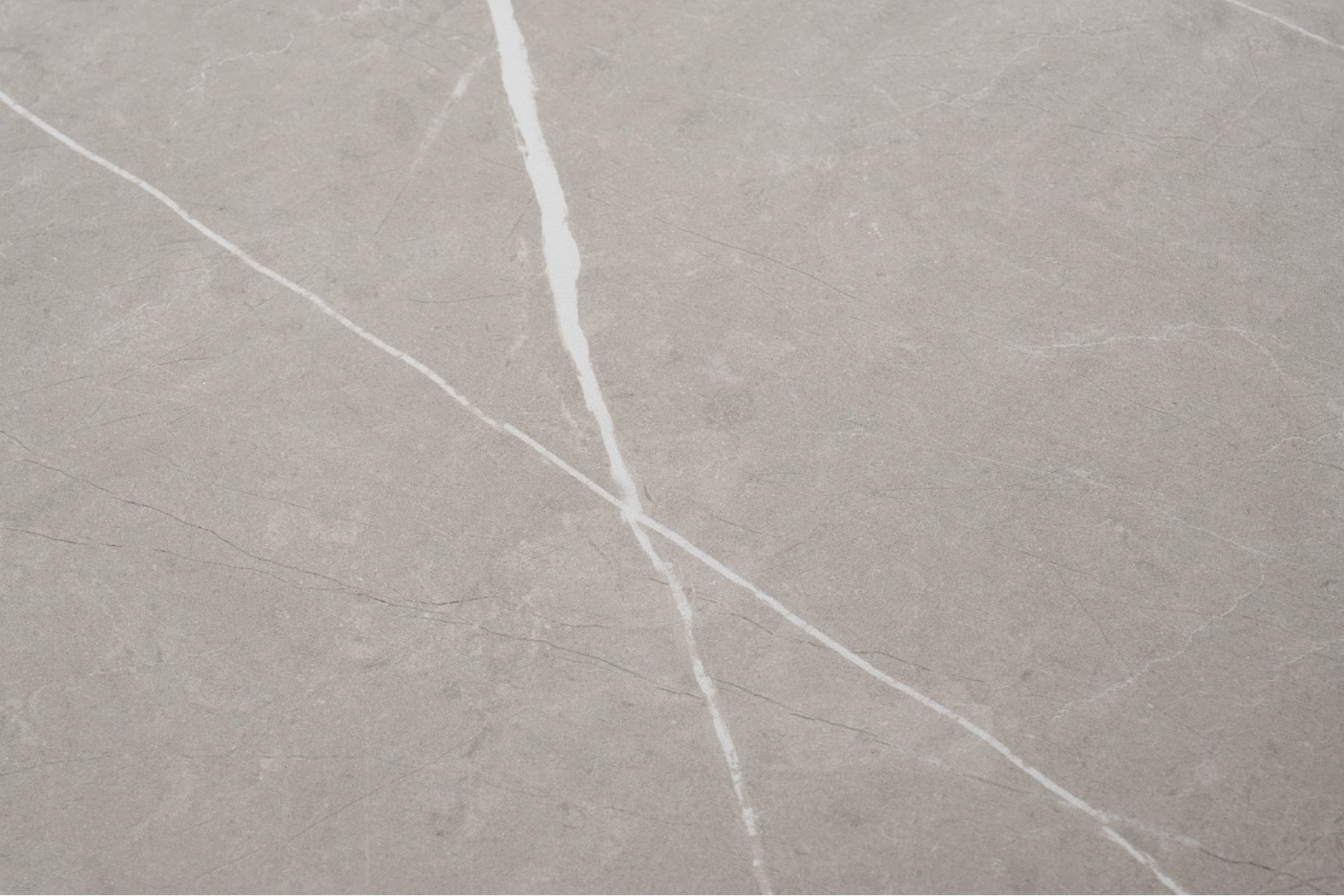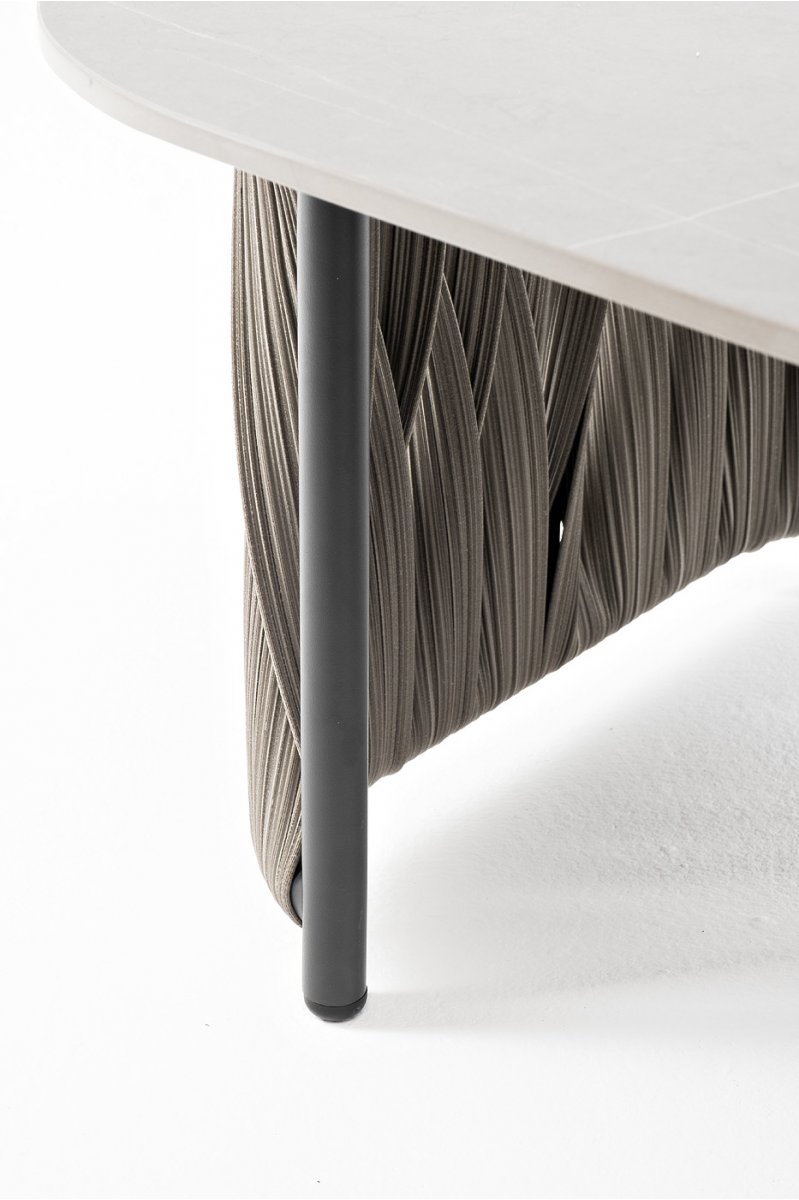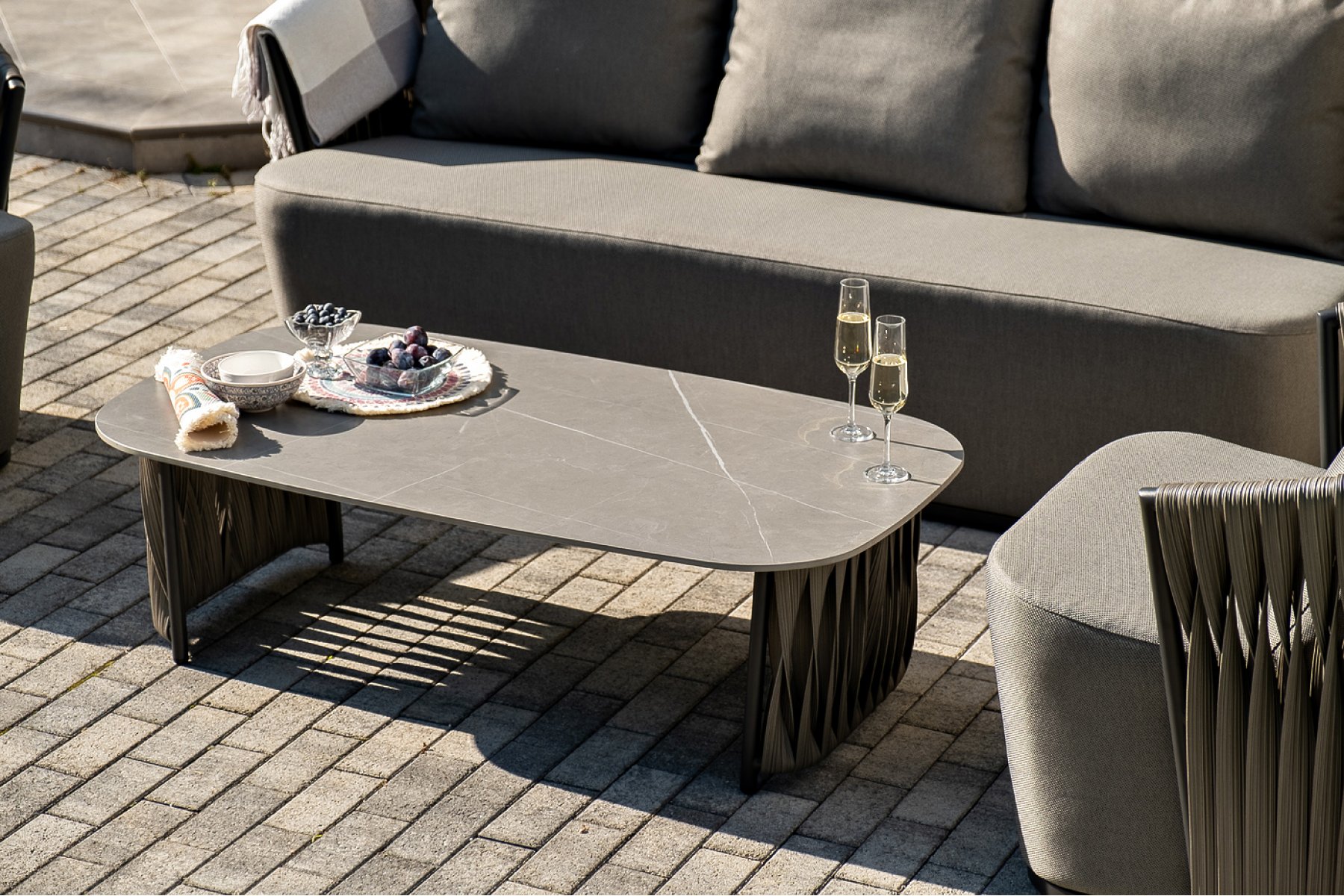 Журнальный столик выполнен из алюминия, окрашенного износостойкой краской графитового цвета. Столешница - овальная, выполнена из искусственного камня графитового цвета.