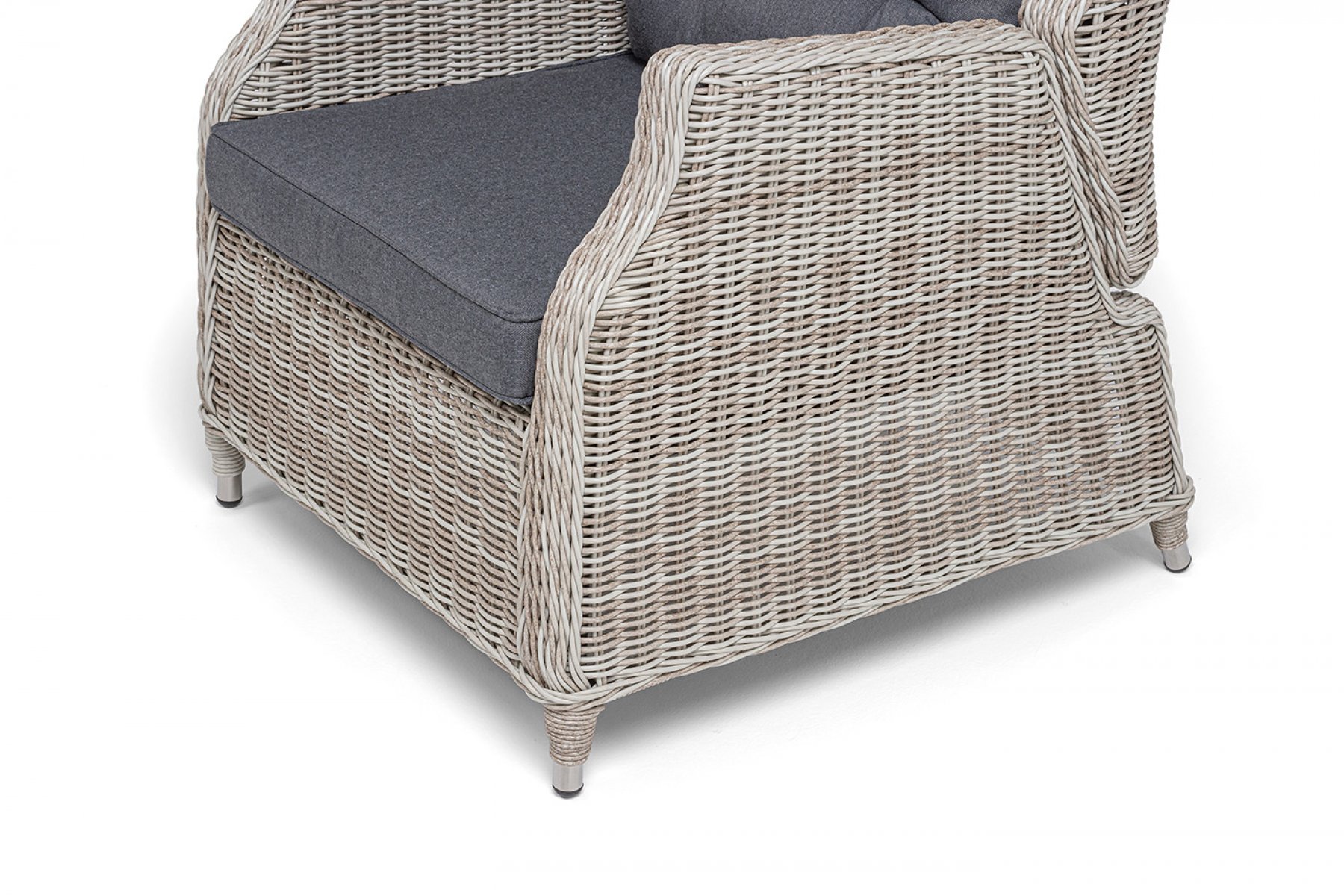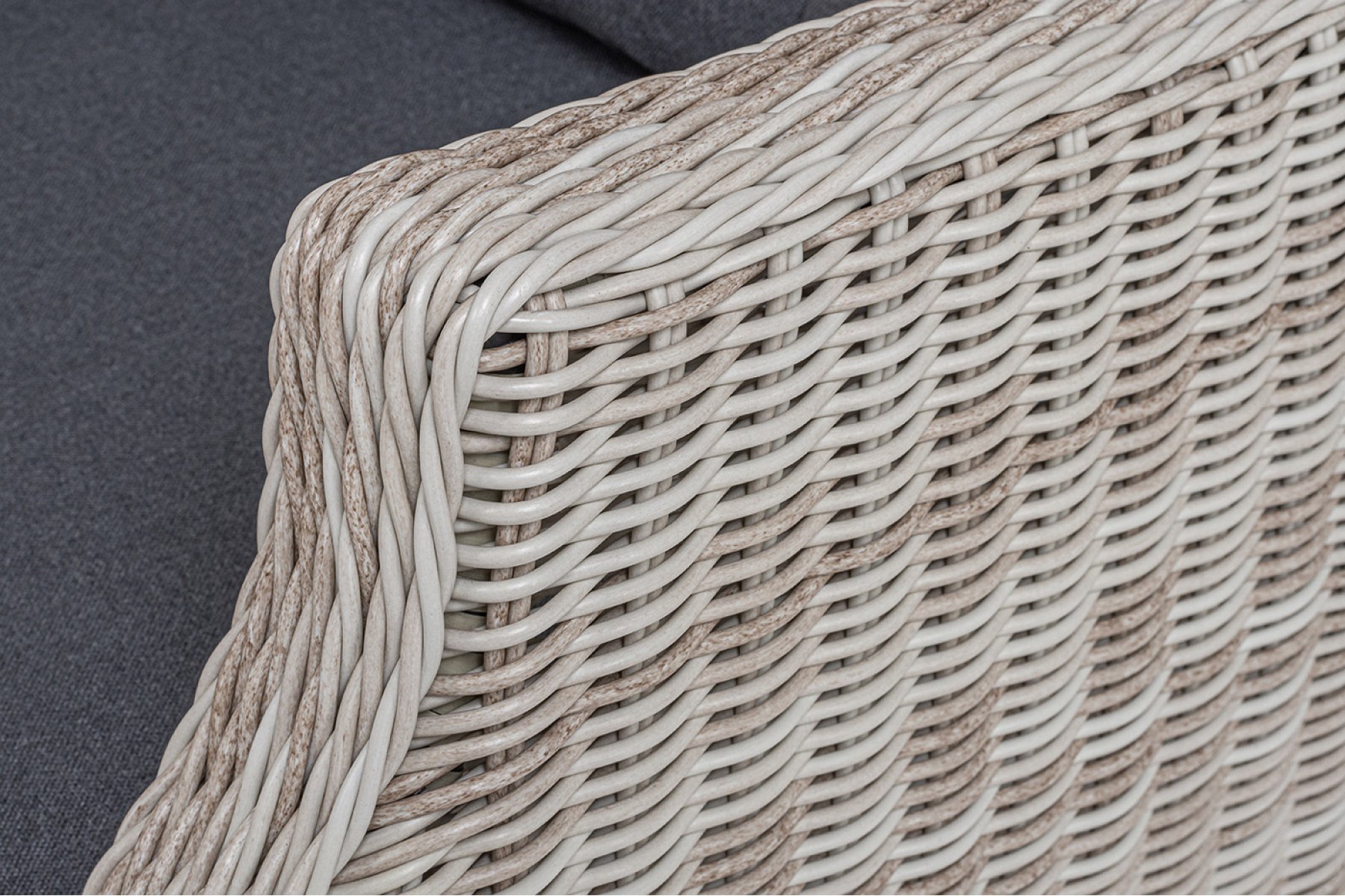В основе мебели находится алюминиевый каркас высокой прочности, который оплетен круглым искусственным ротангом. Представлена в натуральном бежевом оттенке.