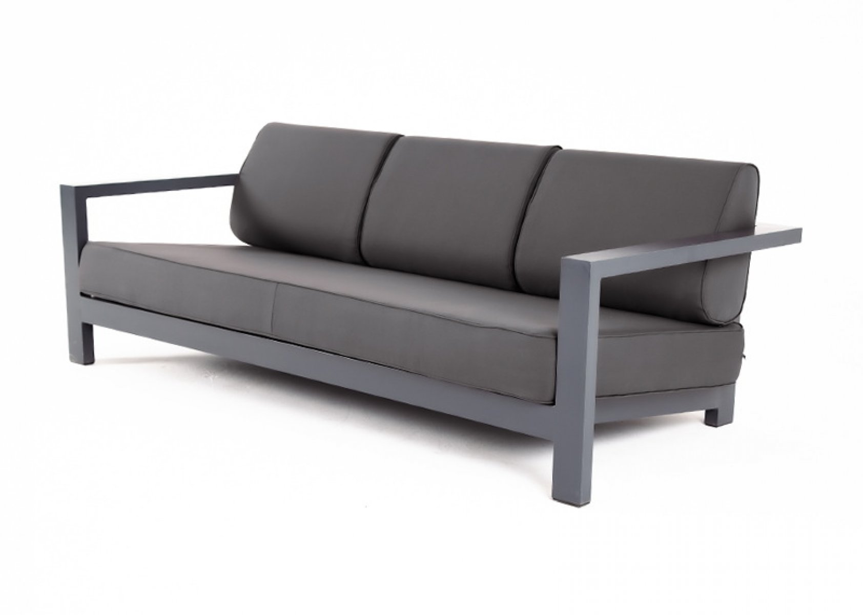 Стильный трехместный диван «Гранада» для обустройства зоны отдыха на балконе, в кафе или летней веранде. Каркас изготовлен из высокопрочного алюминия темно-серого цвета.