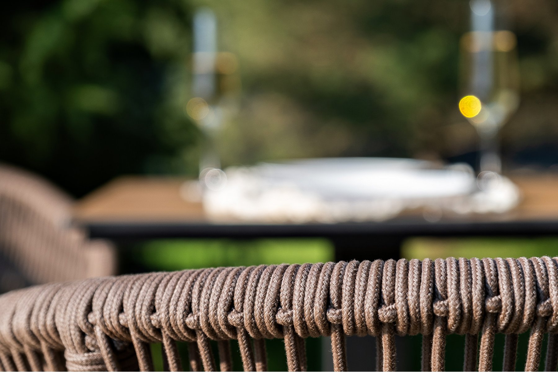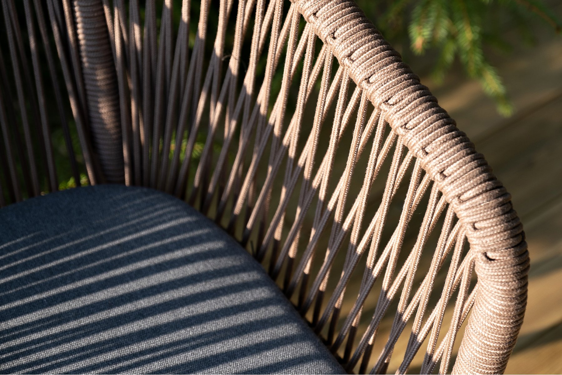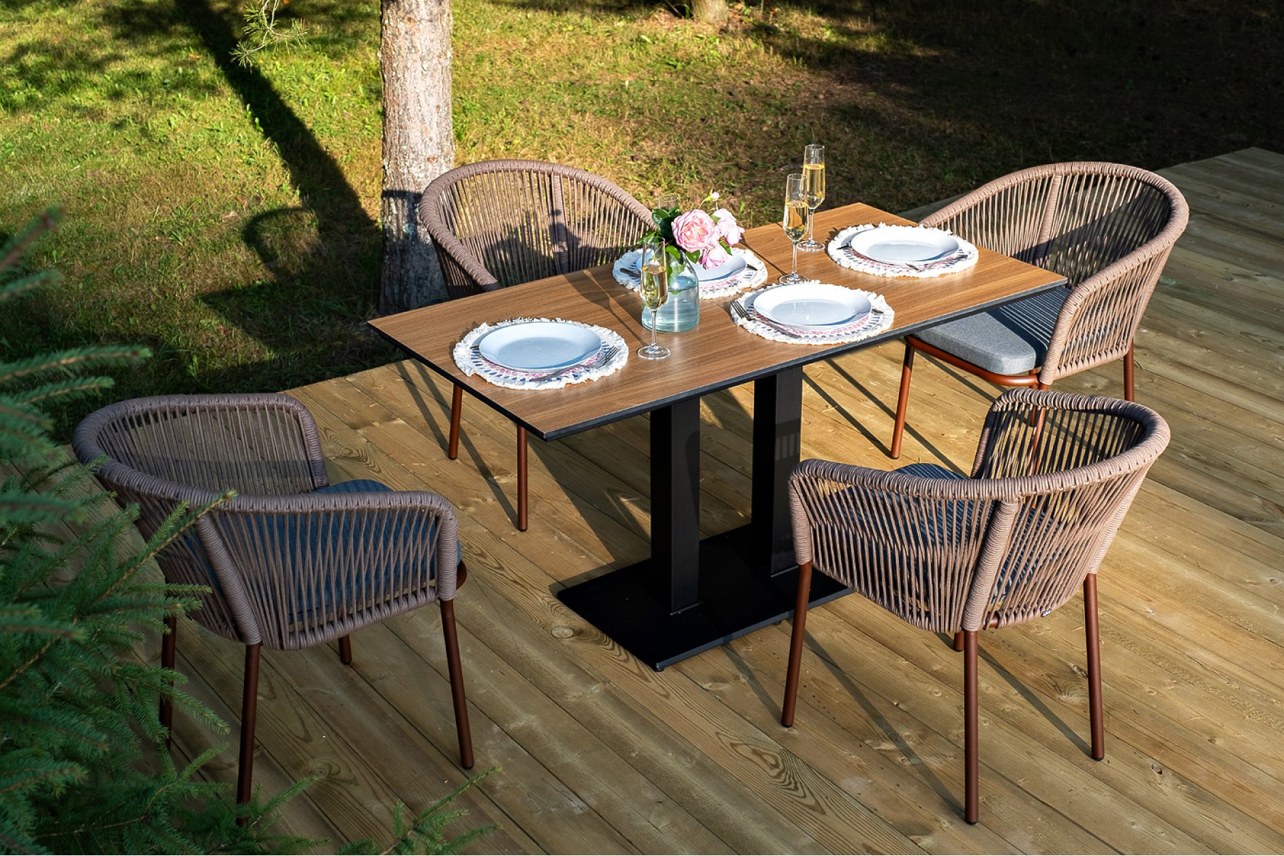 4 кор. (стулья - "Каффе" обеденный стол из HPL 140х70см, цвет "дуб", подстолье двойное черное 1шт. 1 400Х700Х750, "Марсель" стул плетеный из роупа, каркас алюминий коричневый (RAL8016) муар, роуп коричневый круглый, ткань темно-серая 027 4шт. 570Х620Х775,