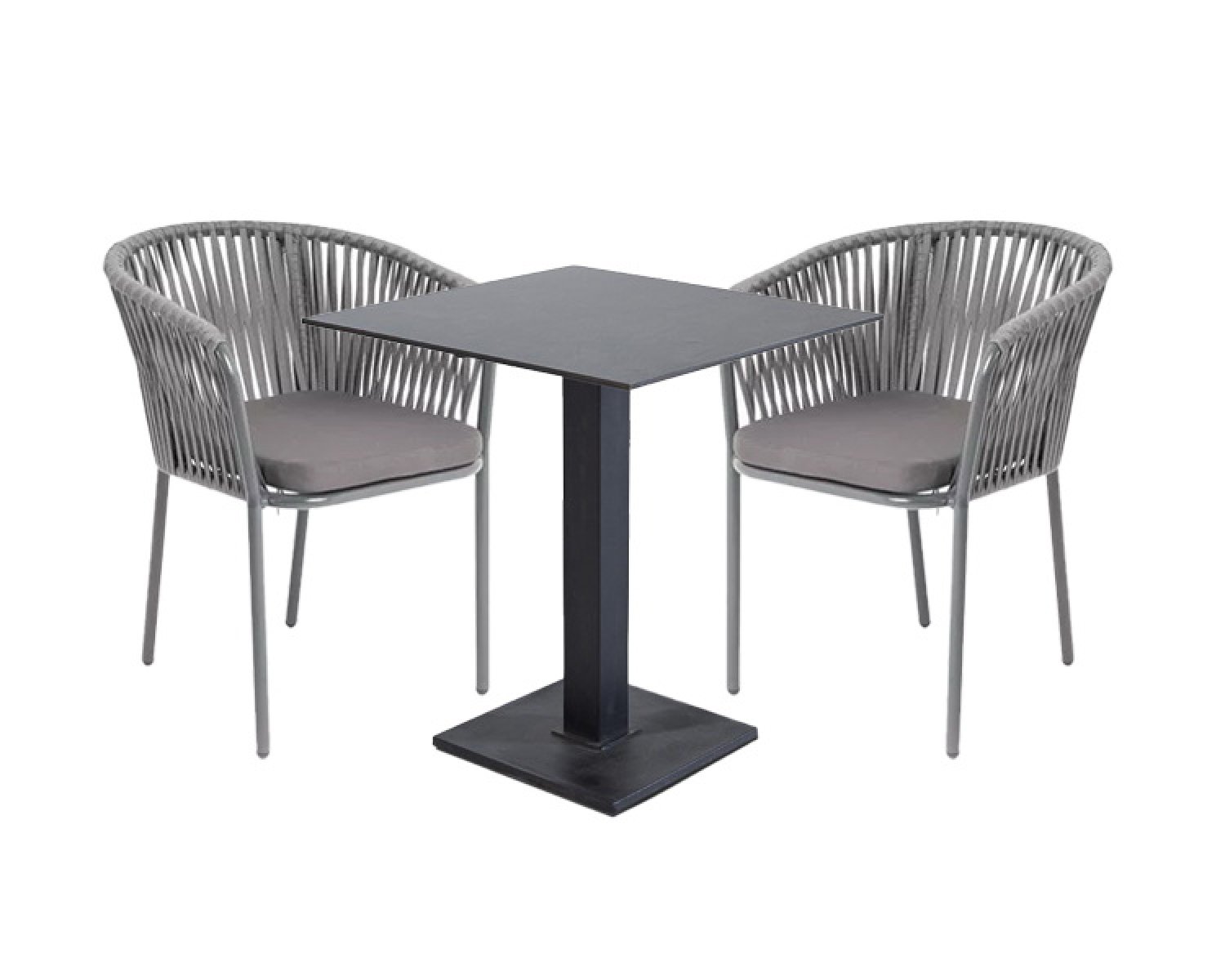 Габариты упа "Бордо" стул плетеный из роупа, каркас алюминий темно-серый (RAL7024) муар, роуп серый 15мм, ткань темно-серая 027 2шт. 570Х620Х775, "Каффе" стол из HPL квадратный 70х70см, цвет "серый гранит" 1шт. 700Х700Х750,